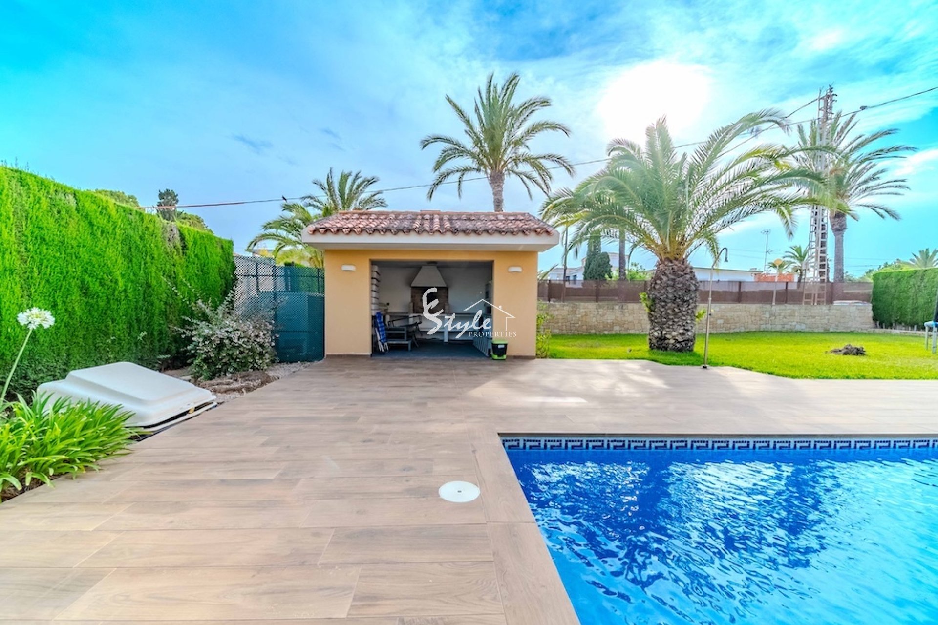El susurro de las palmeras, la brisa del mar, el aire fresco, el canto de los pájaros por la mañana y nada que perturbe la paz - todo esto se obtiene aquí en una villa en Cabo Roig. Además, la zona está bien desarrollada en infraestructura. Muy cerca se encuentran centros comerciales, campos de golf, karting, parque acuático, complejos deportivos. A poca distancia se encuentra una gran variedad de bares y restaurantes, supermercados, oficinas bancarias...