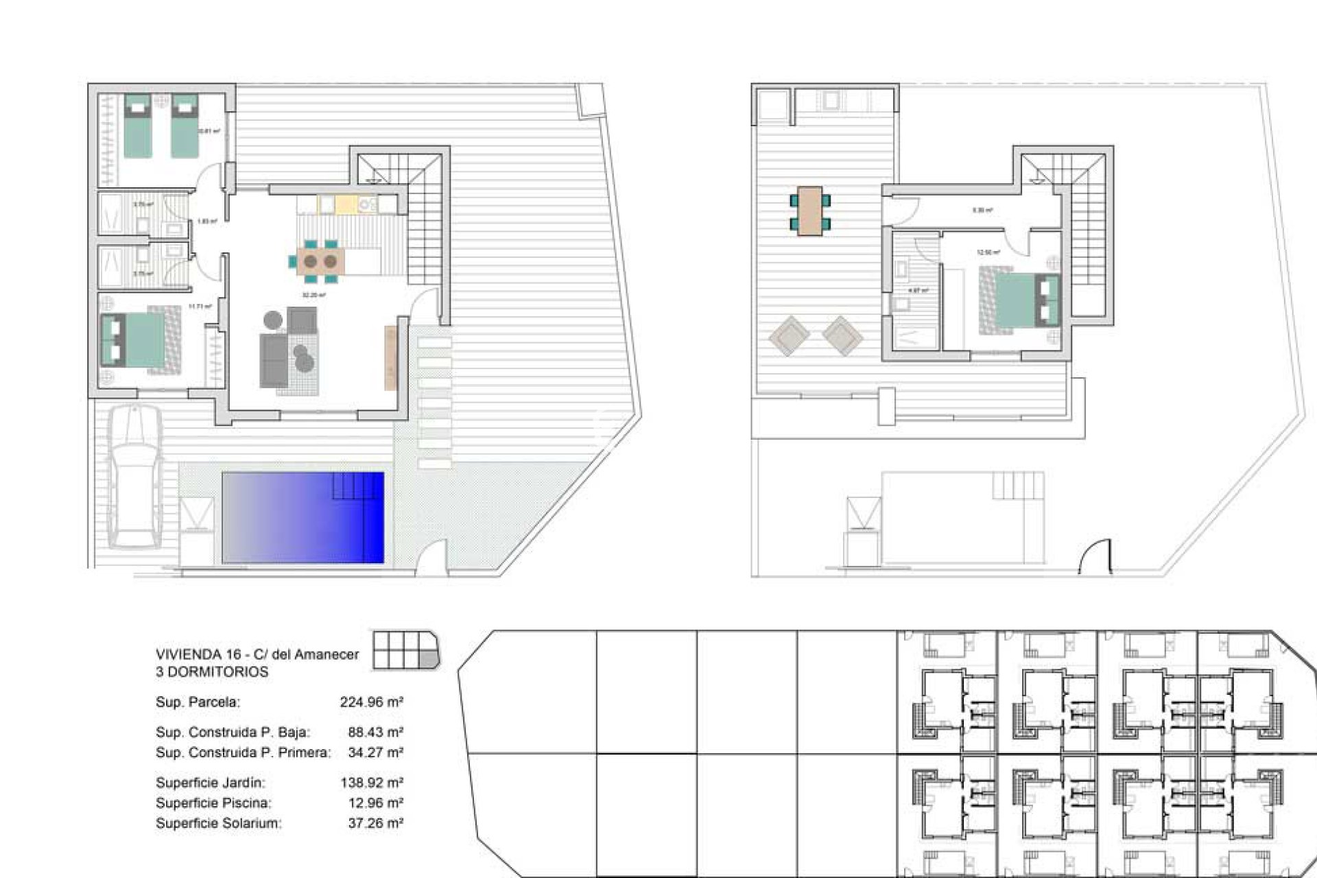 Los exteriores de estas viviendas independientes en Torre-Pacheco están diseñados para disfrutar del clima mediterráneo. Cada propiedad cuenta con un jardín privado, ideal para crear un espacio verde personal o para el disfrute al aire libre. Además, las terrazas ofrecen un lugar perfecto para relajarse o compartir momentos con amigos y familiares. Las viviendas también incluyen un solárium, proporcionando un espacio adicional para tomar el sol o disfrutar de las vistas. La presencia de una piscina privada en cada vivienda añade un toque de lujo, permitiendo refrescarse en los días más calurosos.