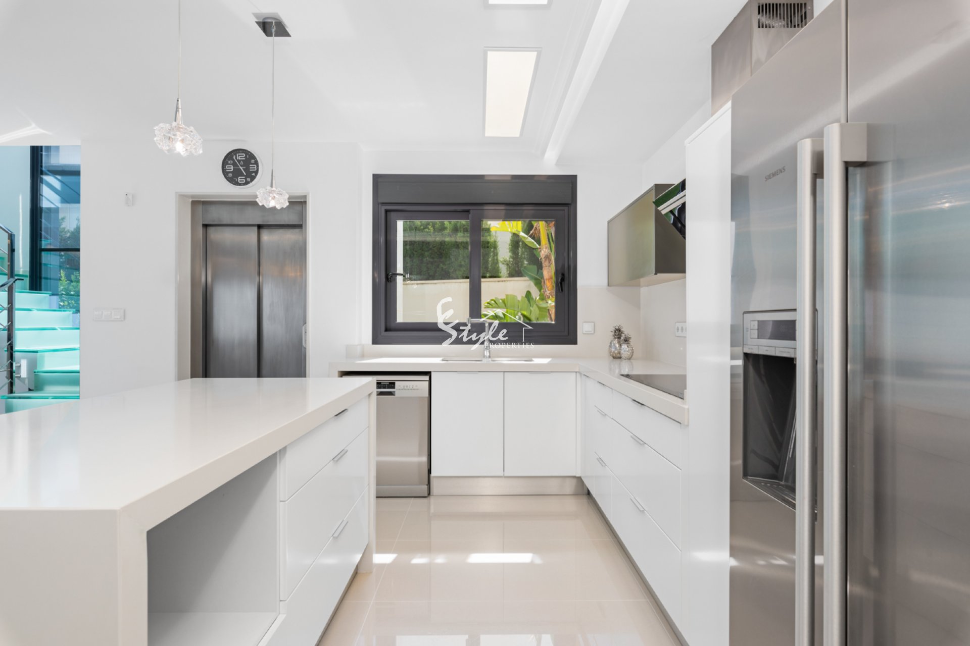 Esta propiedad de lujo de reciente construcción cuenta con un total de 5 habitaciones y 4 baños, distribuidos en dos plantas y sótano, con un práctico ascensor que comunica con todas las plantas de la casa y una preciosa escalera de cristal con luz interior. En la planta sótano encontramos un salón de juegos (con billar y futbolín), un salón para celebraciones con una cocina completa, 2 habitaciones, 2 cuartos de almacenaje y un baño completo. En la planta principal encontramos el salón comedor con cocina de concepto abierto e isla central, la habitación principal con baño en suite, así como el cuarto destinado a lavandería y un aseo. En la primera planta se ubican 2 habitaciones amplias, 2 cuartos de baño y los accesos a los balcones. En la última planta encontramos un increíble solarium de unos 70m2 con impresionantes vistas panorámicas. Equipamiento Dispone de aire condicionado, parking propio para varios vehículos, calefacción central con suelo radiante en toda la casa y se encuentra a la venta amueblada con muebles de diseño y equipada, salvo efectos personales.
