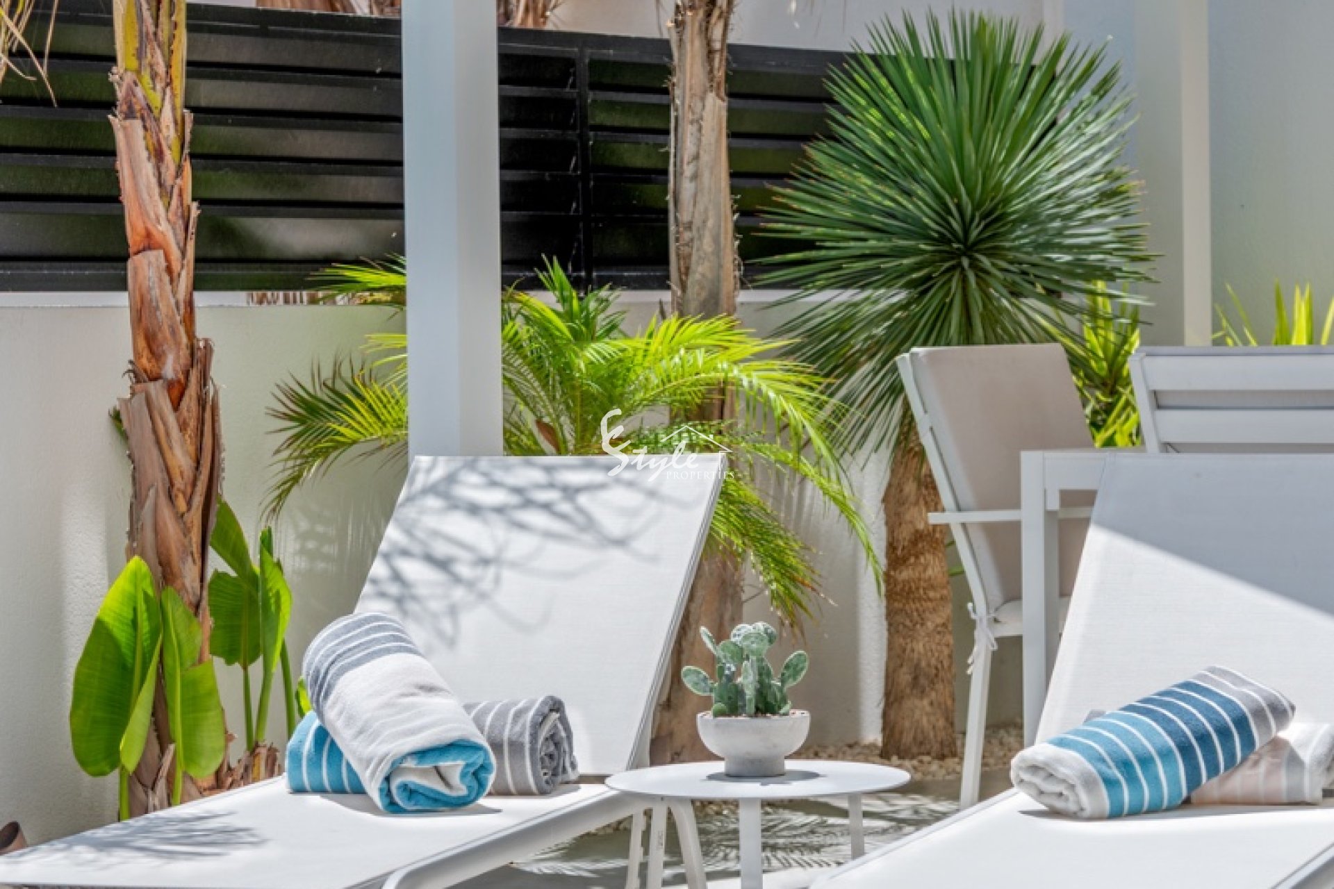 La entrada principal se sitúa en el lado norte de la propiedad, mientras que el jardín y la zona de la piscina disfrutan de orientación sur. En el exterior, la piscina privada de 36m² destaca como elemento central, rodeada de un paisajismo moderno y zonas de descanso y comedor. Una pérgola ofrece sombra para disfrutar de comidas al aire libre y la terraza cubierta amplía el espacio habitable. El solárium en la azotea ofrece vistas abiertas y un espacio perfecto para relajarse, incluyendo vistas parciales al mar.
