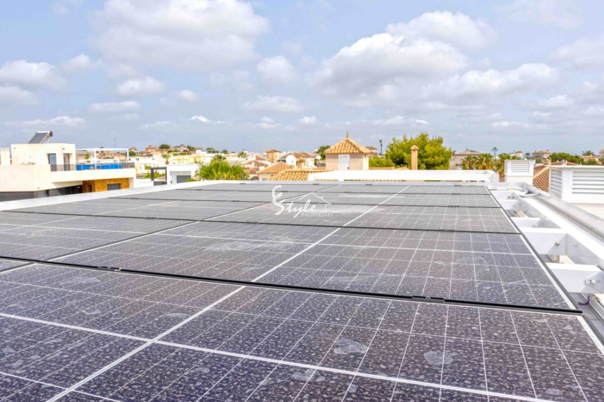 El lujo y la sostenibilidad se combinan a la perfección. La terraza cuenta con una cocina exterior, una pérgola espaciosa con parasoles horizontales y verticales, y paneles solares de 4100 vatios. También hay una lavadora y una nevera-congelador discretamente ubicadas en la terraza.