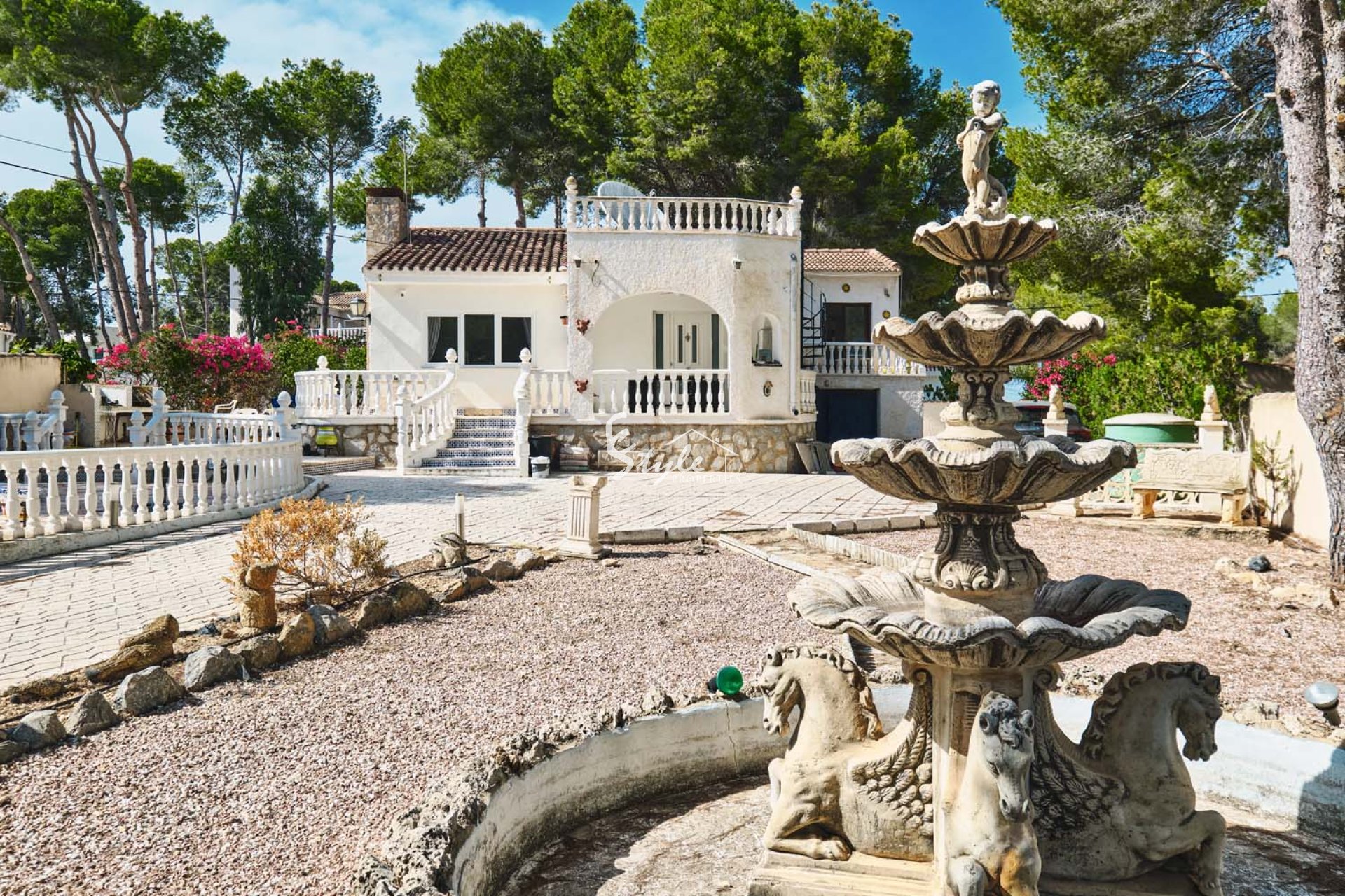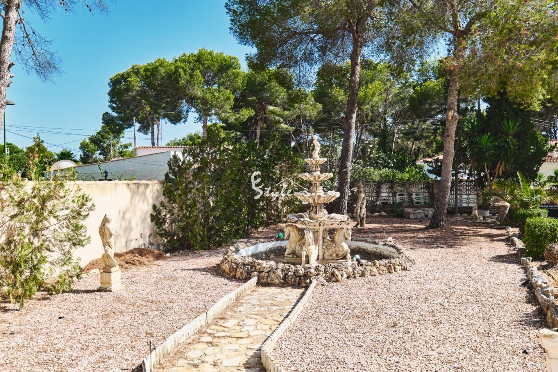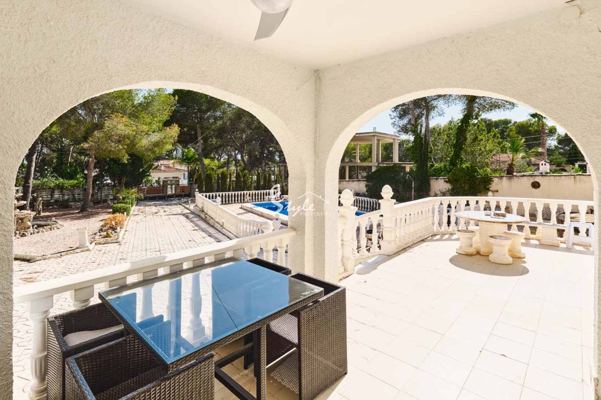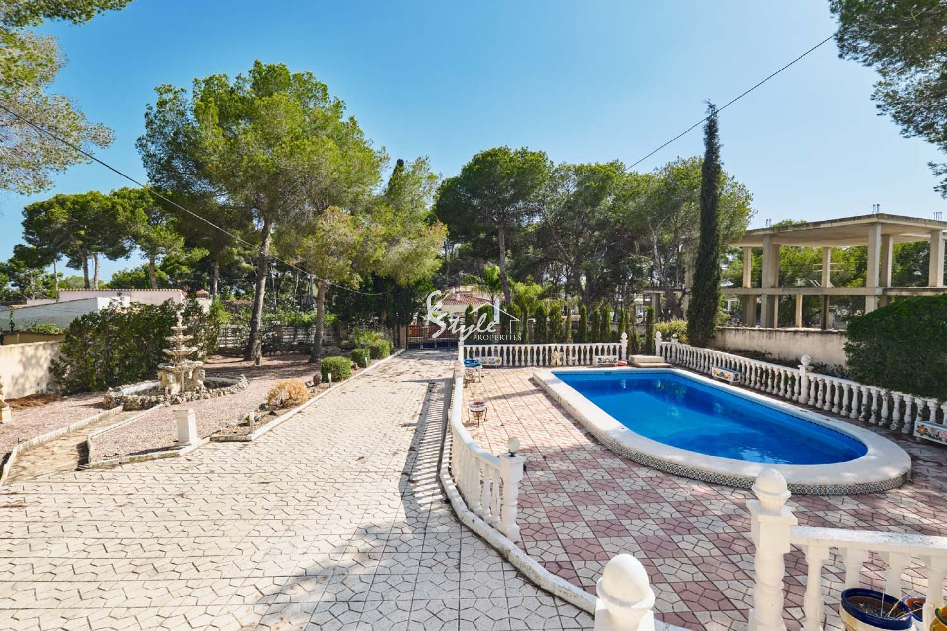 Al acceder a la parcela por una gran puerta corredera, se accede a un amplio y amplio camino de entrada con plantas y árboles consolidados a ambos lados. Siguiendo el camino, a la izquierda, se encuentra una piscina privada con amplio espacio para tumbonas. Se accede a la villa a través de unos escalones que suben a una gran terraza semicubierta con vistas a la piscina y al jardín. La puerta principal de la propiedad se encuentra en esta terraza. La puerta da paso a una espaciosa y luminosa cocina-comedor de planta abierta. La cocina, de buen tamaño y con amplios armarios, ha sido recientemente renovada por el propietario. Un arco a la izquierda da paso a un espacioso salón con grandes ventanales que inundan la estancia de luz natural y una pared con iluminación. Un pasillo en la parte trasera de la cocina conduce al dormitorio de invitados con baño en suite y al amplio dormitorio principal con aire acondicionado frío/calor, puertas que dan al jardín y un amplio baño en suite con bañera y ducha a ras de suelo.