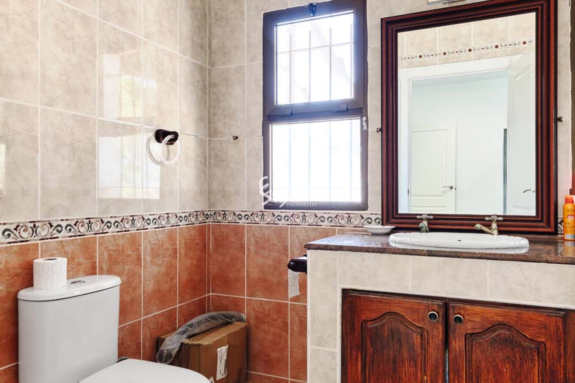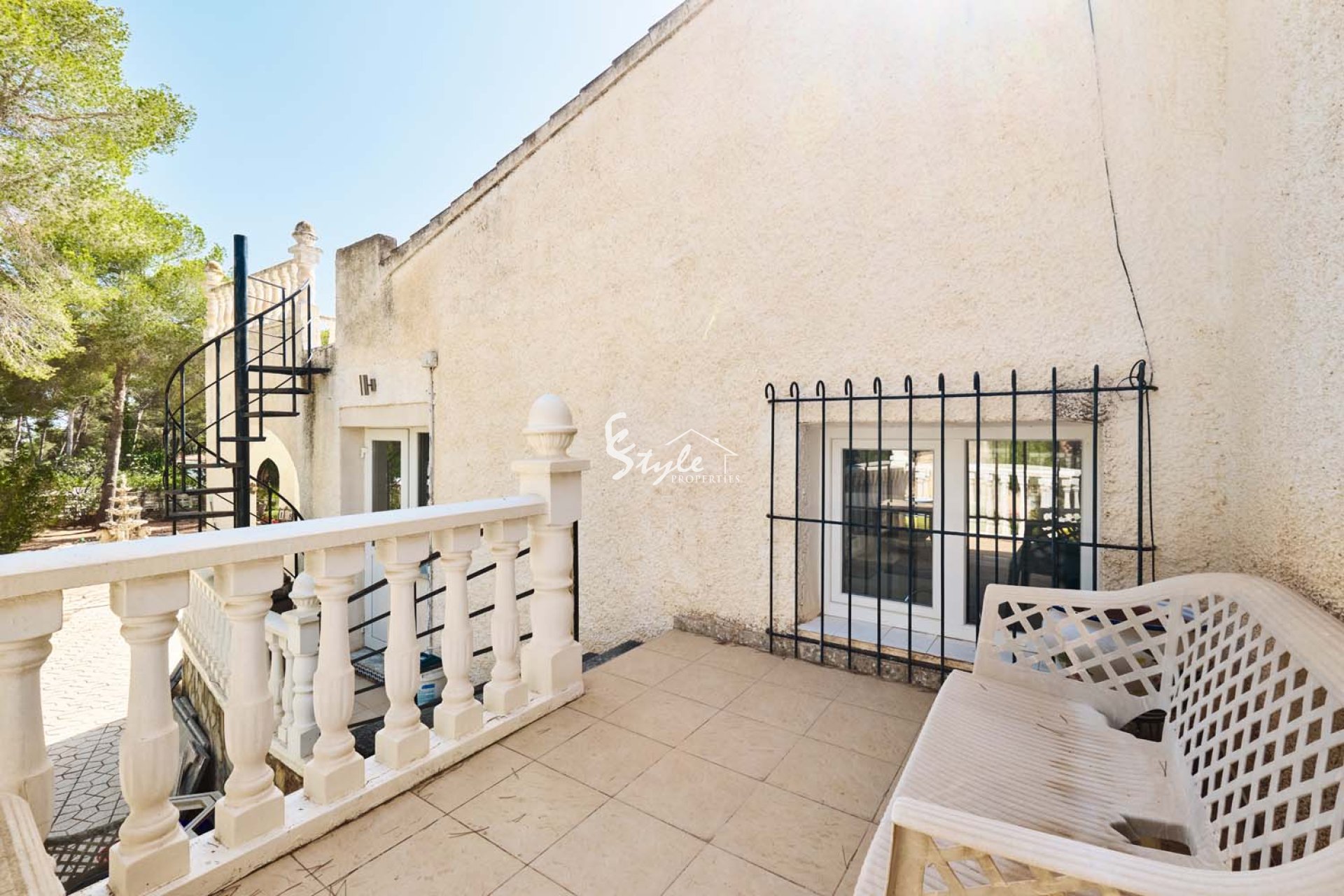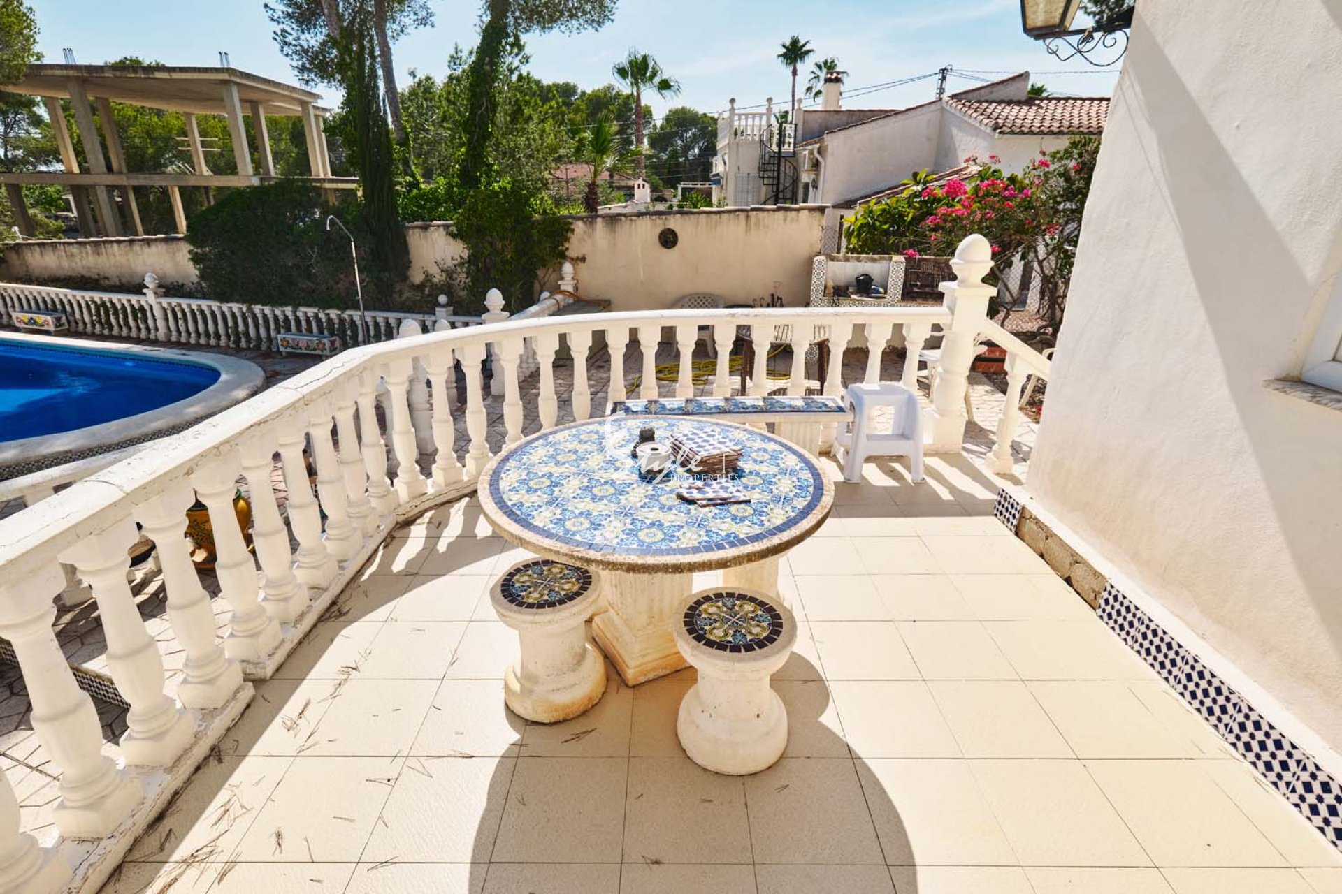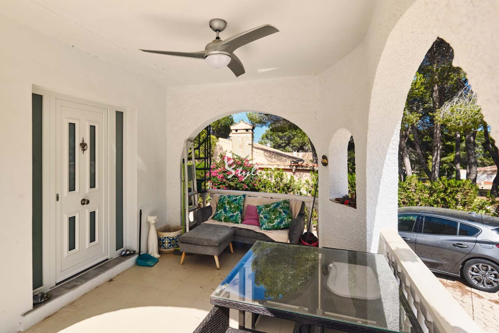 Al acceder a la parcela por una gran puerta corredera, se accede a un amplio y amplio camino de entrada con plantas y árboles consolidados a ambos lados. Siguiendo el camino, a la izquierda, se encuentra una piscina privada con amplio espacio para tumbonas. Se accede a la villa a través de unos escalones que suben a una gran terraza semicubierta con vistas a la piscina y al jardín. La puerta principal de la propiedad se encuentra en esta terraza. La puerta da paso a una espaciosa y luminosa cocina-comedor de planta abierta. La cocina, de buen tamaño y con amplios armarios, ha sido recientemente renovada por el propietario. Un arco a la izquierda da paso a un espacioso salón con grandes ventanales que inundan la estancia de luz natural y una pared con iluminación. Un pasillo en la parte trasera de la cocina conduce al dormitorio de invitados con baño en suite y al amplio dormitorio principal con aire acondicionado frío/calor, puertas que dan al jardín y un amplio baño en suite con bañera y ducha a ras de suelo.