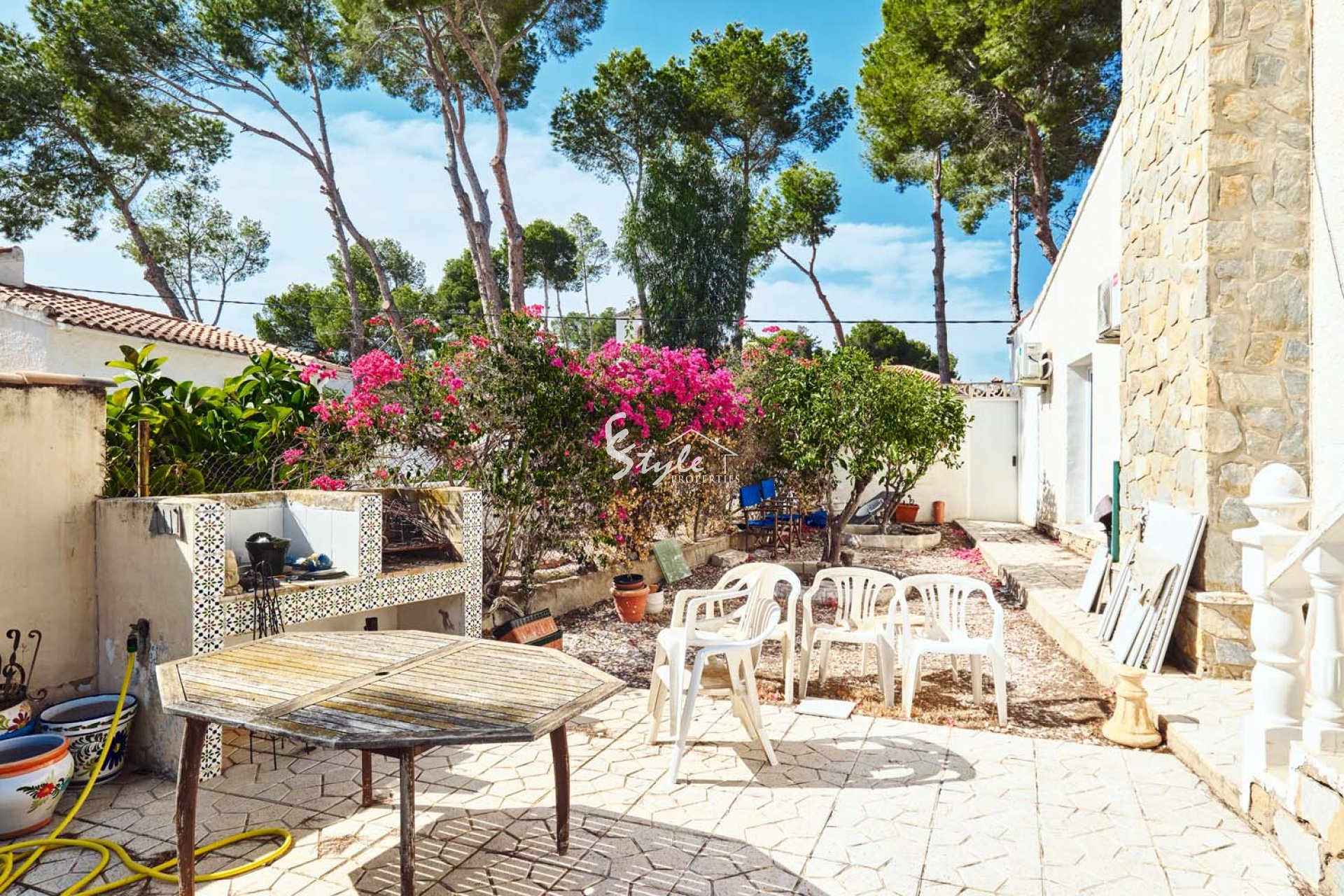 Gran oportunidad de adquirir una villa independiente de 3 dormitorios y 3 baños con piscina privada, garaje y a poca distancia de todos los servicios en el bonito y verde pueblo de Pinar de Campoverde. Situada en una amplia parcela llana de 1100 m², esta encantadora villa se encuentra cerca del Parque Natural de Río Seco y a solo 10 km de las populares playas de Torre de la Horadada y Mil Palmeras.