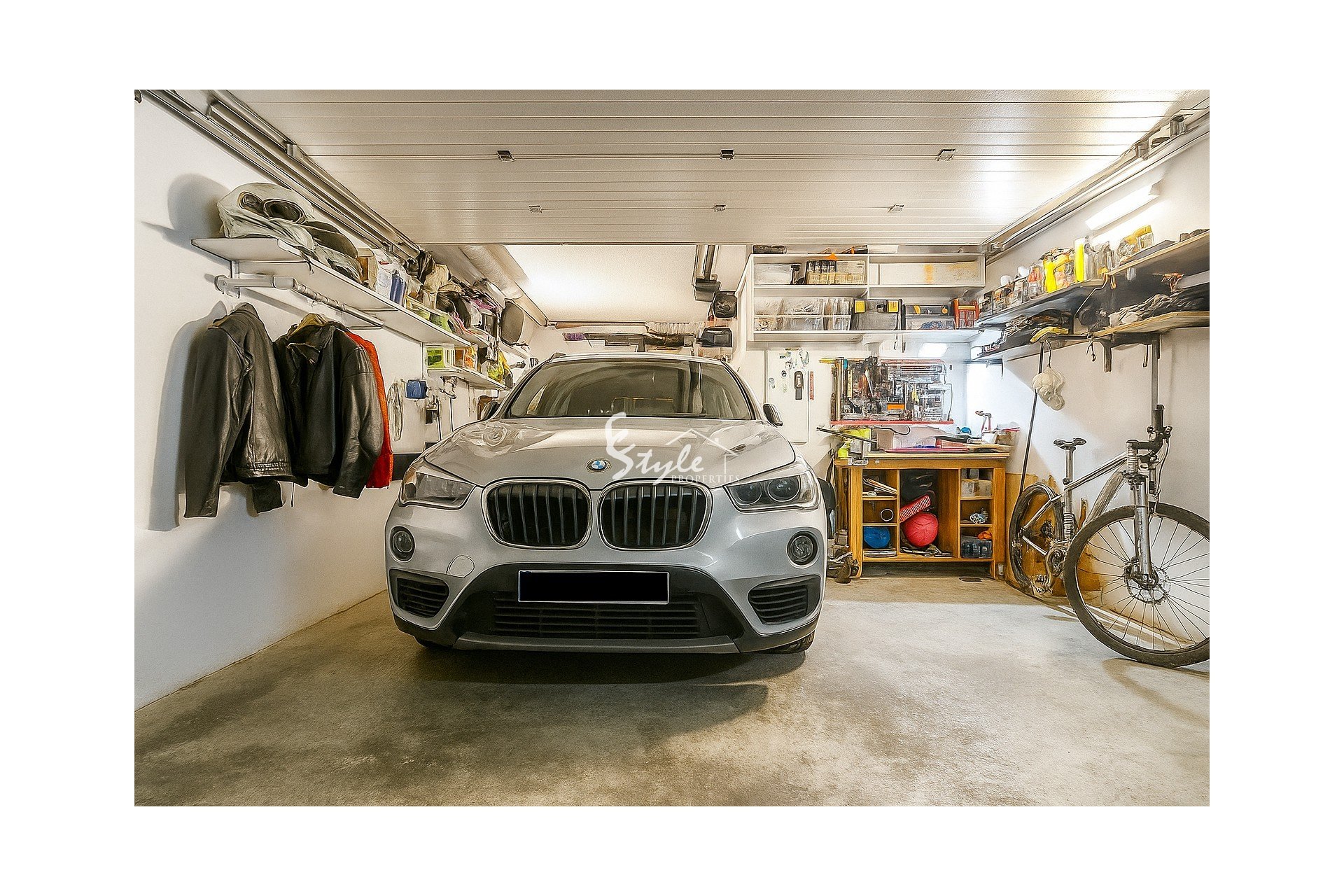 En la planta inferior, la vivienda dispone de un garaje cerrado con espacio para un vehículo y dos motos, un aseo de cortesía y una sala polivalente, actualmente adaptada como estudio musical y sala de cine, ideal para el ocio o el trabajo creativo.