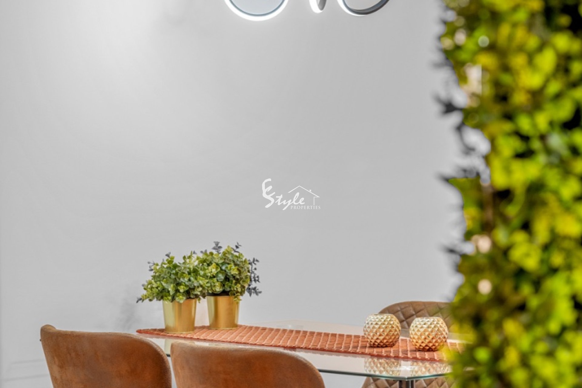El interior está decorado en un estilo moderno y minimalista, combinando la elegancia del blanco con la calidez de la madera y el toque natural de las plantas. Se vende parcialmente amueblado, tal como se muestra en las fotos, dejando espacio para que el nuevo propietario personalice el ambiente a su gusto.