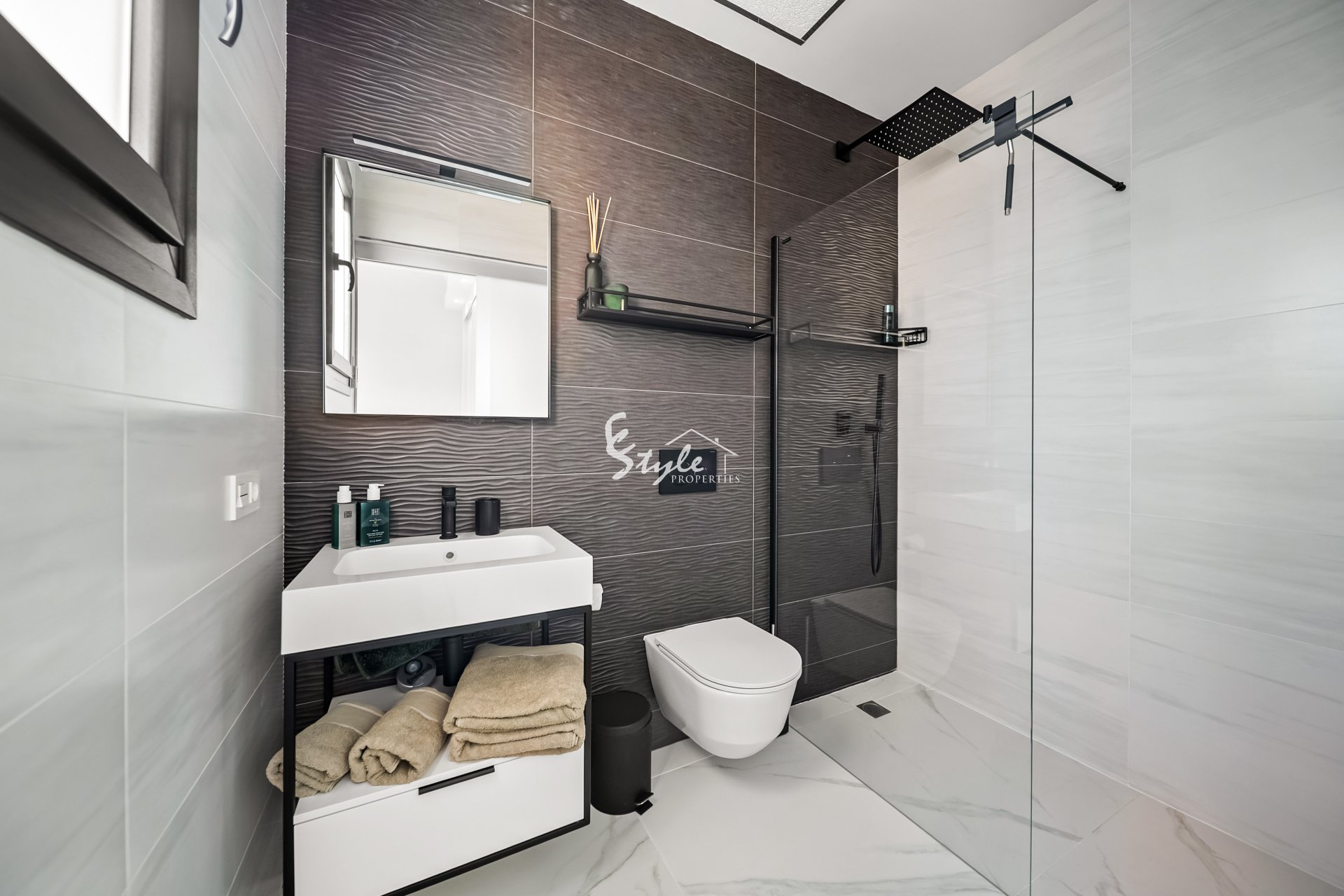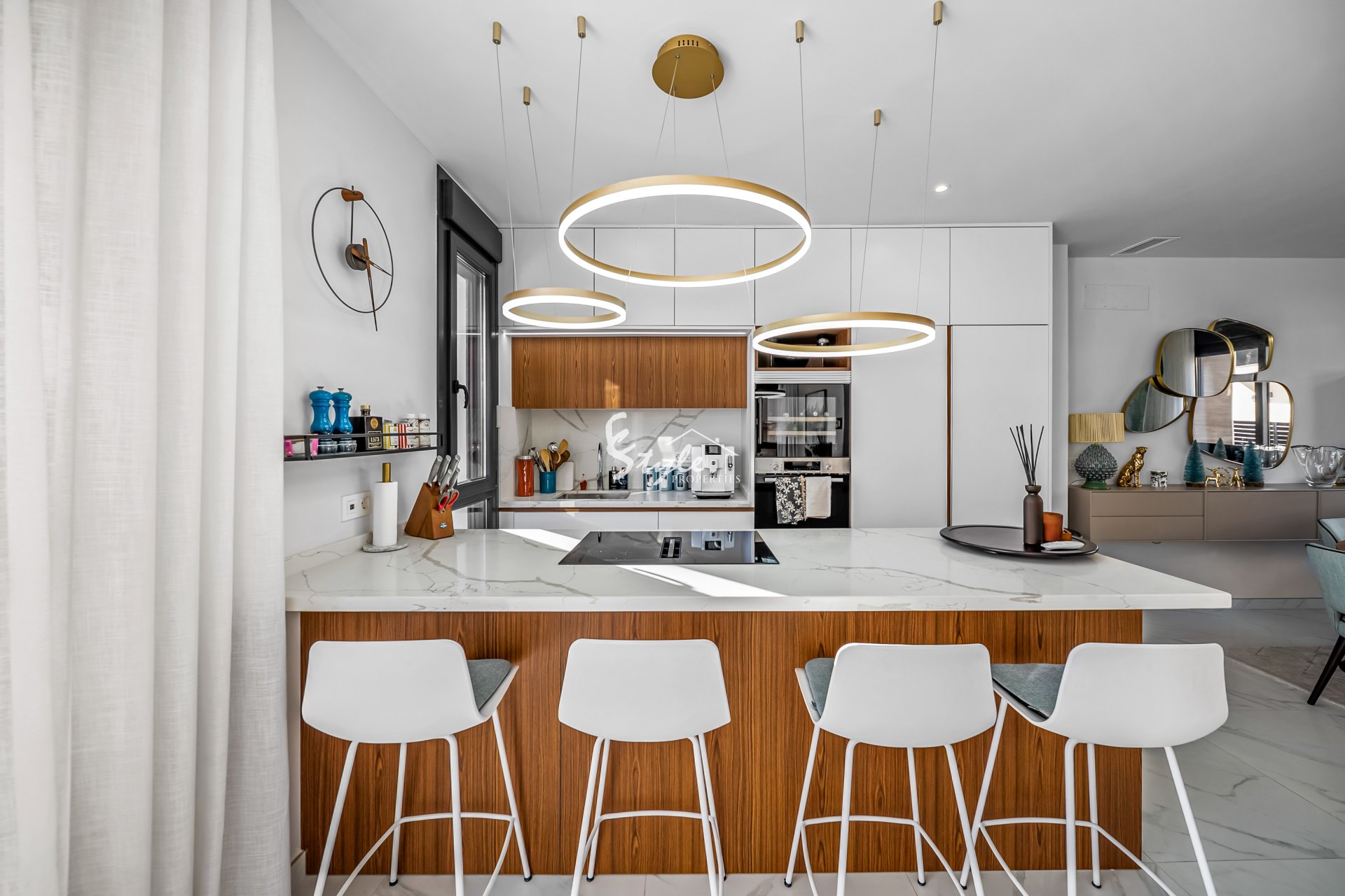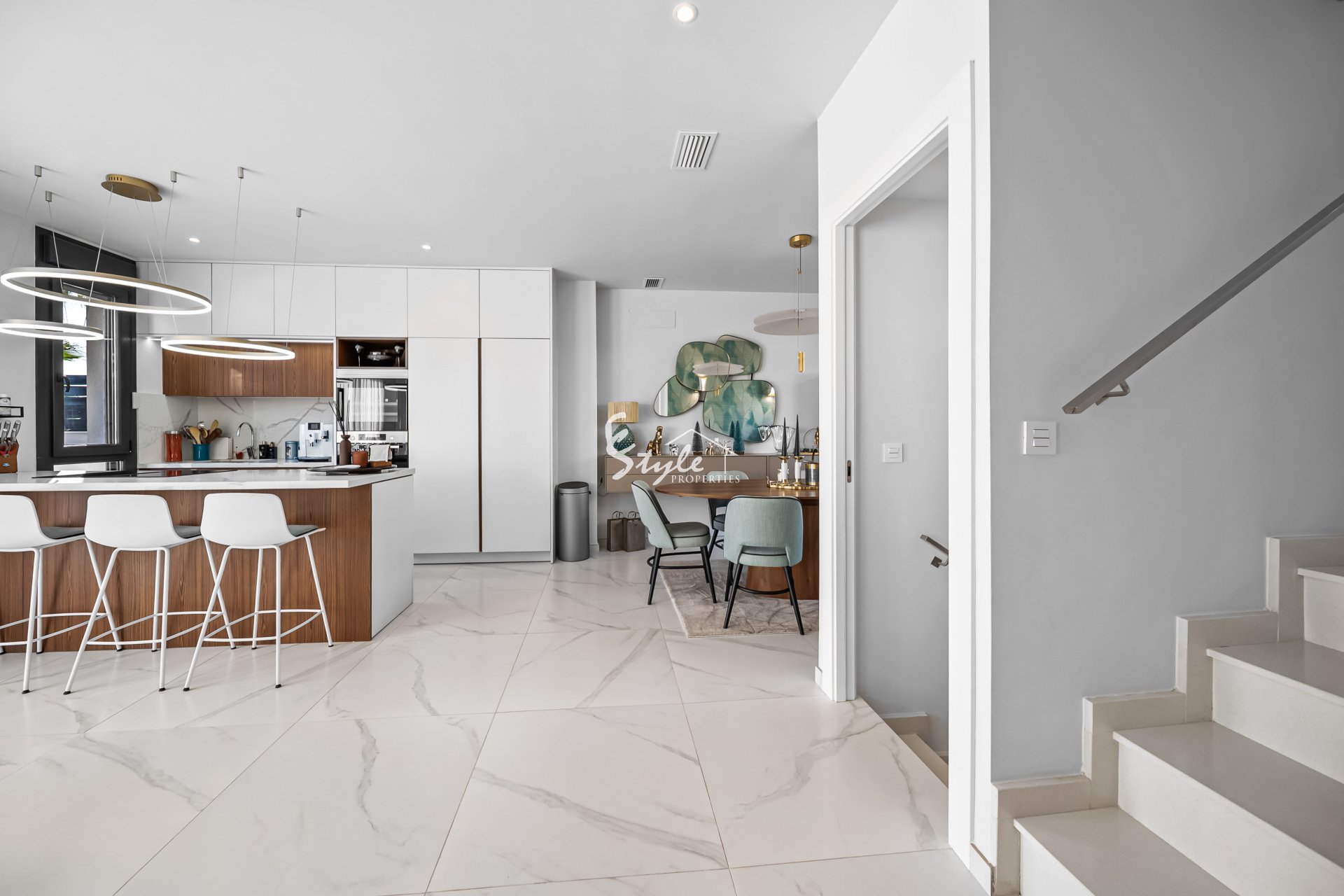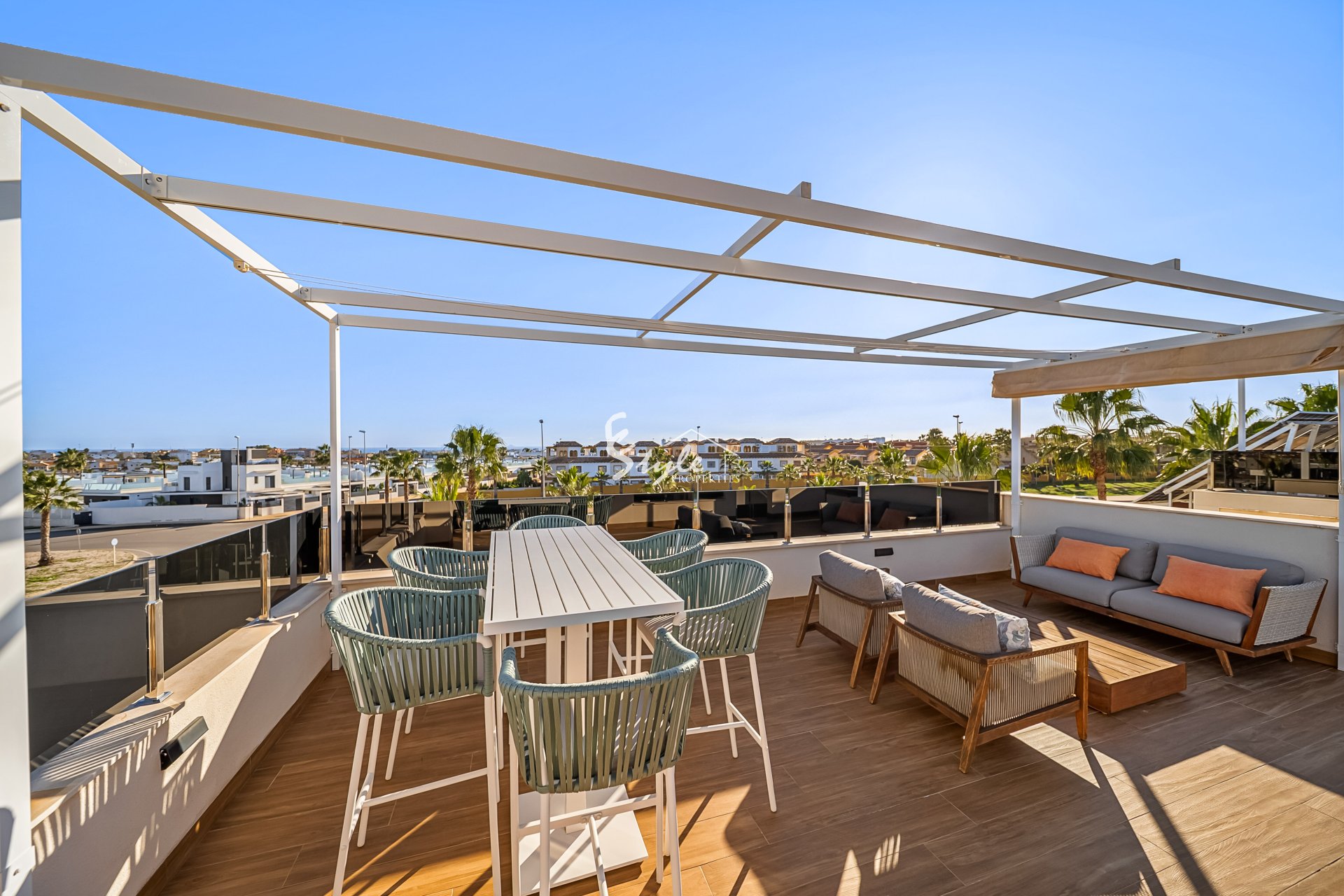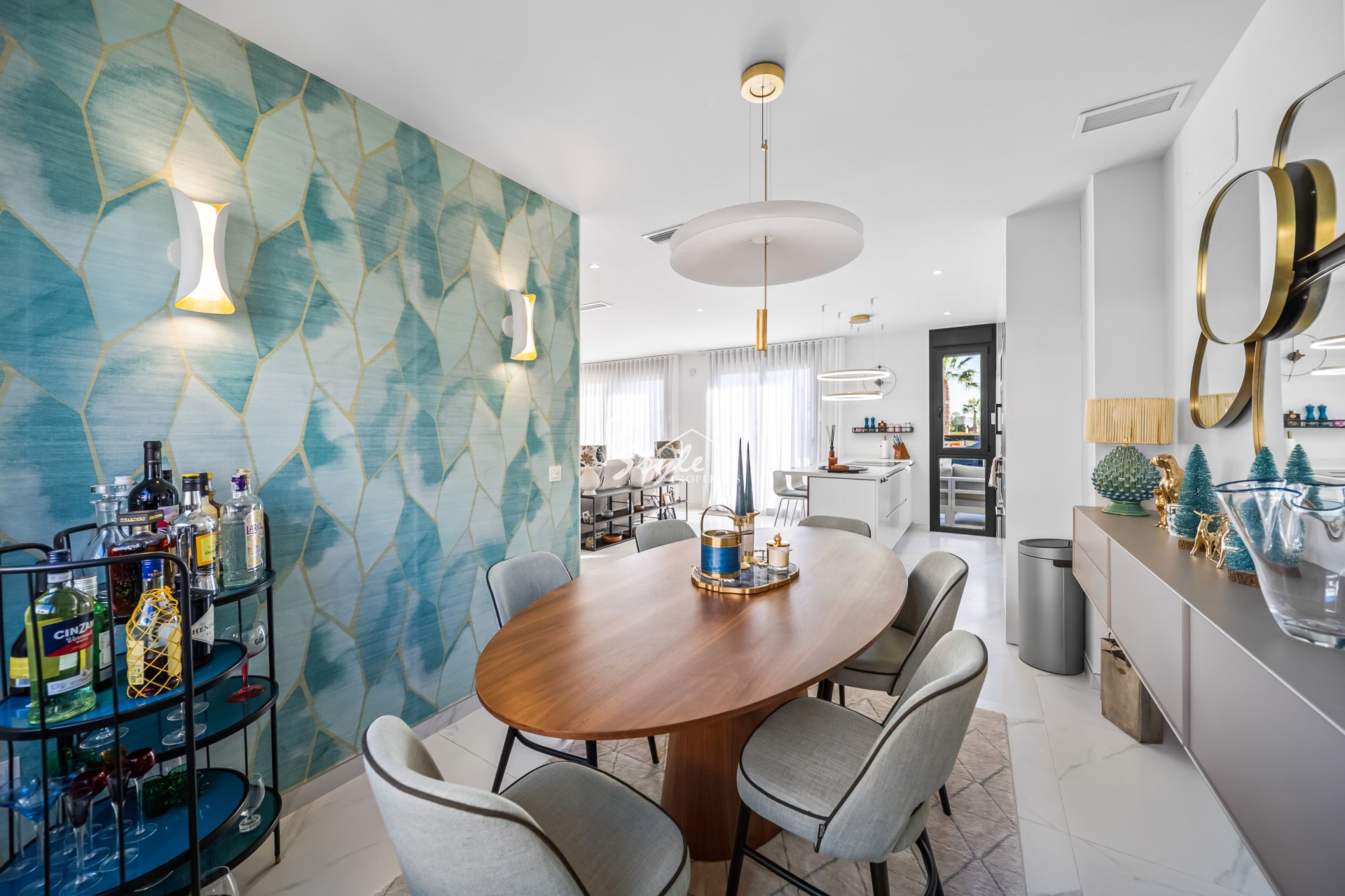 Propiedad de alta calidad ubicada en una comunidad cerrada, con una parcela de 205 m² y 175 m² construidos. Dispone de 3 dormitorios y 4 baños, incluyendo una espectacular master suite en el sótano con bañera integrada en el dormitorio, baño privado y vestidor tipo “walkthrough”. Cuenta con piscina privada climatizada de 21 m², orientación sur y vistas abiertas a zona verde, además de vistas al mar desde el solárium. Toldos instalados en la terraza y solárium, trastero exterior y plaza de parking privada en residencial.