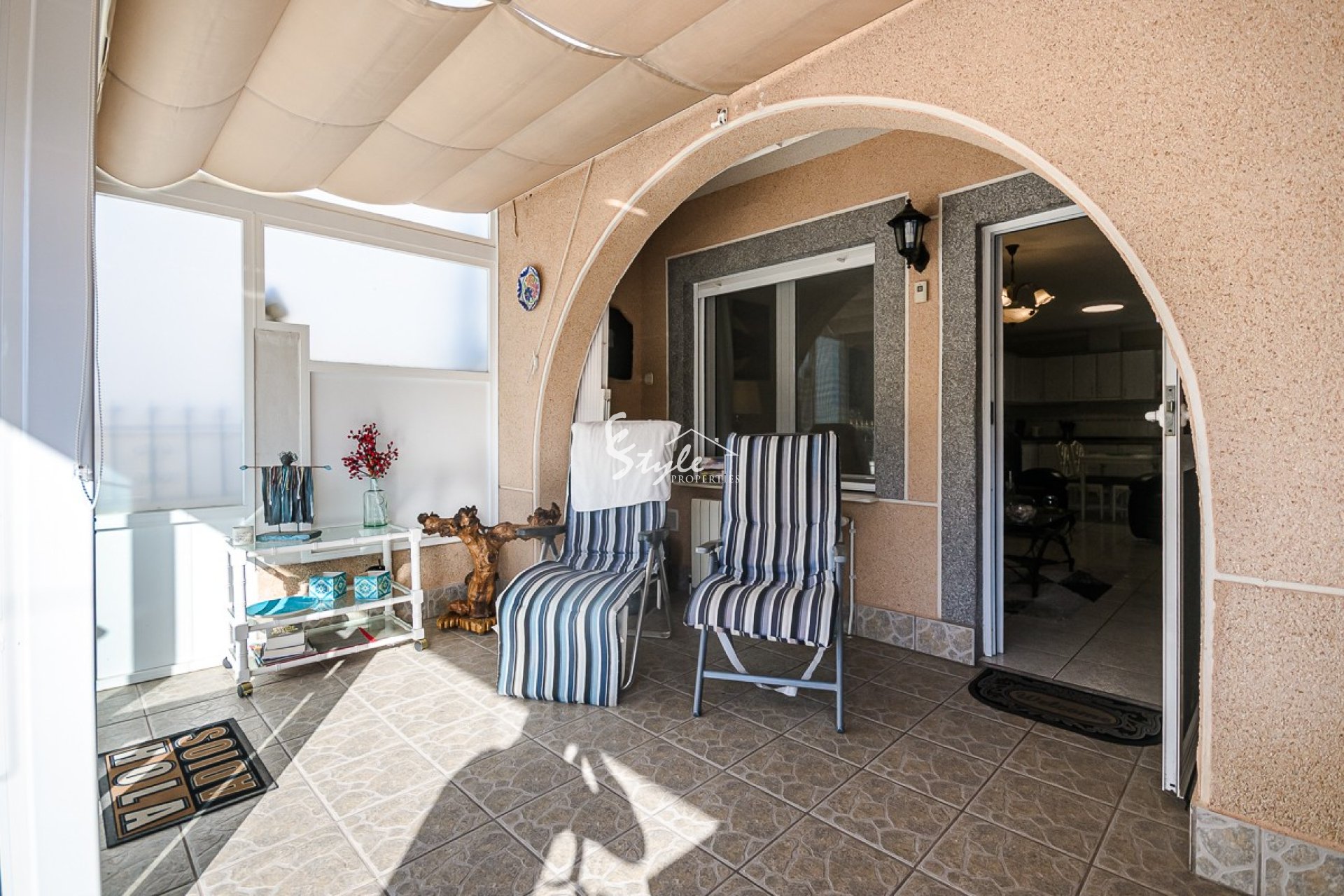 Das Haus besticht durch einen hellen, offenen Wohn- und Essbereich , der einen einladenden Raum schafft und nahtlos in eine überdachte Terrasse übergeht, die mit Glasvorhängen versehen ist – perfekt, um das Haus das ganze Jahr über zu genießen, auch in den Wintermonaten.