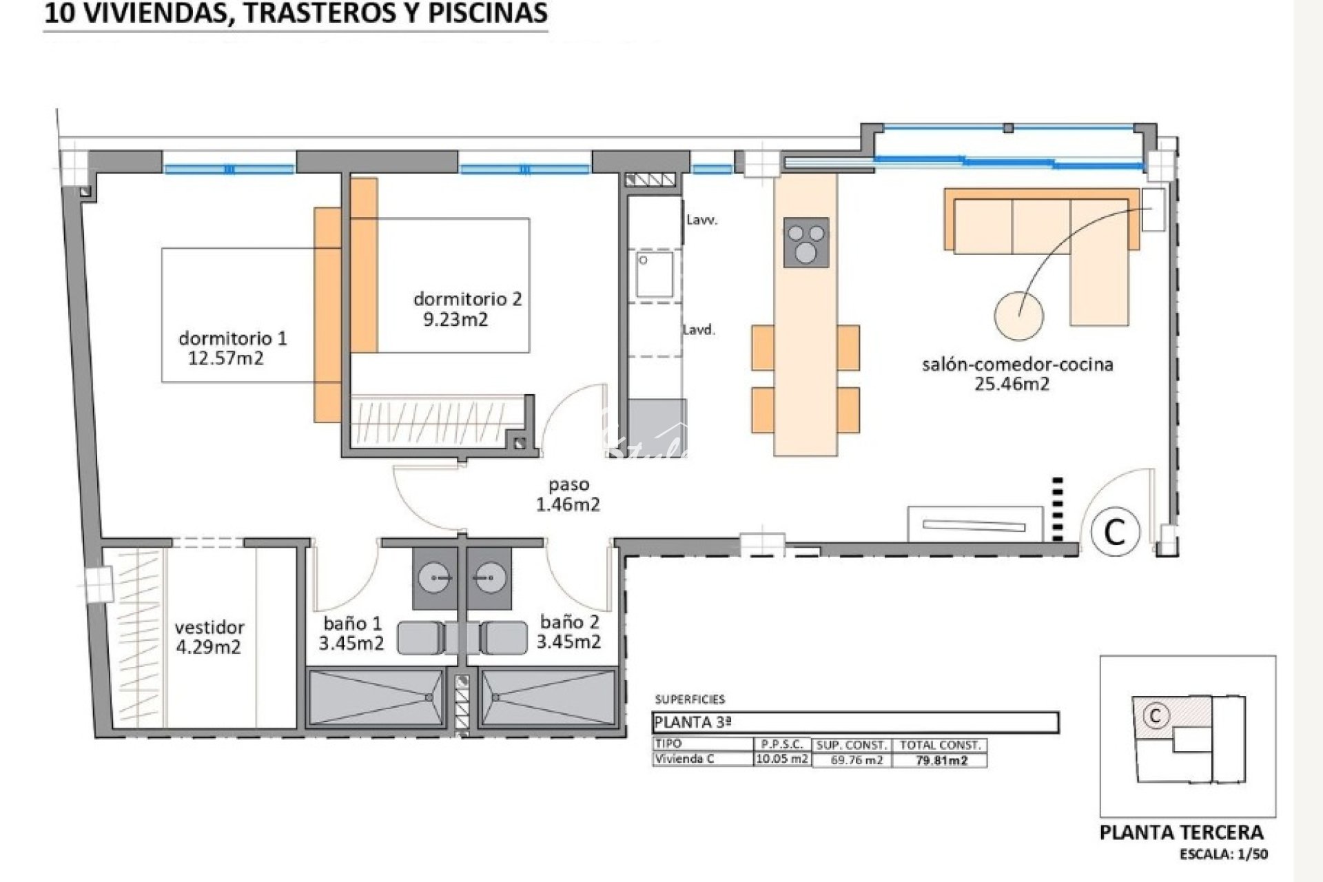 Los interiores destacan por su elegancia y funcionalidad. Los suelos de gres porcelánico aportan un acabado moderno y fácil de mantener. Las viviendas están equipadas con electrodomésticos, lo que facilita la vida diaria desde el primer día. Los armarios empotrados ofrecen un amplio espacio de almacenamiento, manteniendo el orden y la estética. La distribución incluye opciones de dos o tres dormitorios y dos o tres baños, adaptándose a diferentes necesidades familiares. La posibilidad de incluir un garaje o aparcamiento añade comodidad y seguridad.