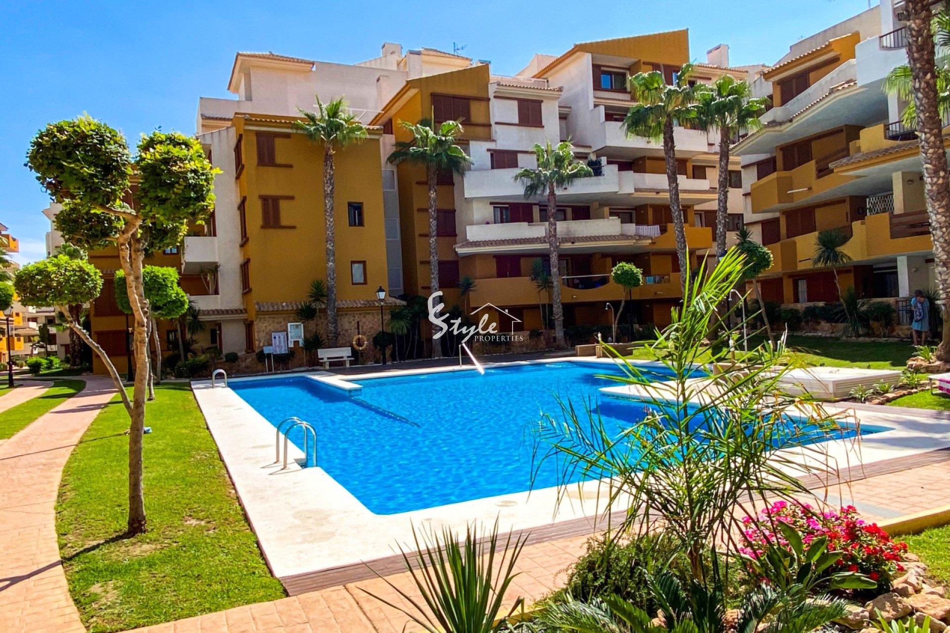 La comunidad ofrece a sus residentes jardines tropicales cuidadosamente mantenidos, 3 piscinas comunitarias, seguridad 24 horas y una ubicación inmejorable cerca de supermercados, restaurantes, bares, centros comerciales, bancos y farmacias. El paseo marítimo y la playa se encuentran a solo 5 minutos a pie. Para los amantes del golf, hay varios campos reconocidos a solo 10 minutos en coche, como Las Colinas Golf, Las Ramblas Golf, Villamartin Golf y Campoamor Golf.