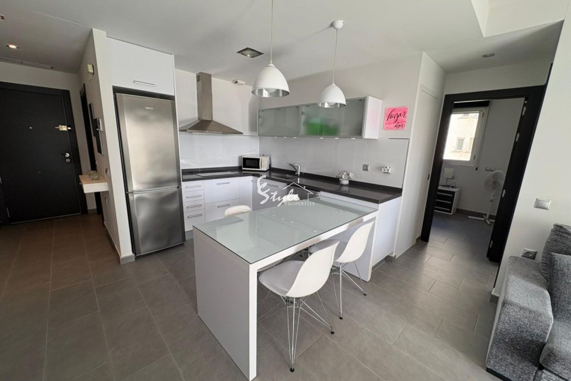 Ubicado en una cuarta planta, la vivienda cuenta con 2 dormitorios y 2 baños completos, diseñados en un estilo moderno y funcional. El amplio y luminoso salón con cocina moderna integrada ofrece un espacio cómodo y elegante para el día a día.