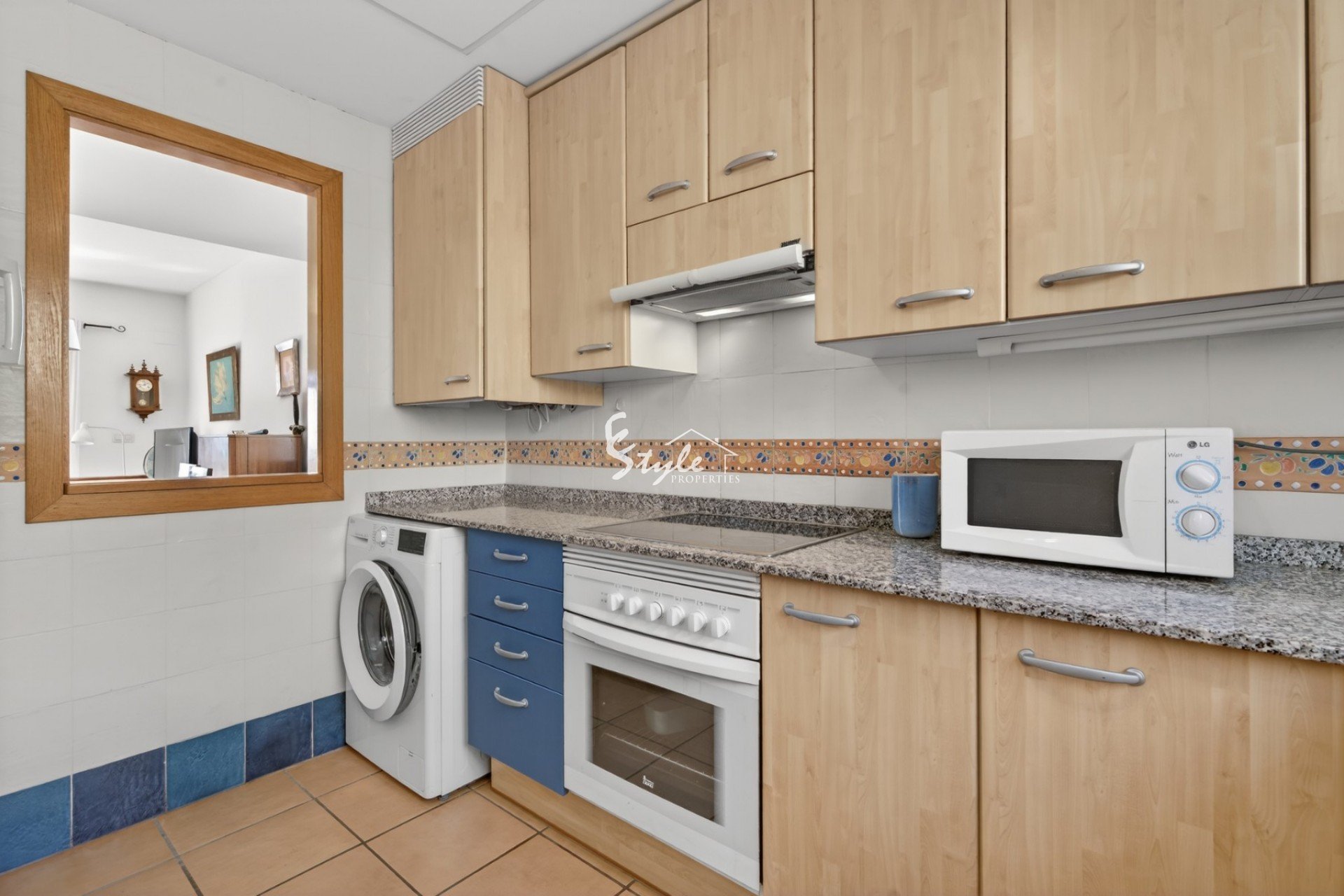 El salón es amplio y luminoso, con acceso directo a la terraza y al jardín. Desde aquí se pueden disfrutar vistas abiertas al Mediterráneo y a las cuidadas zonas comunes. La cocina está ligeramente independiente, pero conectada con el salón, creando un espacio práctico y funcional.