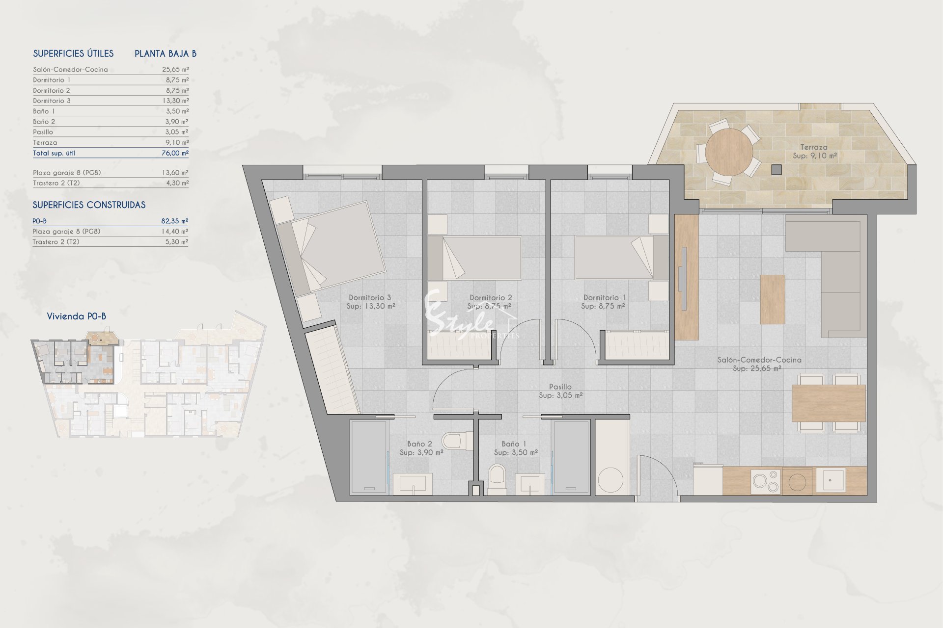El interior de estas viviendas destaca por su diseño moderno y funcional. Los apartamentos, plantas bajas y áticos ofrecen opciones de 1, 2 o 3 dormitorios, adaptándose a diferentes necesidades familiares. Los baños, disponibles en configuraciones de 1 o 2, están equipados con acabados de alta calidad. La cocina incluye electrodomésticos modernos, facilitando el día a día. El suelo de gres porcelánico aporta un toque de elegancia y durabilidad, mientras que el aire acondicionado garantiza el confort térmico durante todo el año. Los armarios empotrados ofrecen soluciones de almacenamiento eficientes, y el videoportero añade un extra de seguridad y comodidad.