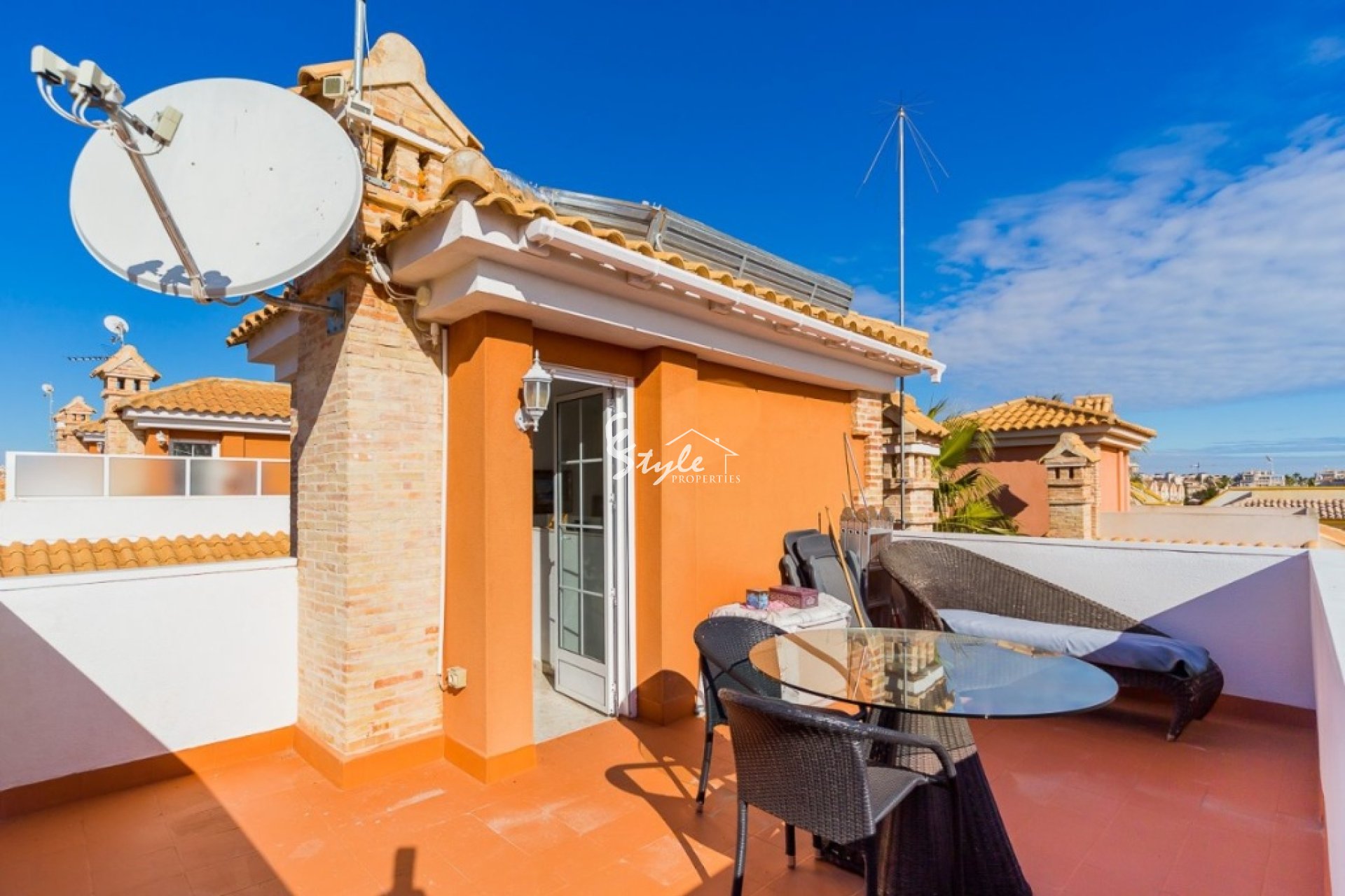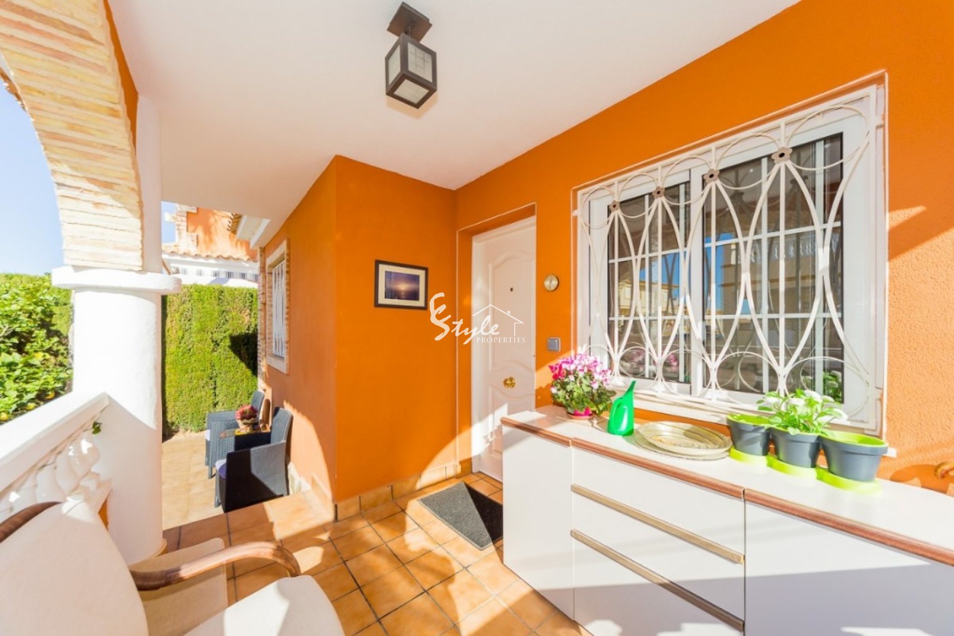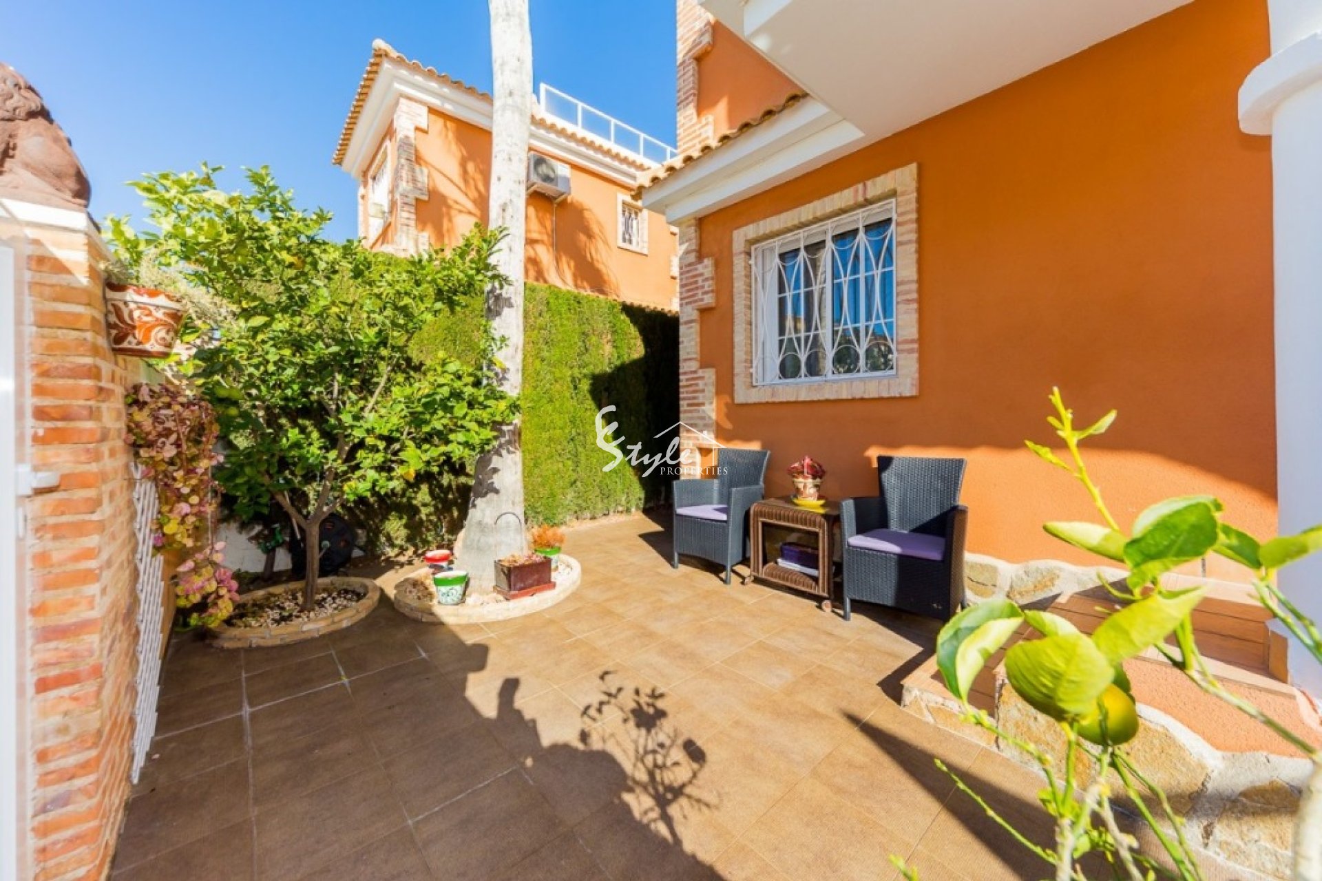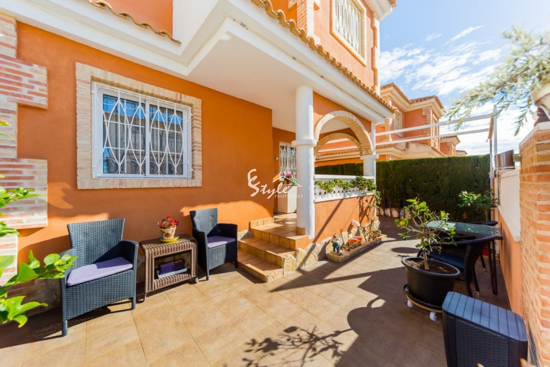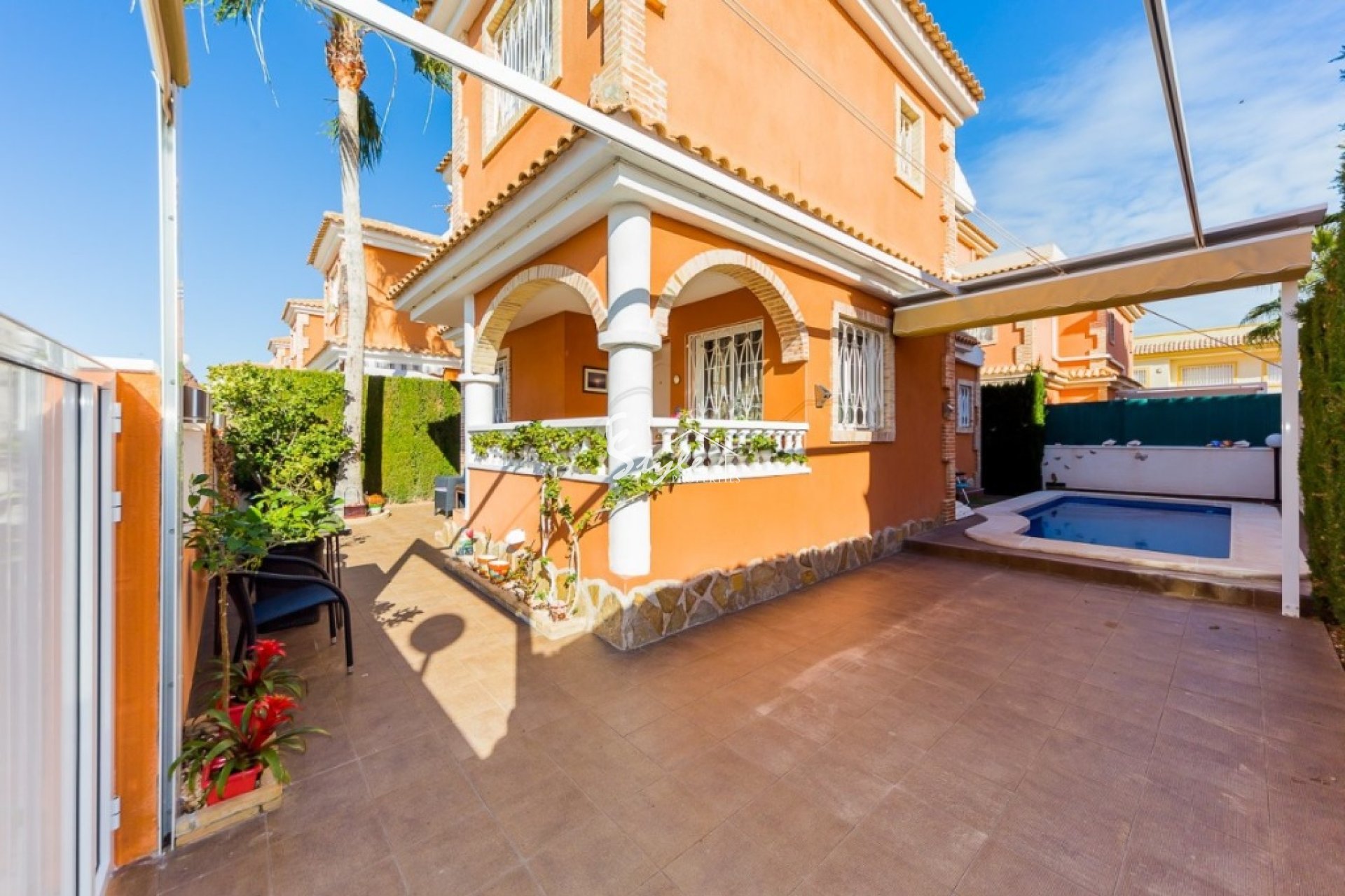 Villa de tres plantas con muebles y electrodomesticos de calidad. Superficie construida 111 m2, luminoso y amplio salón con salida al porche, cocina grande independiente con muebles y electrodomésticos, dos dormitorios con armario empotrados, el de matrimonio con dos zonas adaptadas como dormitorio y como pequeño despacho y vestidor, dos baños completos, solarium, pequeña parcela con piscina y parking. Se vende amueblado y con electrodomésticos, incluido aire acondicionado en toda la casa. Ideal para vivir todo el año y pasar vacaciones junto a la playa. Rentable alquiler de temporada.~~Bonito chalet a estilo clasico en un complejo cerrado con dos piscinas comunitaria, 2004 año de construccion. Se paga poca comunidad.~~Tranquila área Playa Flamenca cerca del enorme CC "La Zenia, El Bulevard" con todos los servicios. Distancia hasta la playa unos 1,5 km