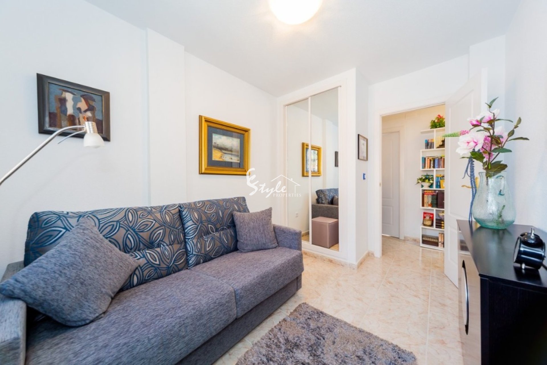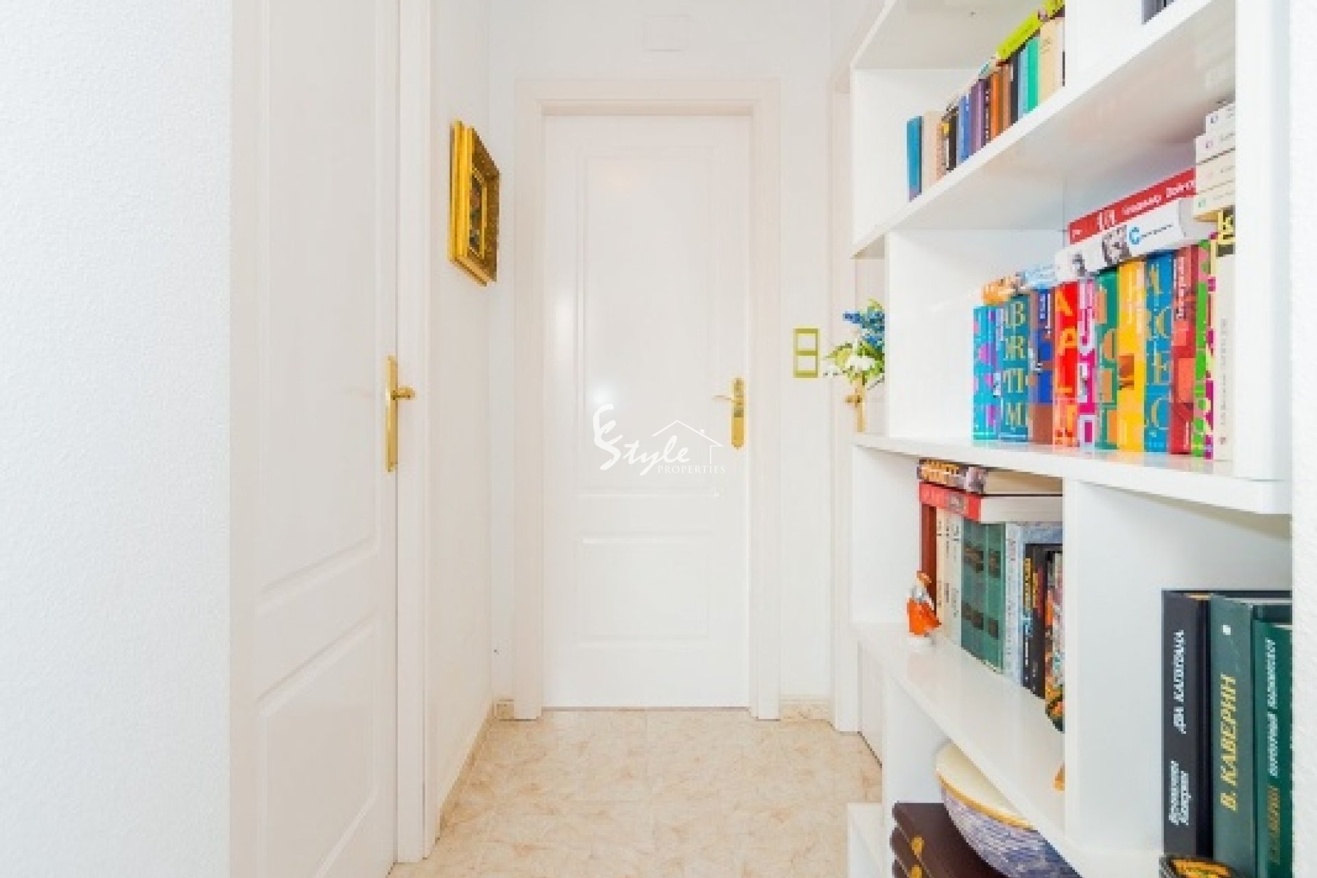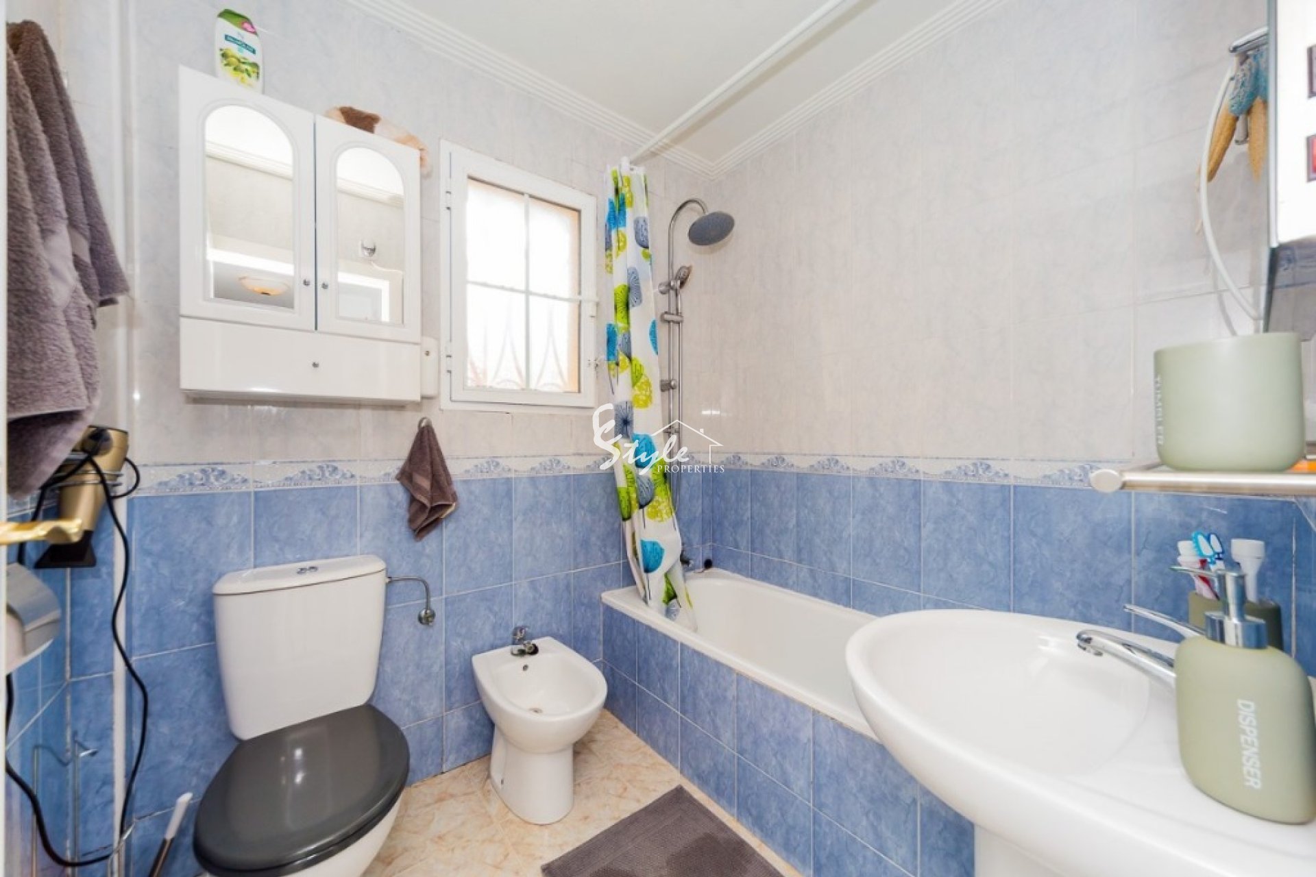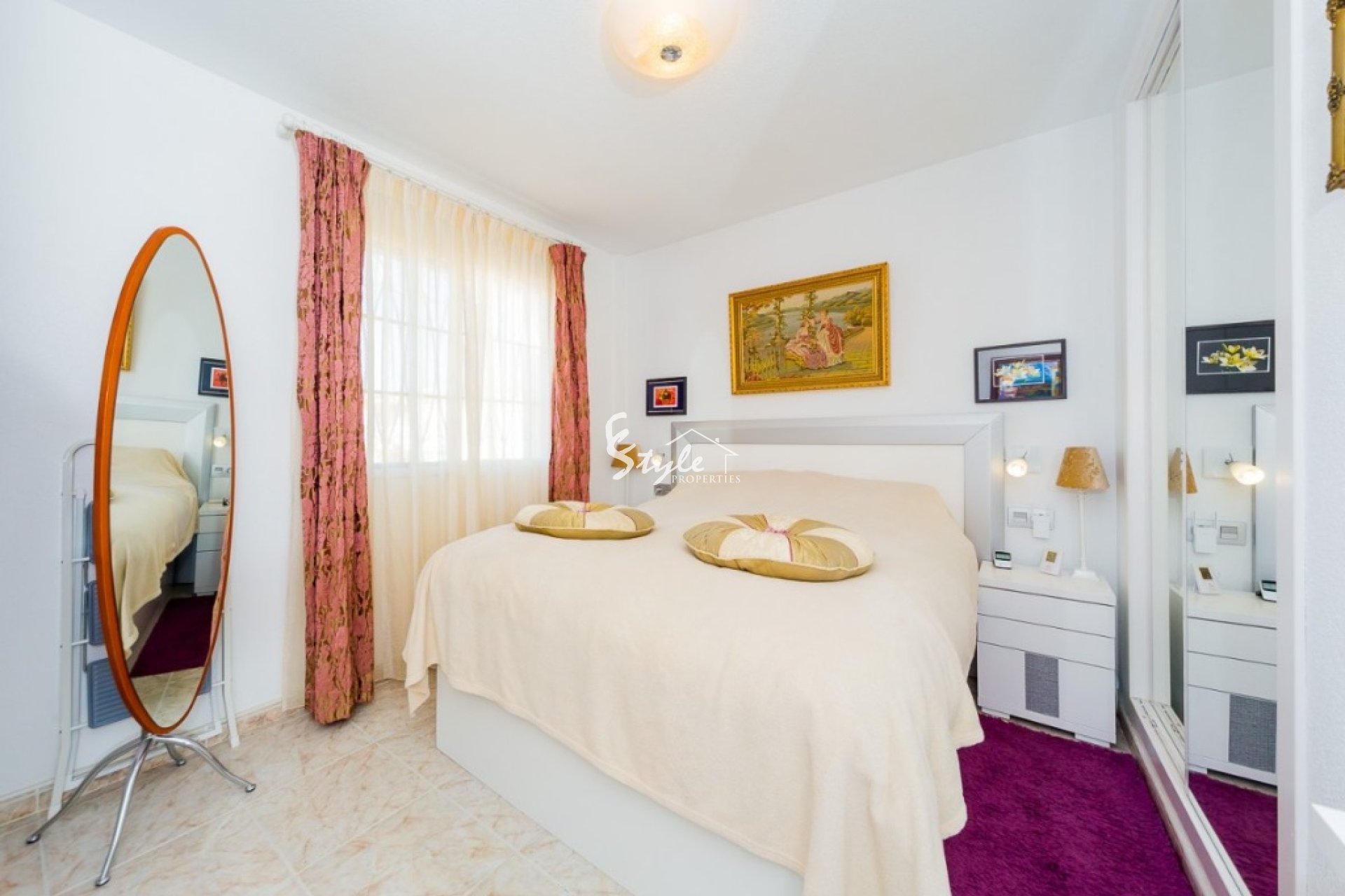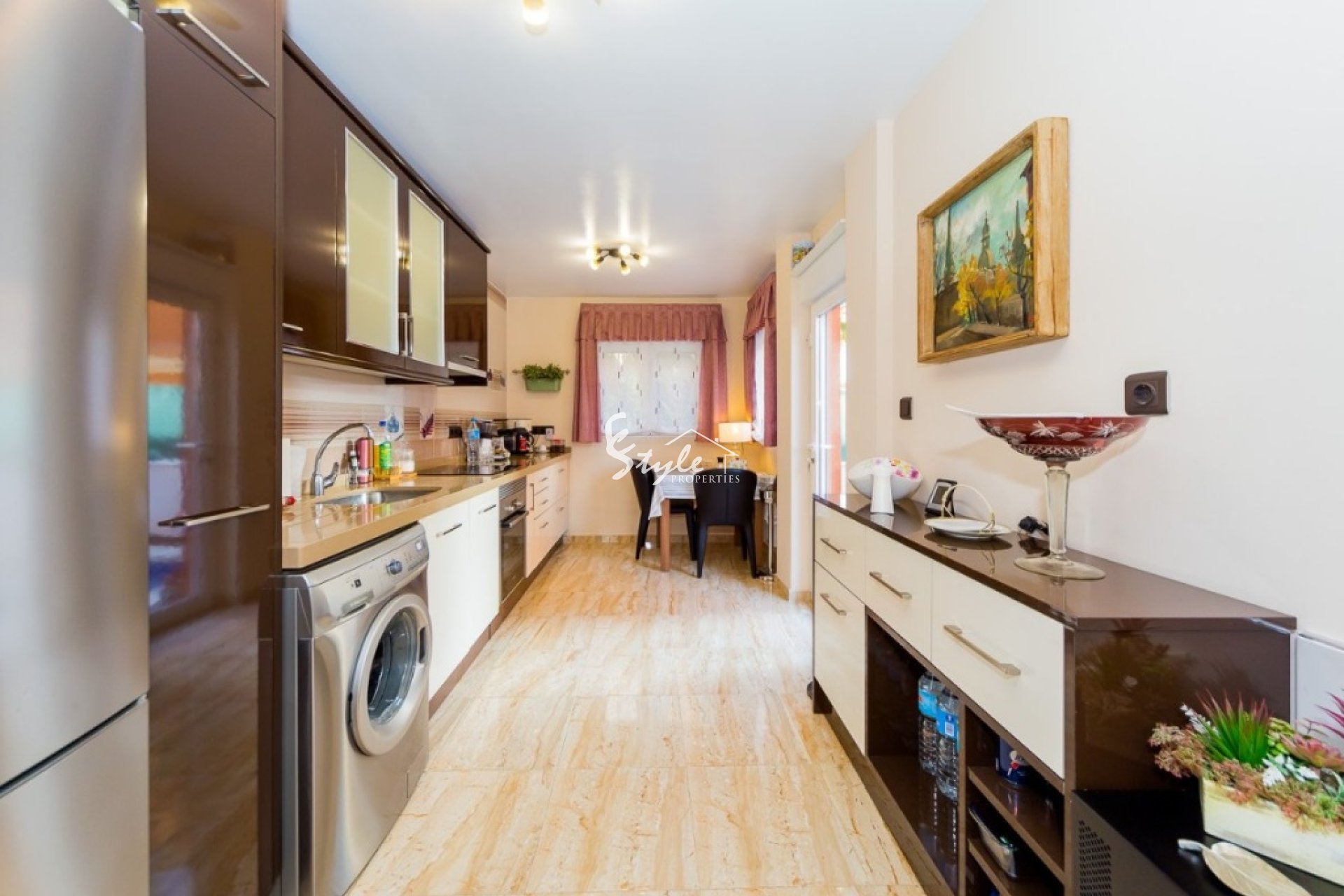 Villa de tres plantas con muebles y electrodomesticos de calidad. Superficie construida 111 m2, luminoso y amplio salón con salida al porche, cocina grande independiente con muebles y electrodomésticos, dos dormitorios con armario empotrados, el de matrimonio con dos zonas adaptadas como dormitorio y como pequeño despacho y vestidor, dos baños completos, solarium, pequeña parcela con piscina y parking. Se vende amueblado y con electrodomésticos, incluido aire acondicionado en toda la casa. Ideal para vivir todo el año y pasar vacaciones junto a la playa. Rentable alquiler de temporada.~~Bonito chalet a estilo clasico en un complejo cerrado con dos piscinas comunitaria, 2004 año de construccion. Se paga poca comunidad.~~Tranquila área Playa Flamenca cerca del enorme CC "La Zenia, El Bulevard" con todos los servicios. Distancia hasta la playa unos 1,5 km