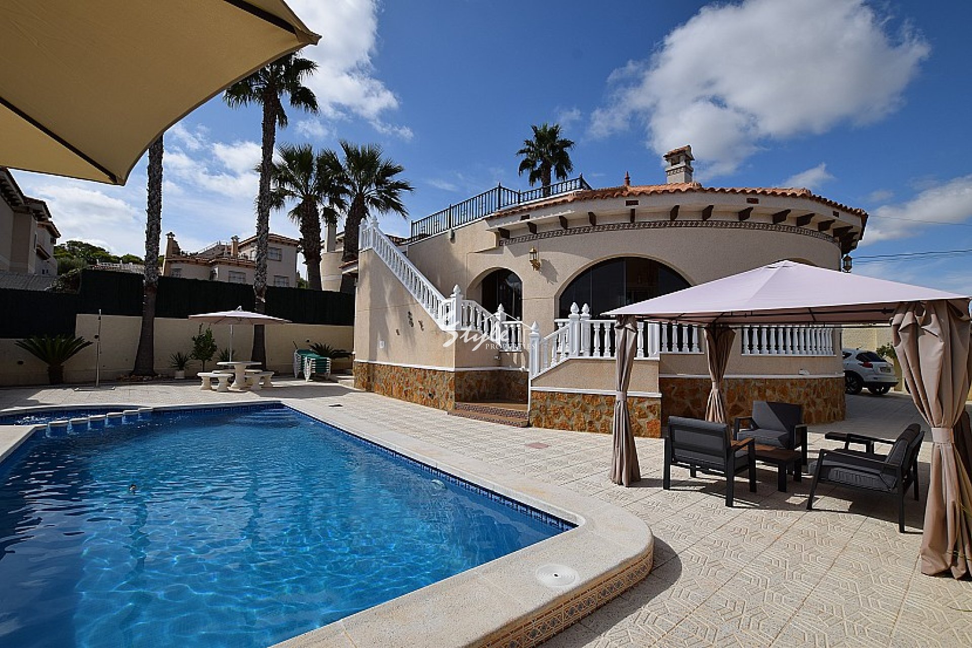 Villa independiente con piscina grande en venta en la codiciada zona de Villas Maria, Orihuela Costa. Esta casa es muy luminosa, para proporcionar una vida con mucha luz natural y disfrutar del clima mediterránea. Está ubicada en San Miguel de Salinas en un pueblo tranquilo con villas de alto valor, diseñadas individualmente y conocidas como las Beverly Hills de los alrededores, a menos de 10 km del mar y las playas. La vivienda dispone de una parcela privada, zona ajardinada y una piscina. La casa consta de 3 habitaciones, 3 baños, cocina medio abierta, amplio salón-comedor con chimenea, una bonita terraza acristalada con orientación al norte en la entrada con un comedor abierto español.
