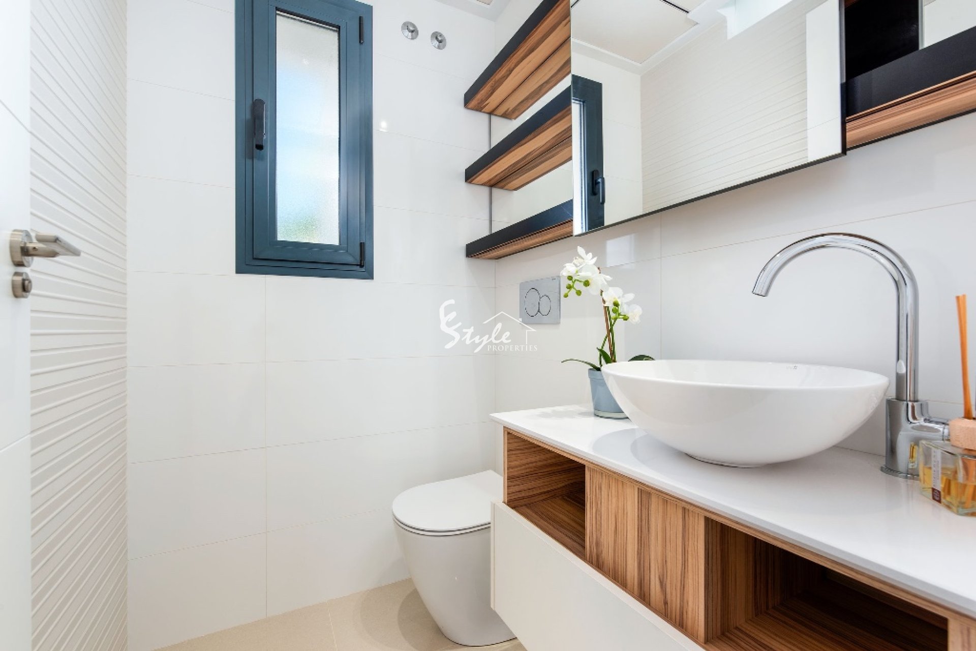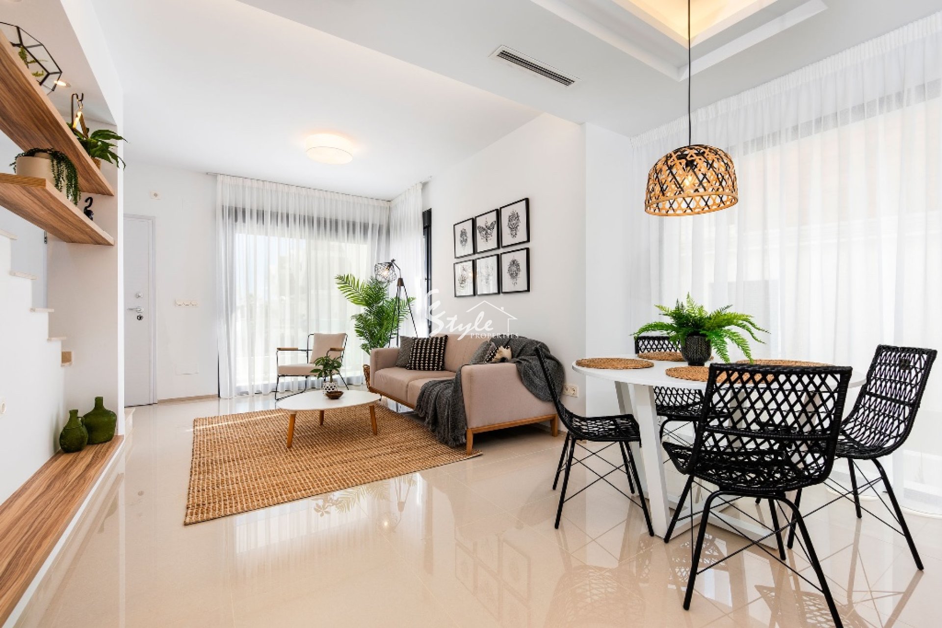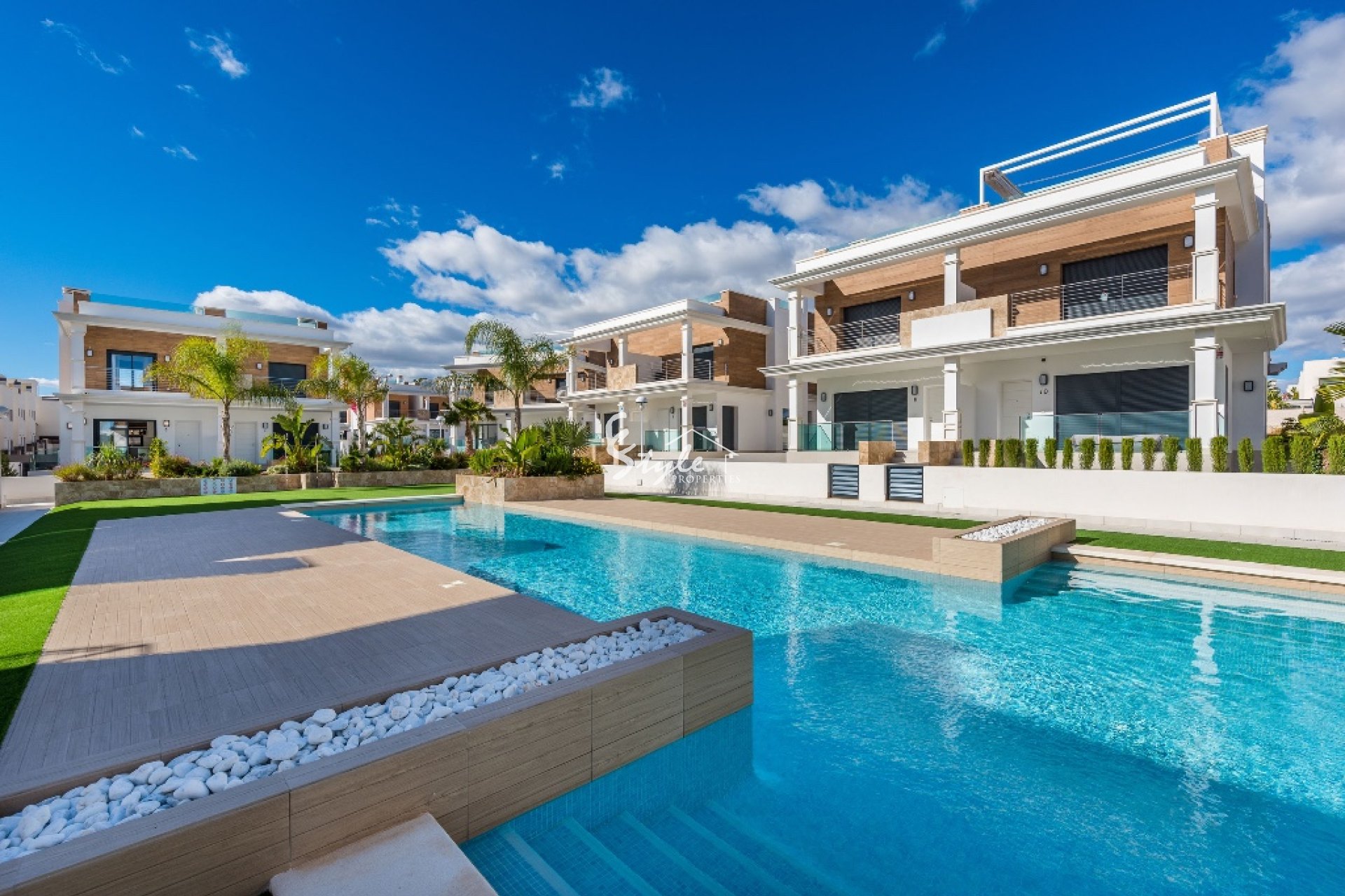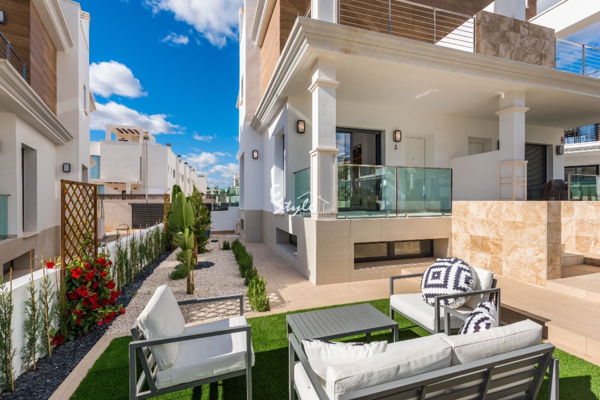 En venta chalet de estilo moderno situada en una urbanización cerca a Guardamar del Segura. La vivienda está compuesta por salón comedor, cocina, 3 dormitorios, 3 baños, terraza, jardín, sótano y solárium privado. Incluye preinstalación de aire acondicionado y suelo radiante en baños.