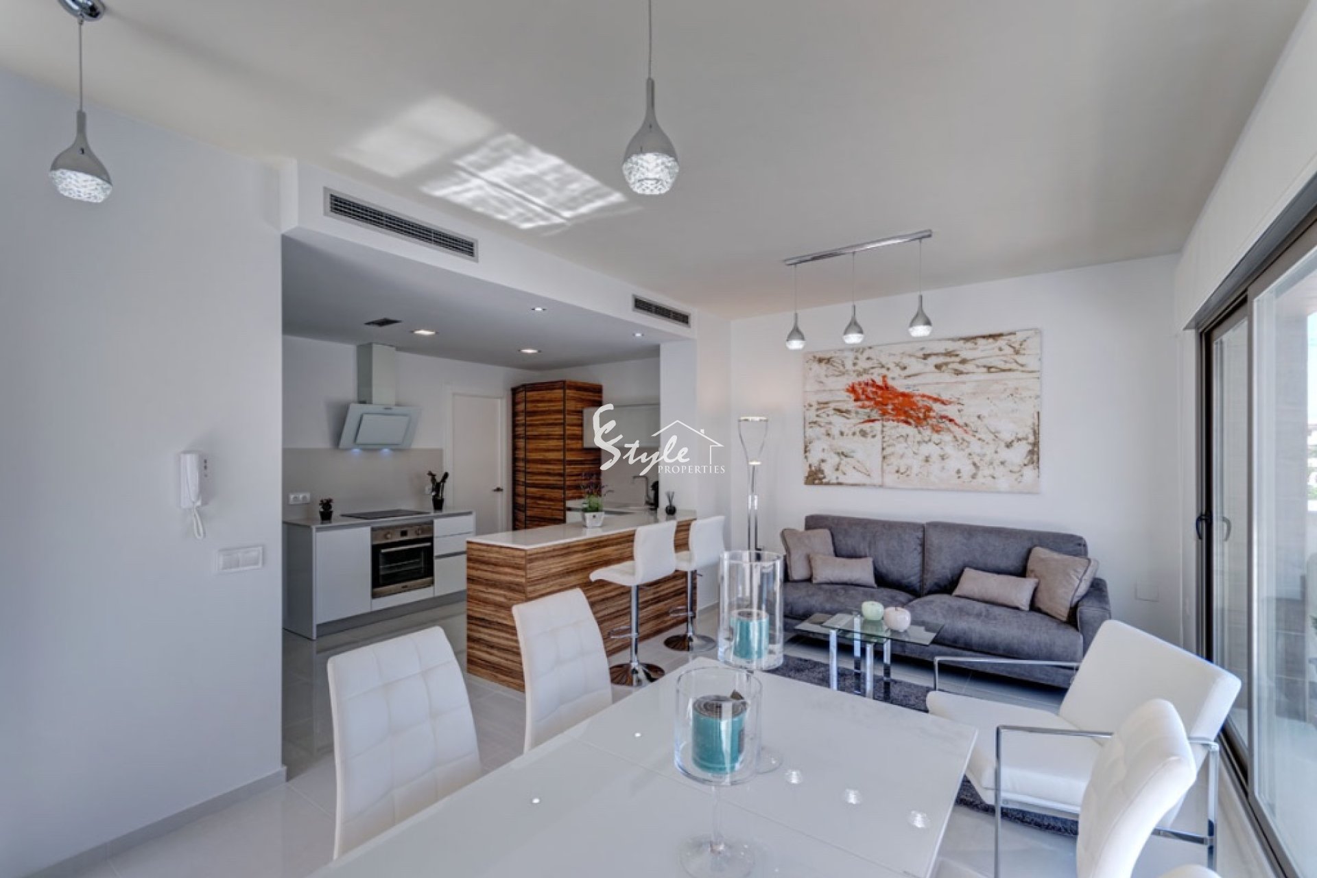 Villa cuenta con 3 dormitorios y 2 baños. Además, cada villa tiene un gran salón, comedor, cocina, terraza y solarium. Todas las ventanas en todos los modelos de villas tienen doble acristalamiento con la función de ahorro de calor. La cocina cuenta con un hermoso mobiliario de diseño contemporáneo y electrodomésticos. Plomería en los baños de los últimos modelos. Todos los materiales utilizados en la construcción y el acabado son de la más alta calidad. Puerta de entrada con cerraduras modernas. Los baños cuentan con calefacción por suelo radiante.