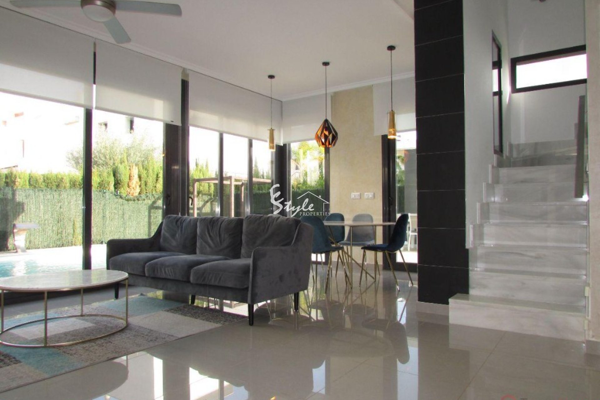 Tenemos a la venta esta casa de diseño contemporáneo en muy impresionante zona residencial de Lomas de Cabo Roig, Orihuela Costa. La casa está cerca del mar, con fantásticas vistas desde el solárium privado. Esta propiedad tiene parcela privada con piscina y bonitas zonas ajardinadas con área de barbacoa, 3 dormitorios, 4 baños, cocina abierta, sala de estar, 2 terrazas. El dormitorio principal tiene armarios empotrados dobles y un baño en suite. Los dormitorios son de buen tamaño y caben camas dobles, tienen armarios empotrados con luz natural. Es una casa con mucho encanto por su ubicación cerca del mar, distribución y entorno. Casa se encuentra cerca de las playas de Cabo Roig y Centro Comercial en los alrededores de La Zenia todos los servicios.