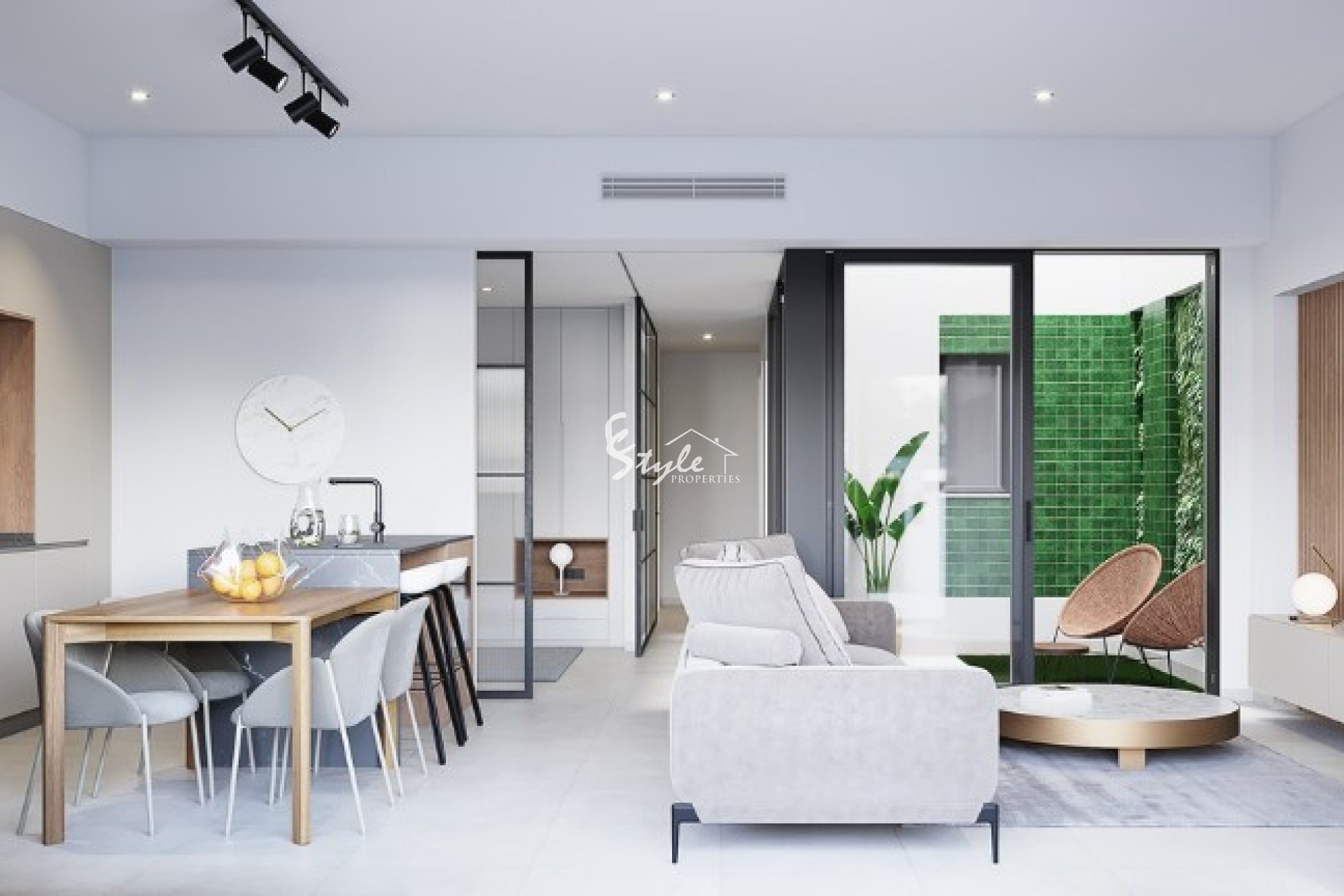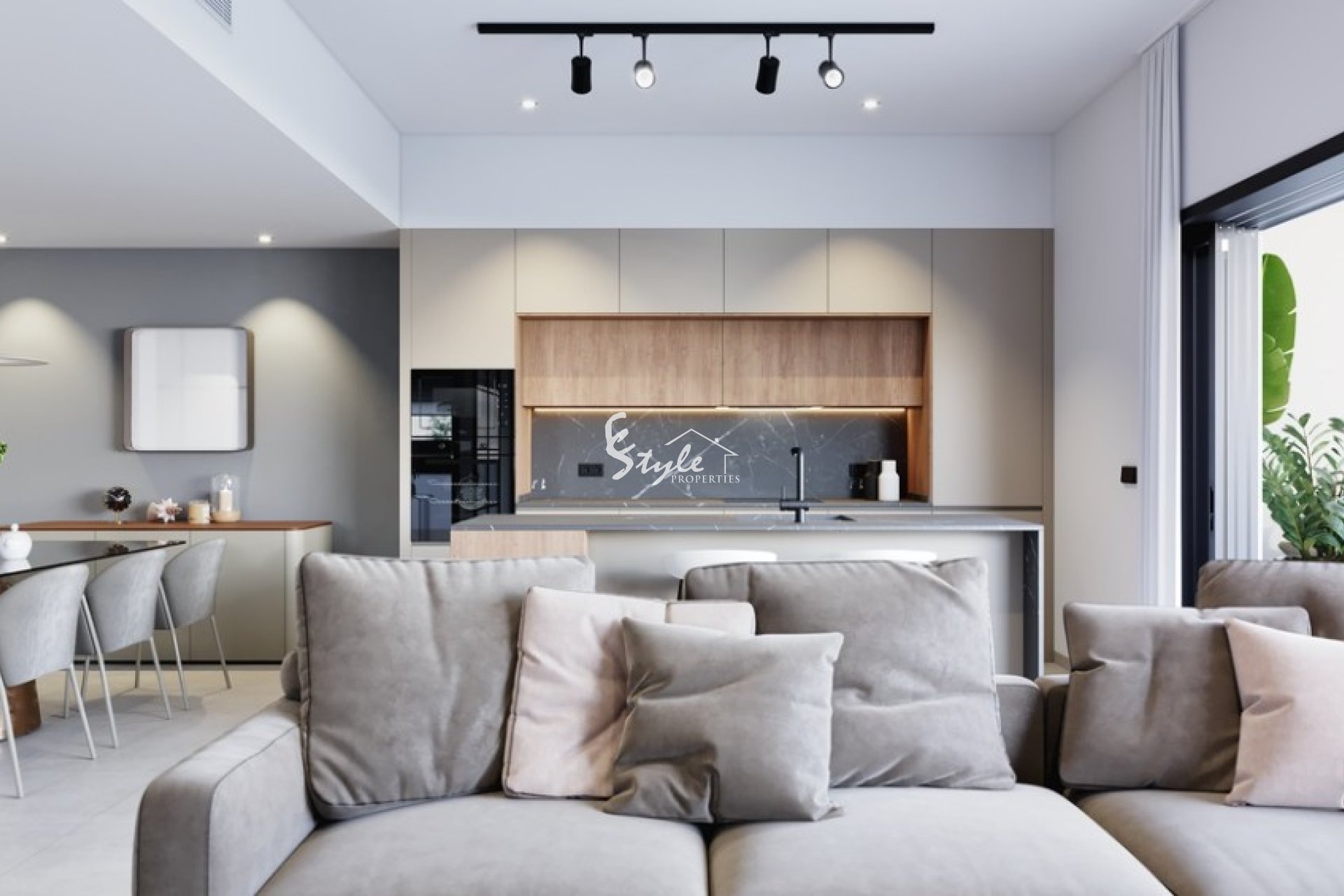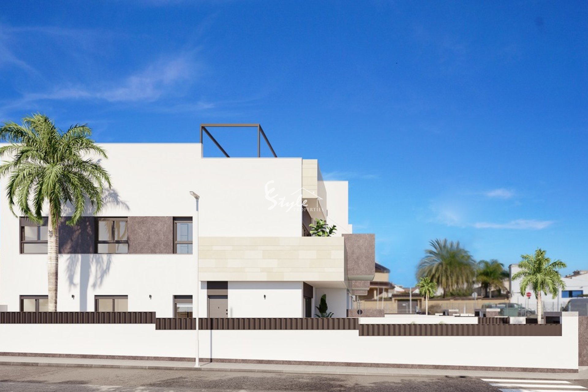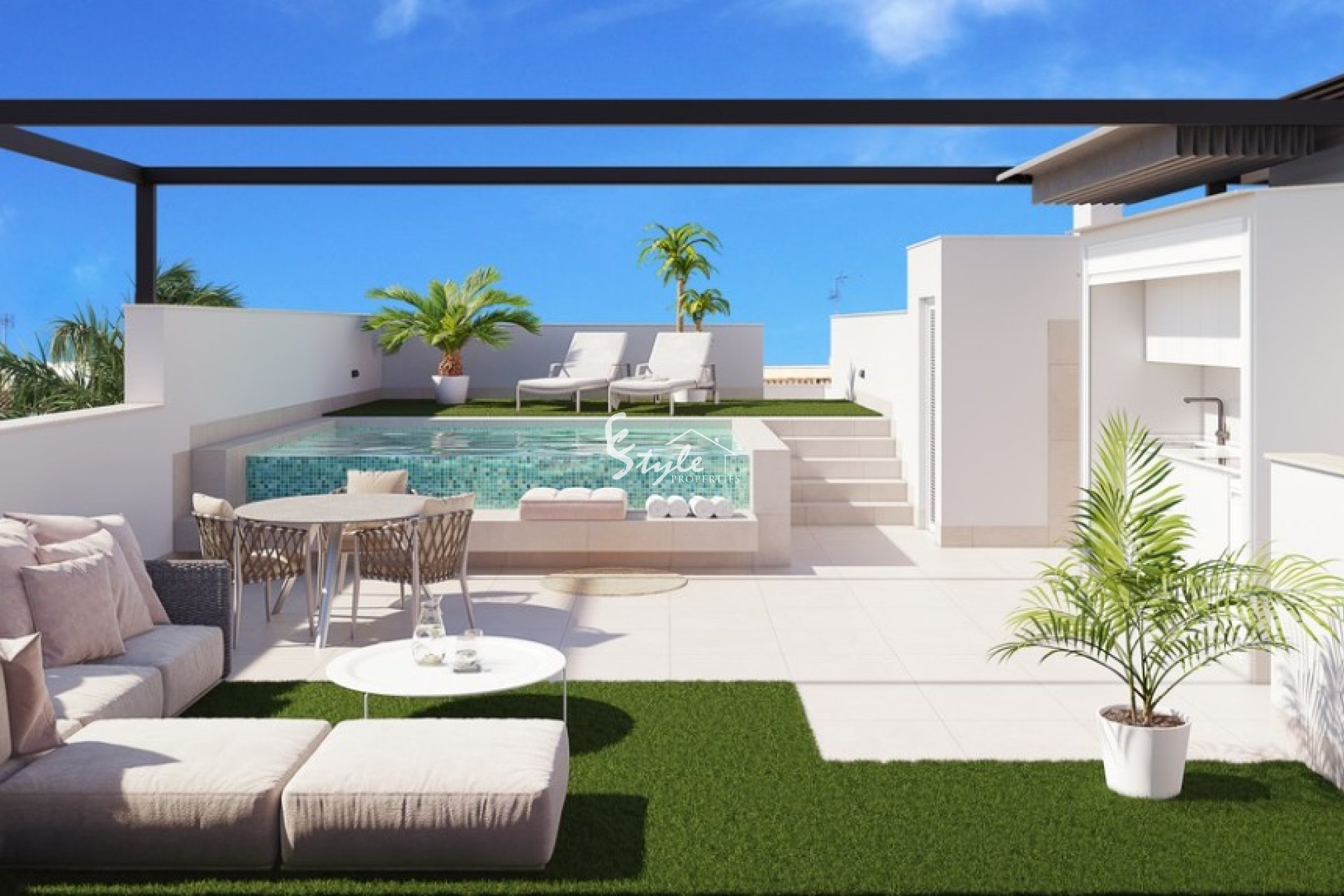 La propiedad de nueva construcción está ubicada en un complejo cerca de todos los servicios. El apartamento de planta alta cuenta con 3 dormitorios, 2 baños con suelo radiante, salón, cocina completa con electrodomésticos Bosch o Siemens, terraza, solárium, piscina privada y aparcamiento.