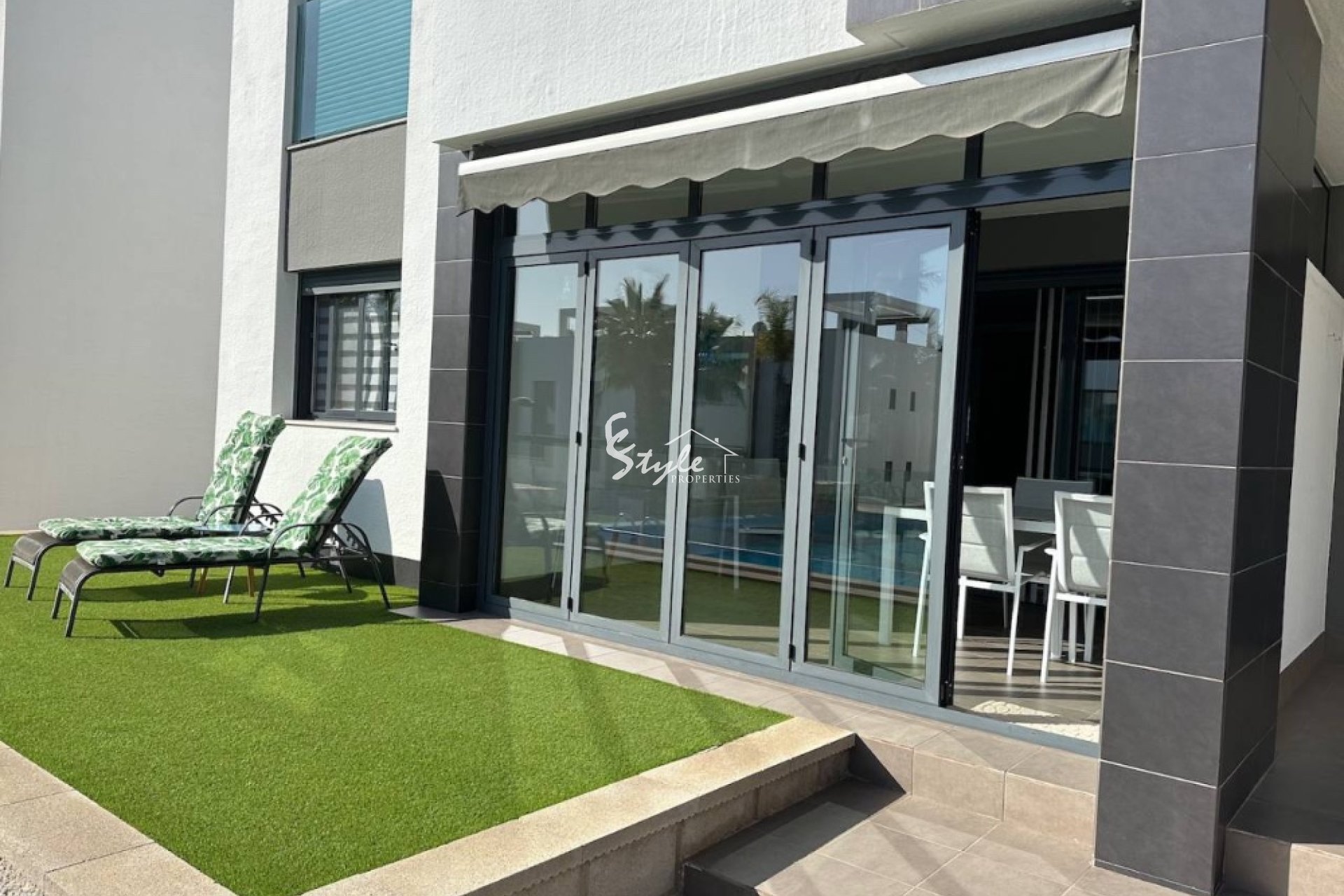 También dispone de todos los extras, como toldo, mosquiteras, aire acondicionado, trastero y terraza adicional en la parte trasera. El complejo encuentra a poca distancia de la hermosa playa de arena de Orihuela Costa, cerca de supermercados, bancos, paradas de autobús, restaurantes y bares. Punta Prima es un famoso resort español ubicado a 40 minutos en automóvil del aeropuerto internacional de Alicante y tiene conexiones de autobús con el aeropuerto y las ciudades vecinas de la costa. Cerca de la costa se pueden encontrar grandes complejos de entretenimiento, supermercados, clubes de golf y deportes acuáticos.