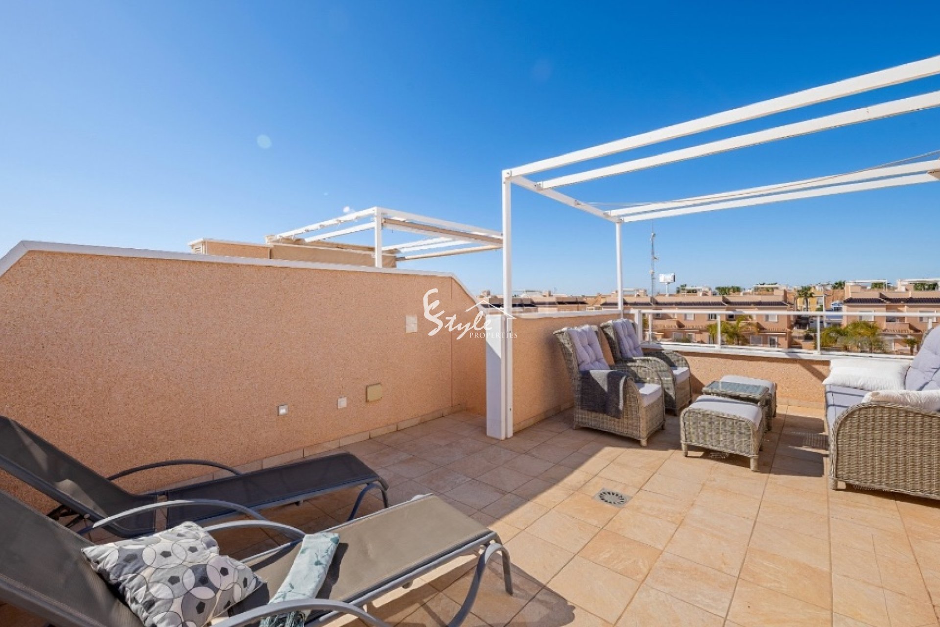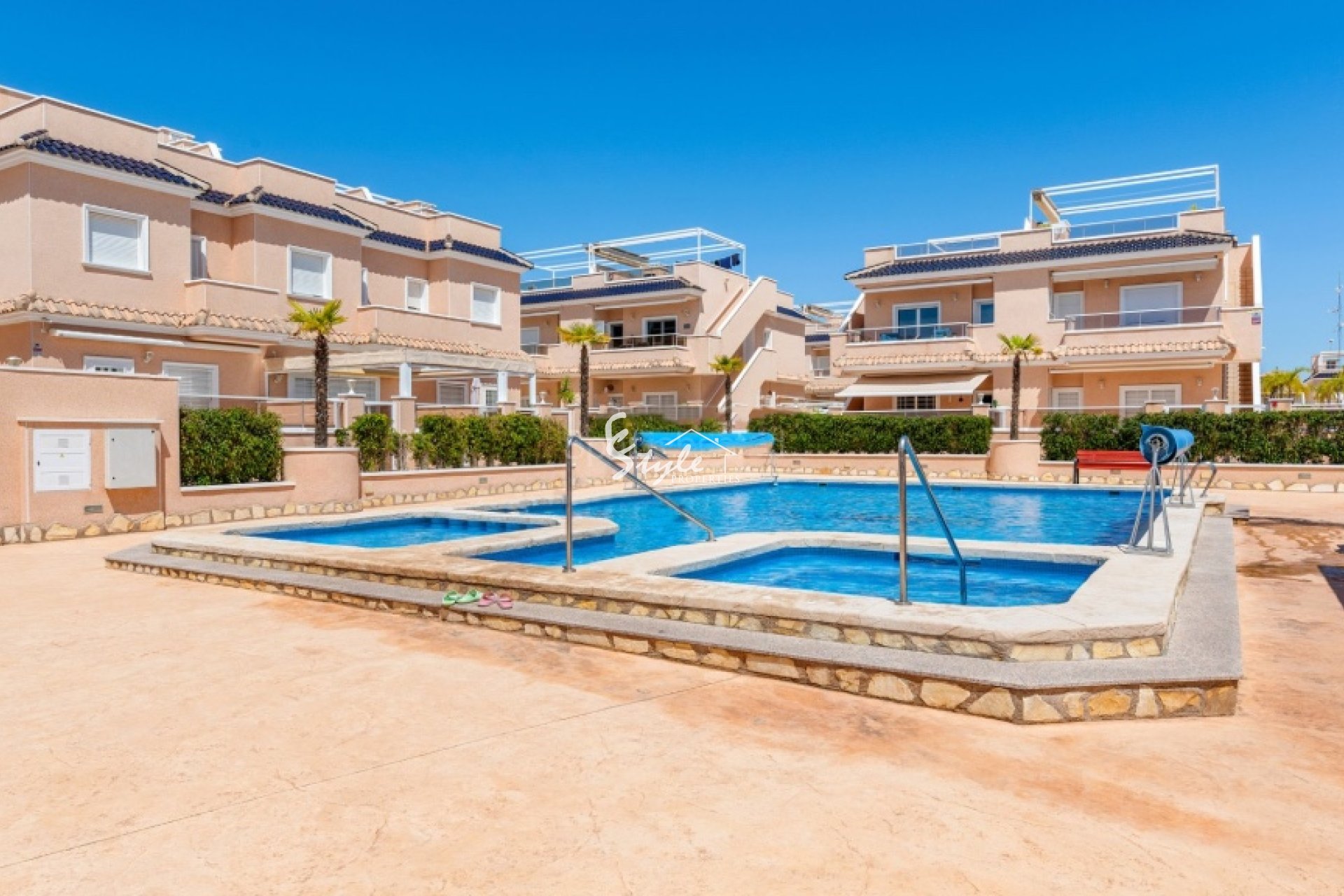 La casa adosada se encuentra en Lomas de Cabo Roig. La propiedad cuenta con 3 dormitorios con armarios empotrados, 2 baños, amplio salón, cocina, terrazas con vista a la piscina, y solarium. Las vivienda tiene parking subterráneo.