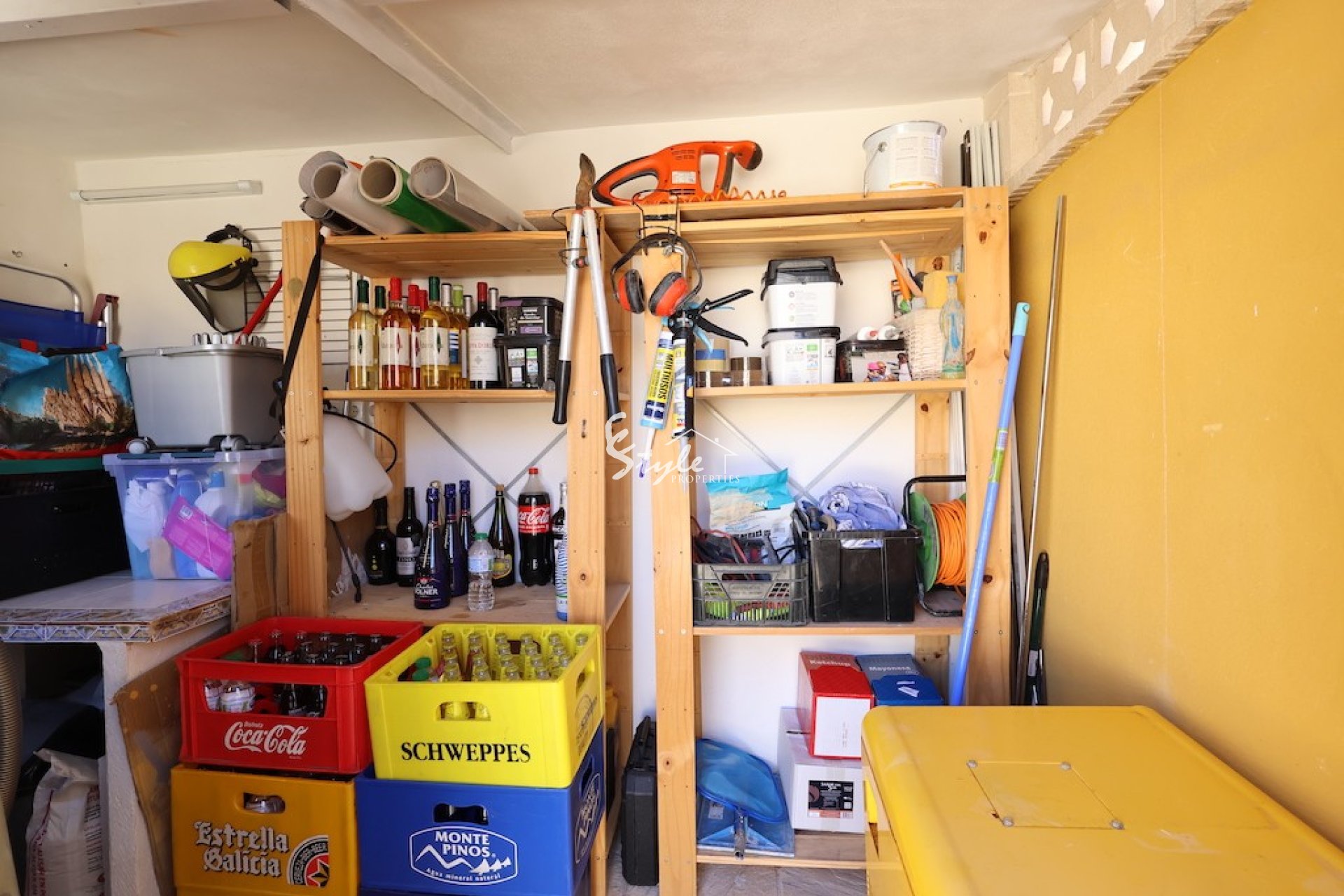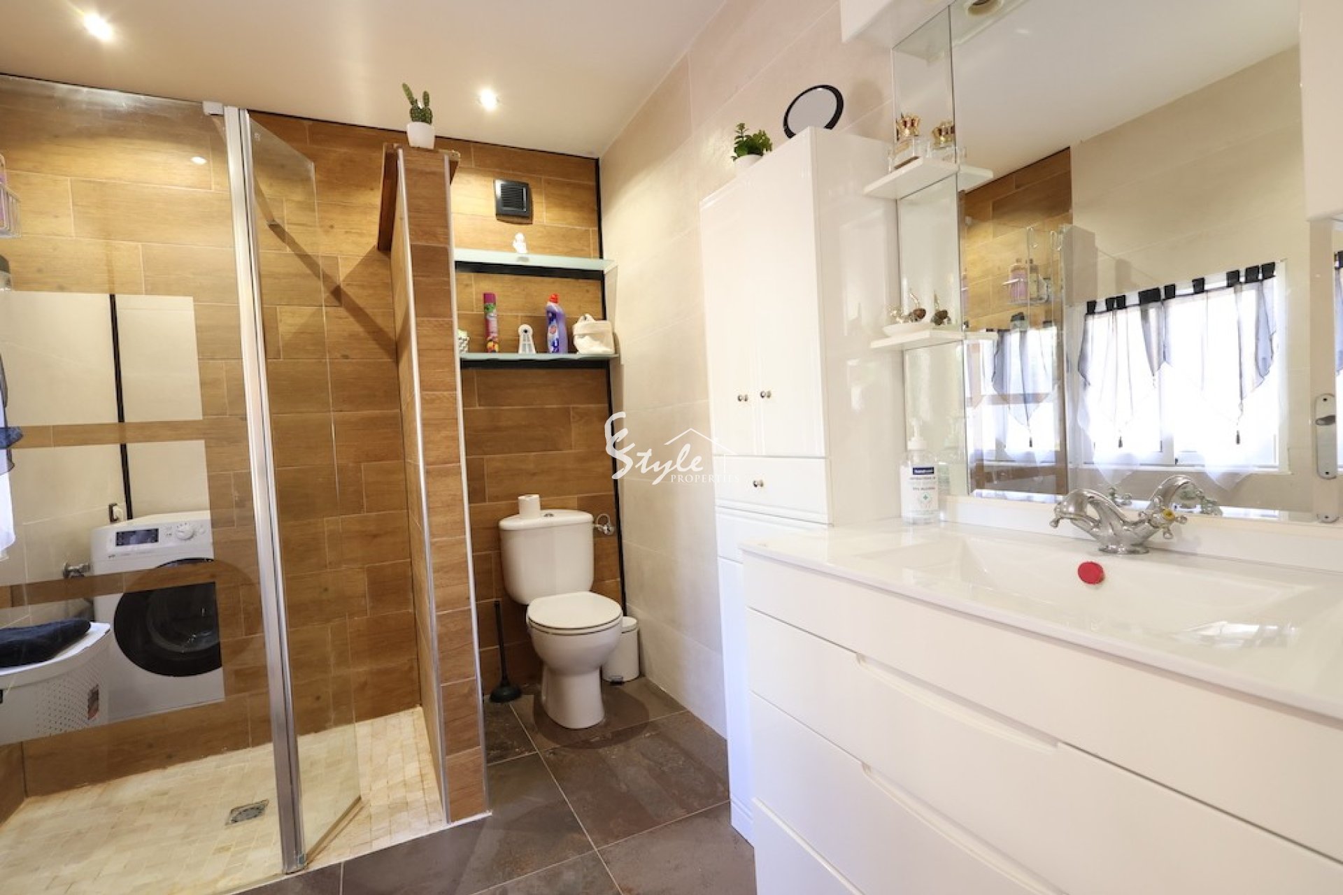 For sale this beautifully designed chalet comes with many extras, making this property a fabulous home. It is located in between the white sandy beach of Campoamor (3 km) and two 18-hole golf courses (3 km) with lots of recently opened bars and restaurants at only some 500 m distance from the property. A semi-detached house with a plot of 279 m2 with a 129 m2 house with 4 bedrooms and 3 bathrooms is distributed over two floors, on the ground floor there are 3 bedrooms, 2 full bathrooms, large living room, separate kitchen, driveway, barbecue area, storage room and private pool (3x6 m) on the upper floor there is an independent apartment with separate access and has 2 terraces, open-plan kitchen, living room, 1 bedroom and bathroom, the entire house is sold semi-furnished and has air conditioning in all rooms. On the glazed terrace is plenty of space for inviting friends on nice evening meals and cocktails or just sit and watch the stars during the warm nights on southern Costa Blanca.