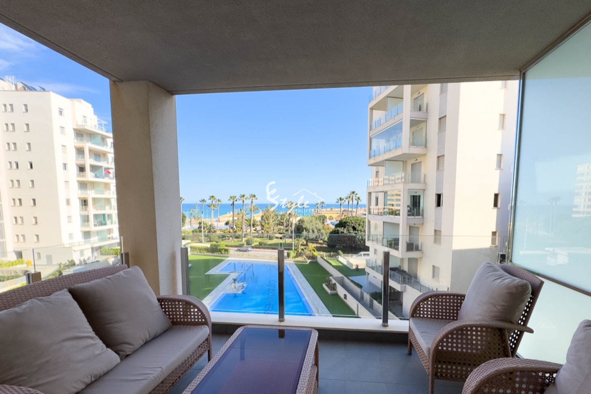 For sale with Sea View- located In the gated community Aquanature. Next to the beach, this apartment has 2 bedrooms, 2 bathrooms, large living room, open kitchen. The property has a terrace with a view a fantastic sea view as well as overlooking the communal pool. The apartment is in perfect condition and is sold fully furnished. The apartment is located within a gated complex with lovely community garden and pool. A few meters from all services and just 120 meters from the sandy beach and the promenade. It has an underground parking space and storage.