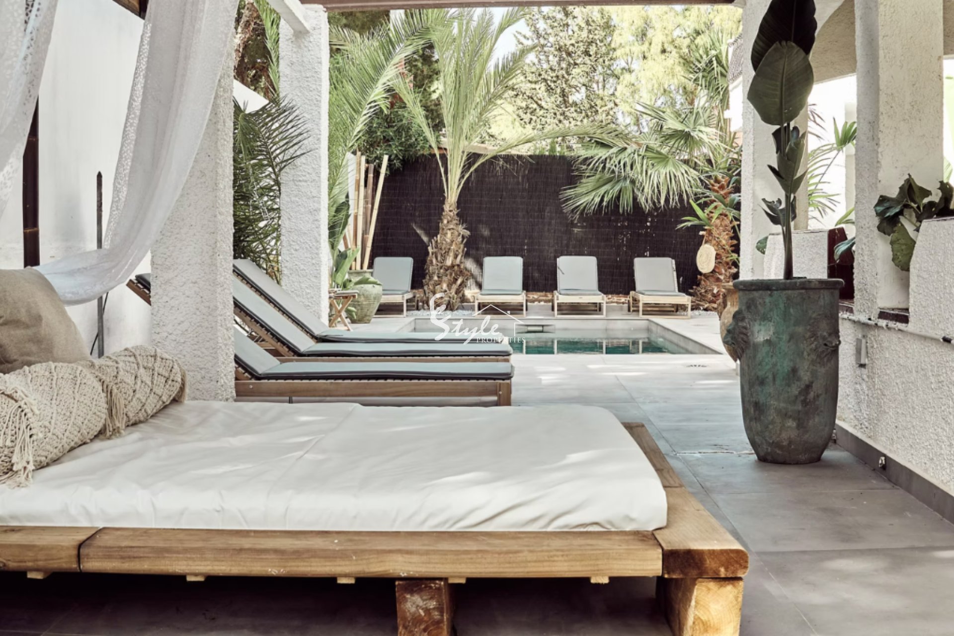 We proudly present this stunning south-facing villa in Punta Prima offers elegant design and modern amenities. Featuring five spacious bedrooms, each with en-suite bathrooms and private terraces, it ensures comfort and privacy for family and guests. The industrial kitchen flows into a grand dining area with beamed ceilings, perfect for entertaining, while a cozy lounge with two fireplaces provides a relaxing retreat.