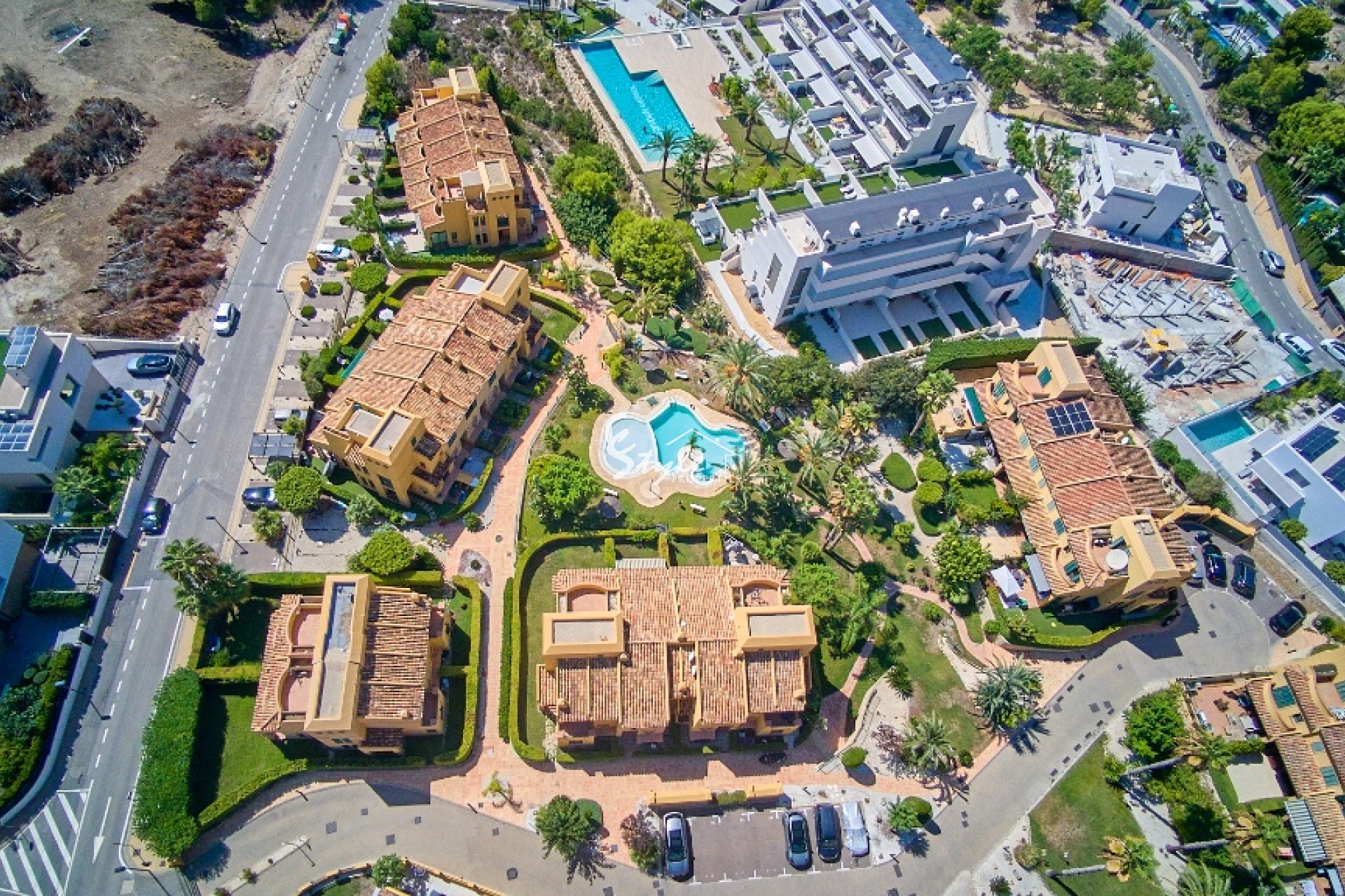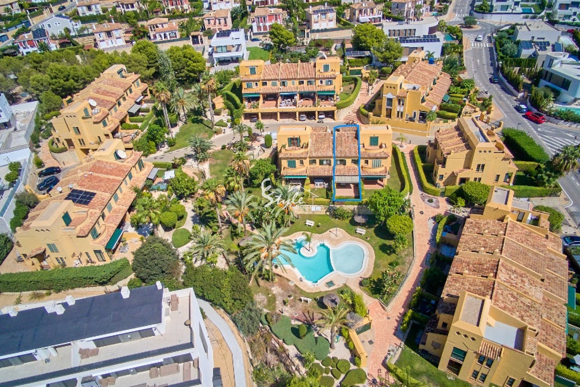 For sale townhouse located in the gated community in Finestrat area Alicante. This property is a perfect retreat for those seeking comfort and tranquility, combined with a vibrant lifestyle. The house has built area of 150 m² and features 3 bedrooms and 2 bathrooms and one service bathroom on the ground floor.