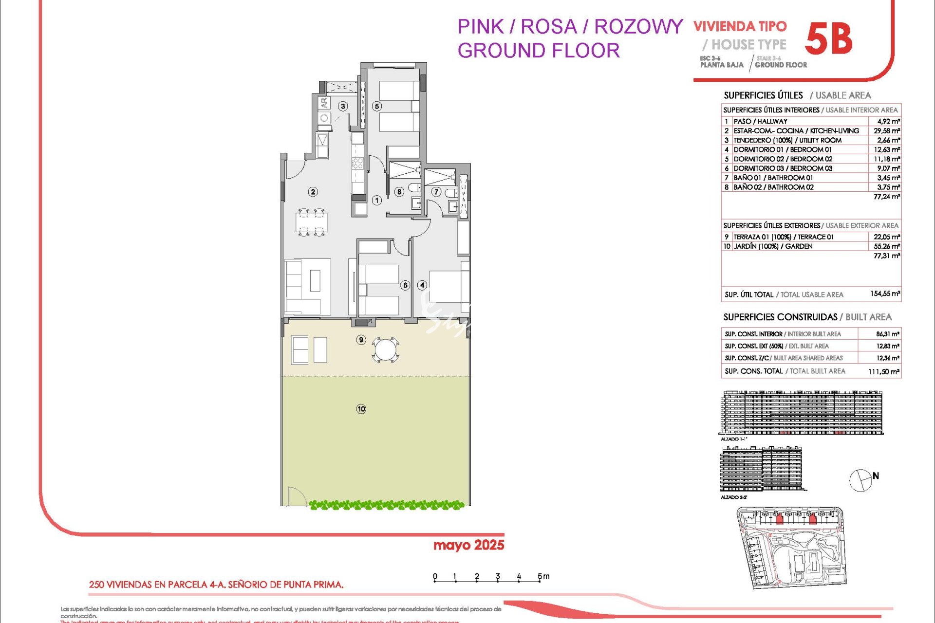 The common areas of this residential complex in Torrevieja are designed to offer a wide range of services and activities for all residents. The complex features a communal pool, ideal for cooling off during hot days, and a communal jacuzzi for relaxation moments. Sports enthusiasts can enjoy a paddle court and a communal gym, allowing for an active lifestyle without leaving the complex. The landscaped areas offer a green and tranquil environment, perfect for walking or enjoying nature. Additionally, the complex includes a communal solarium, a playground for the little ones, and a communal parking area that ensures convenience and security for residents' vehicles.