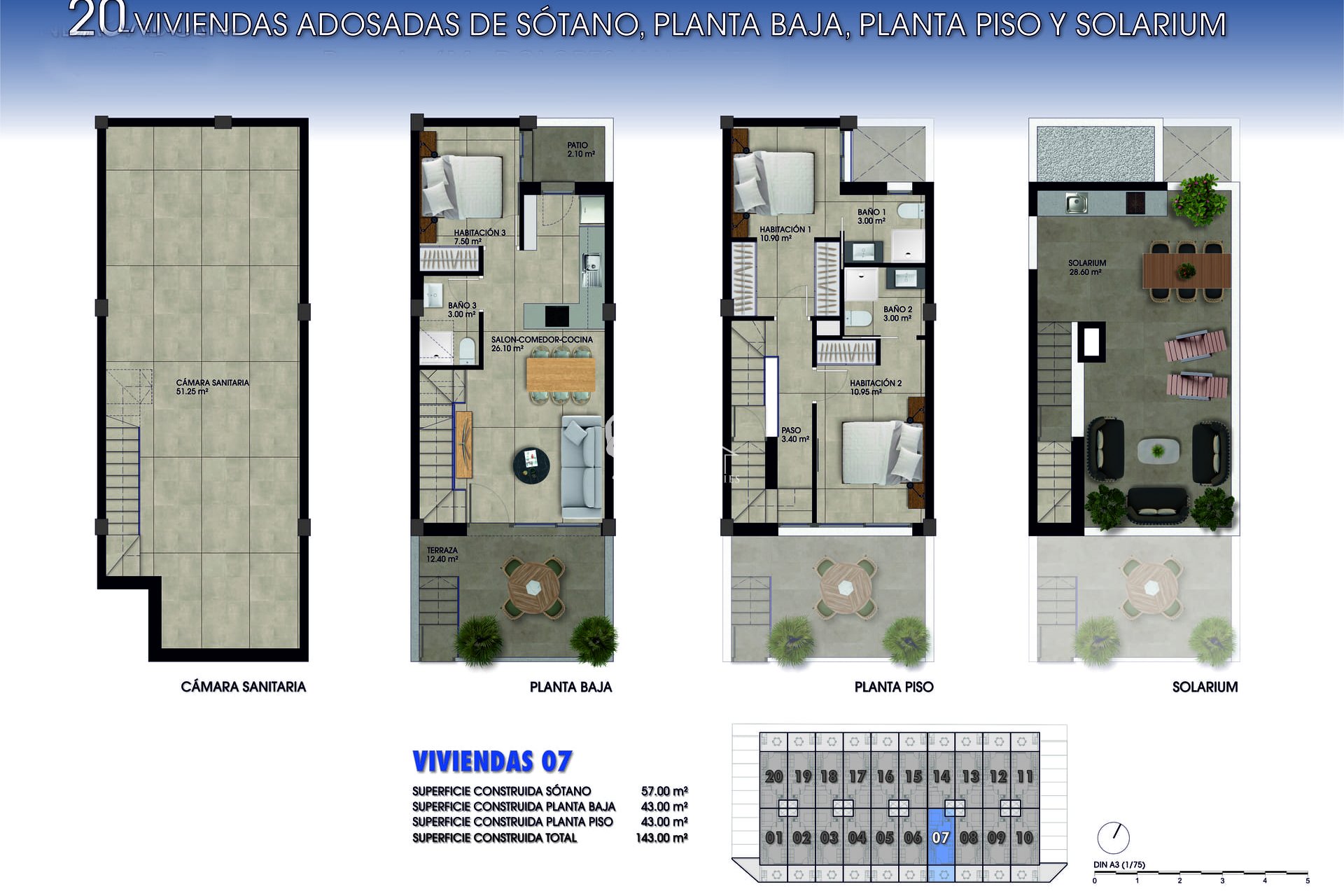 The outdoor spaces of these townhouses in Dolores are designed to maximize enjoyment of the Mediterranean climate. Each home features a private terrace, a perfect space to enjoy outdoor moments, whether relaxing, sharing with friends, or simply enjoying a dinner under the stars. Additionally, the solarium is a standout feature, providing additional space for sunbathing or creating a small urban garden. The exterior architecture harmoniously integrates with the surroundings, offering a modern design that complements the natural beauty of the area.