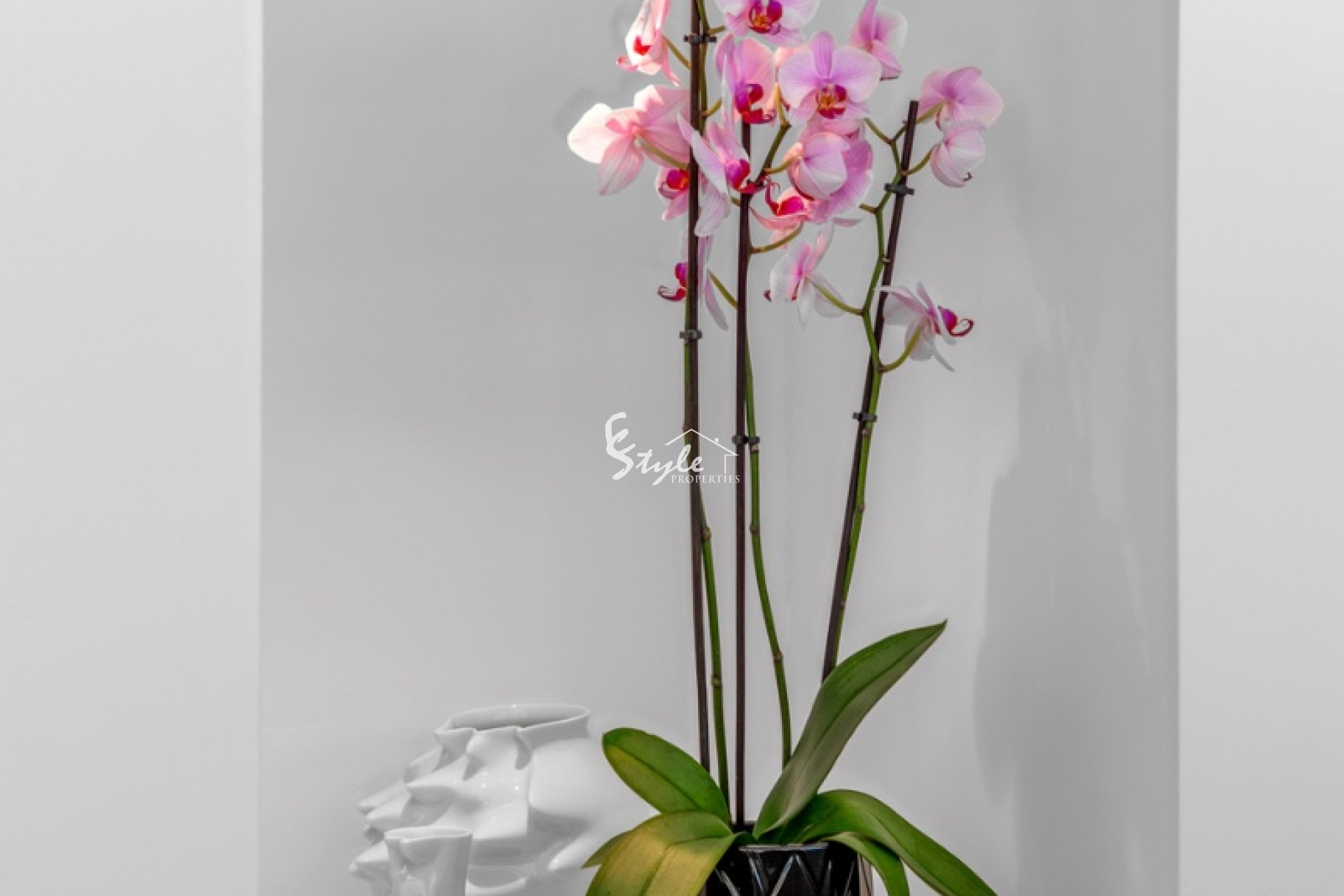 The main entrance is positioned on the north side of the property, while the garden and pool area enjoy a sunny south-facing orientation. Outside, the 36m² private swimming pool serves as a focal point, surrounded by clean, modern landscaping and a selection of lounging and dining areas. A pergola provides a shaded retreat for outdoor meals, and a covered terrace extends the living space outdoors. The rooftop solarium offers open views and a relaxing spot to enjoy the surrounding environment, including partial sea views.