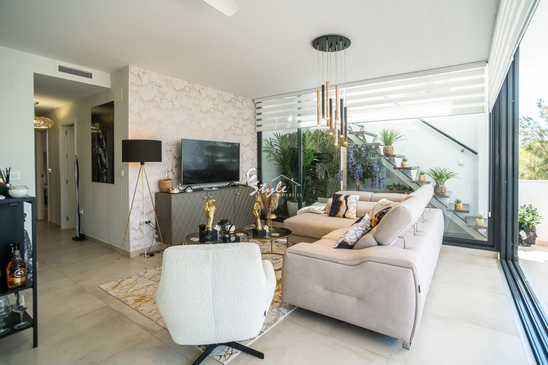 Bathed in natural light, the open-plan living area is framed by floor-to-ceiling glass sliding doors on three sides. Letting the outdoors in and creating a seamless flow to the terrace. The kitchen is streamlined and chic, complete with a breakfast bar ideal for lazy mornings or evening aperitifs.