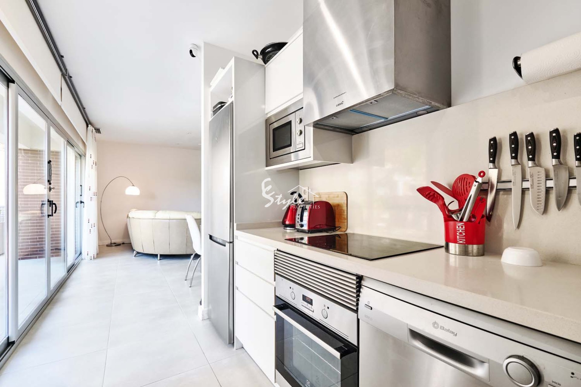 Entering into the apartment via the front door, you are greeted by a light and bright entrance hall, to the left hand side is the master bedroom which is a good sized room with built in wardrobes, there is a double height windows which floods the room with natural light and look out to a terrace area at the side of the apartment. The master bedroom also benefits from a beautiful en suite bathroom with walk in shower. Heading back to the entrance hallway leads to the second bathroom which also has a walk in shower and the second and third bedrooms both with built in wardrobes. The spacious open plan living/dining room is located at the end of the hallway, this space benefits from large sliding patio doors which give lots of natural light but also connect the inside with the terrace, meaning the lovely views can be enjoyed from the living room too. The kitchen is located to the left of the living room it is fully fitted with modern units and there is a door leading out to that side terrace.