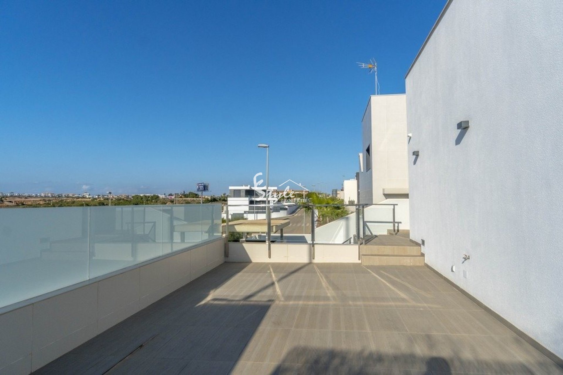 Modern style luxury villa located in Campoamor, only 300 m from the beach. Villa with an area of 200m2, built on a plot of 500m2, the house has 4 bedrooms, 3 bathrooms, living room, kitchen, terrace and solarium of 46m2 with sea views. The outside part has a private pool 8x4. Underfloor heating in the bathrooms, centralized air conditioning installed, parking on the plot. Top quality materials. Heated saltwater pool. It is close to all services, schools, just 10 minutes by car from the largest shopping center in Alicante, Zenia Boulevard, 40 minutes from Alicante airport and a few minutes from some of the best golf courses.