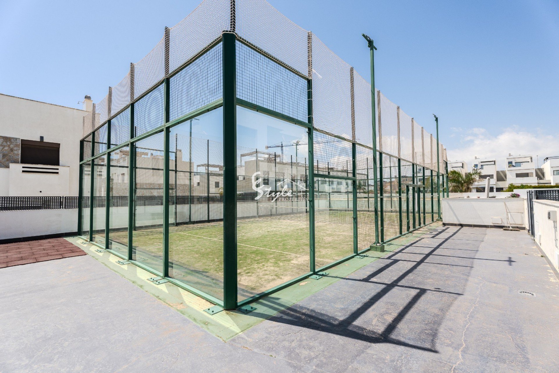 The communal areas include a large swimming pool surrounded by green spaces, ideal for sunbathing, as well as a paddle court for those who enjoy staying active. Everything is designed to create a calm and pleasant environment, perfect for the whole family.