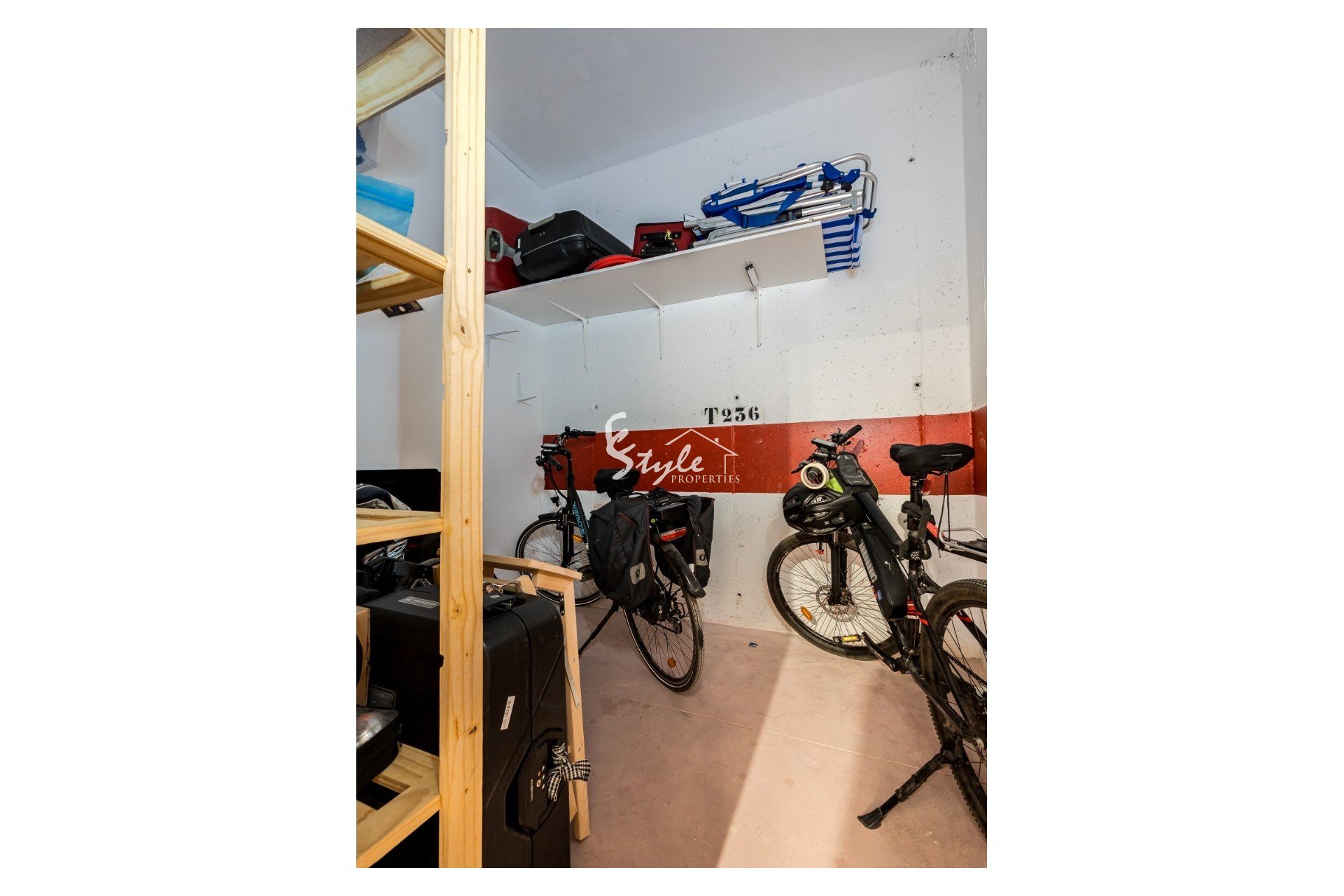 The apartment has central air conditioning, electric blinds, and underfloor heating in both bathrooms. It comes with a dedicated parking space in the underground garage and a storage room, which is fitted with shelves and practical storage solutions. The property is sold partially furnished.