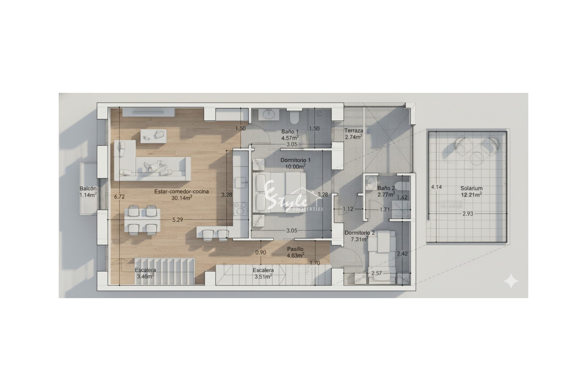 Upon entering the property, a private staircase leads to the main level, where you’ll find a bright two-bedroom, two-bathroom apartment designed in a contemporary style with natural materials. The main area offers an open-plan living-dining-kitchen space of over 30 m², bright and welcoming, with access to a small balcony.