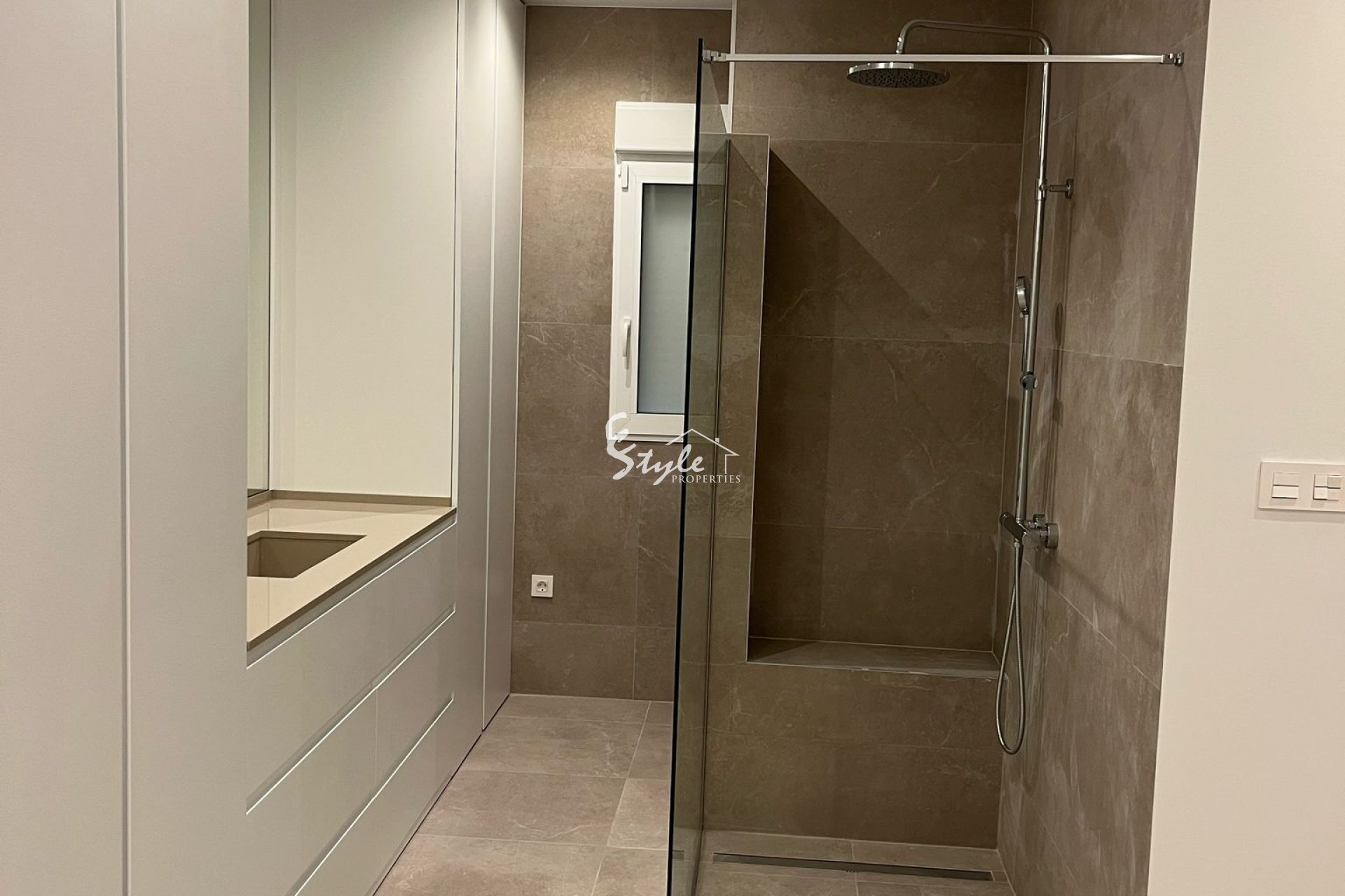 The interior of the villa is carefully designed to offer comfort and style. It features three bedrooms, making it perfect for families or those needing extra space for guests or an office. The two bathrooms are equipped with modern finishes. The porcelain tile flooring adds an elegant touch and is easy to maintain. Electric shutters and air conditioning ensure a comfortable environment year-round. The kitchen is equipped with modern appliances, facilitating daily tasks. Built-in wardrobes in the bedrooms offer ample storage space, maintaining order and organization.