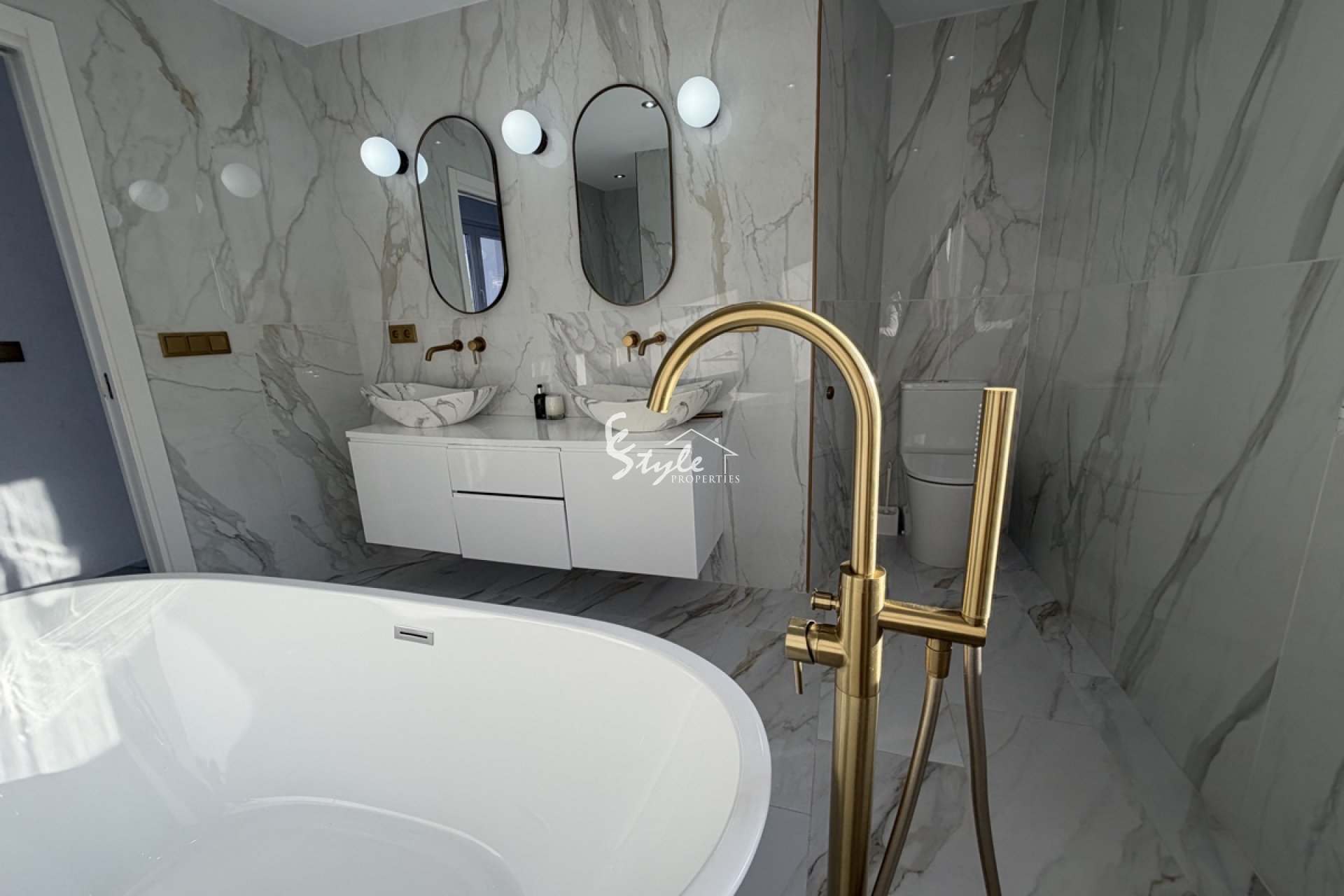 A concealed door within the kitchen reveals three generously sized bedrooms that share a beautifully appointed family bathroom with a bathtub.