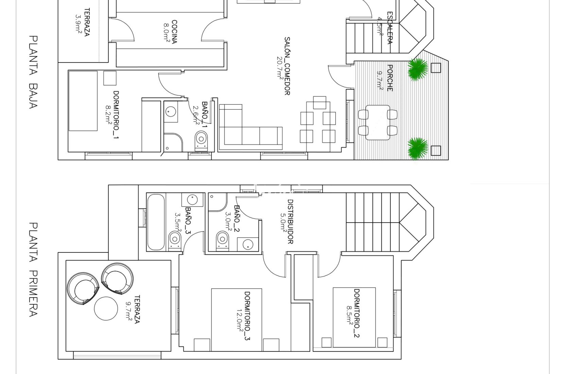 The exteriors of these independent homes in San Fulgencio are designed to maximize enjoyment of the Mediterranean climate. Each property features a private garden, perfect for creating a personal green space or enjoying outdoor activities. Additionally, the spacious terraces allow for full enjoyment of the views and surroundings, providing an ideal place to relax or entertain guests. The inclusion of a private solarium is a standout feature, offering additional space for sunbathing and enjoying panoramic views.