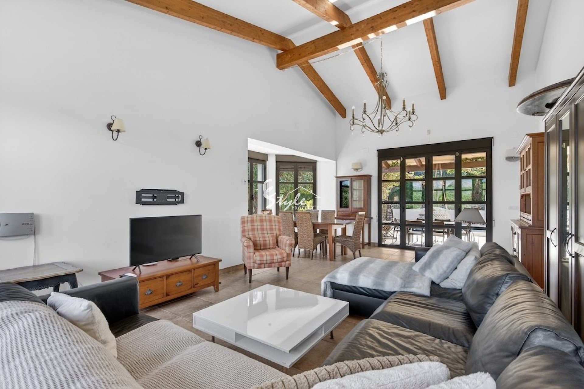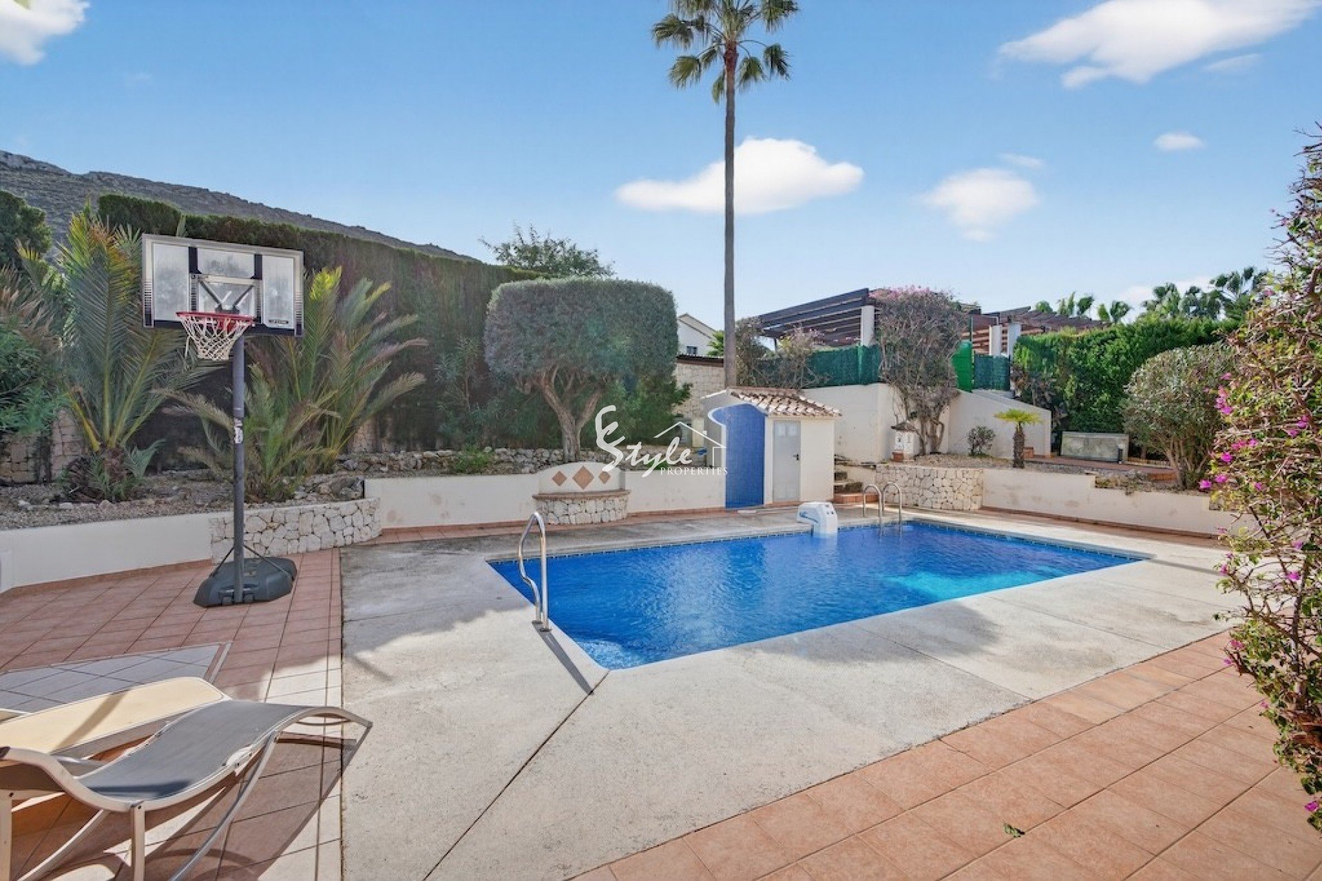 Outside, there is a private swimming pool and a covered dining area – a functional space for relaxing and social gatherings for most of the year. The south-facing orientation guarantees excellent sun exposure, and the view of the Montgó massif adds further value and highlights the property’s location.