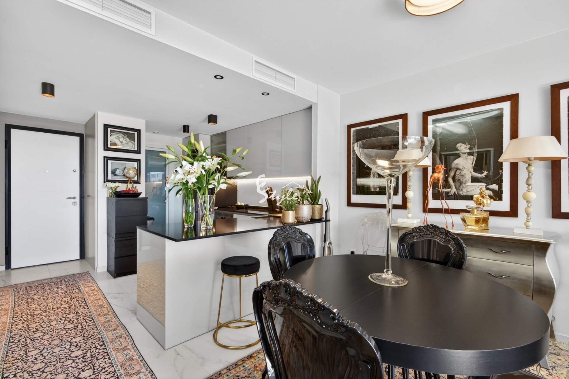 The apartment itself features two spacious bedrooms and two modern bathrooms, both equipped with underfloor heating for added comfort. The master bedroom includes an en-suite bathroom and direct access to the balcony, creating a seamless indoor-outdoor living experience.