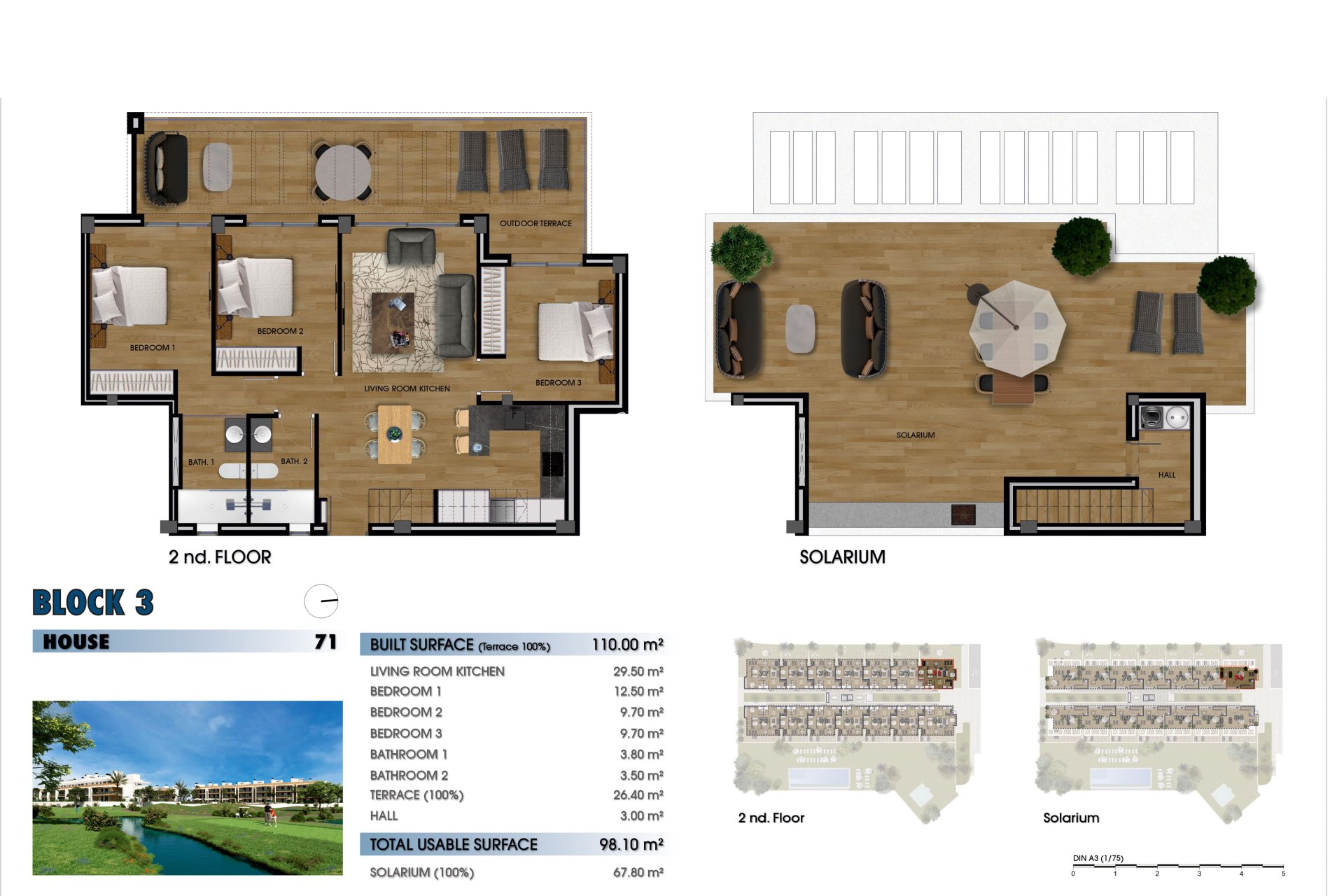 The interior of the homes is designed to offer maximum comfort and functionality. Layout options include homes with 2 and 3 bedrooms, all with 2 bathrooms, ensuring ample space for families of different sizes. The kitchens are equipped with modern appliances, and the air conditioning system, along with additional pre-installation, ensures a pleasant environment throughout the year. Electric shutters and the video intercom add a touch of modernity and security. Built-in wardrobes offer efficient storage solutions, keeping spaces tidy and clutter-free.
