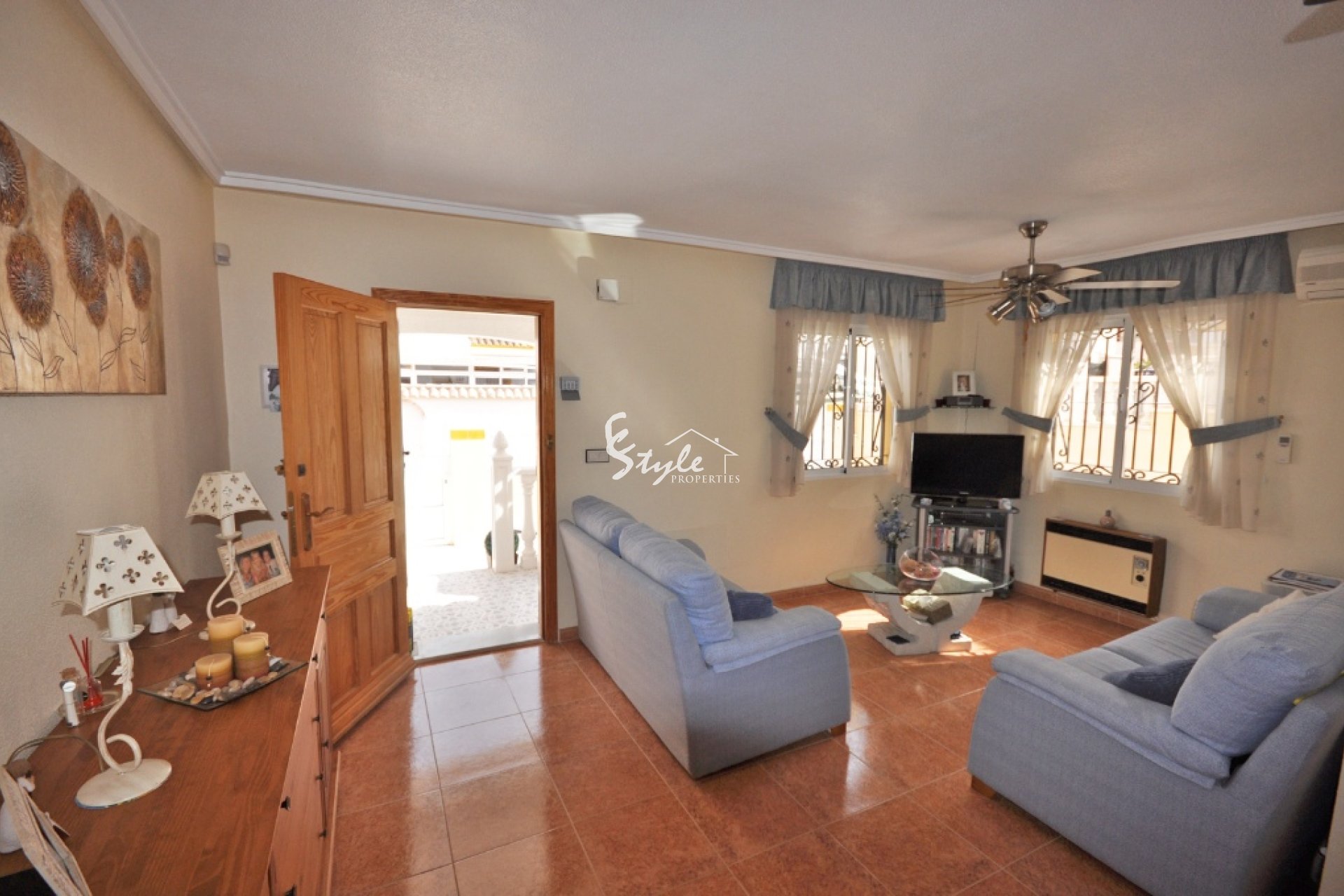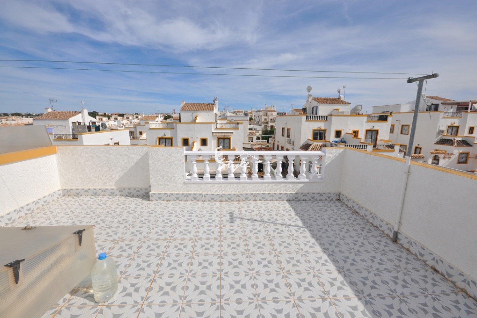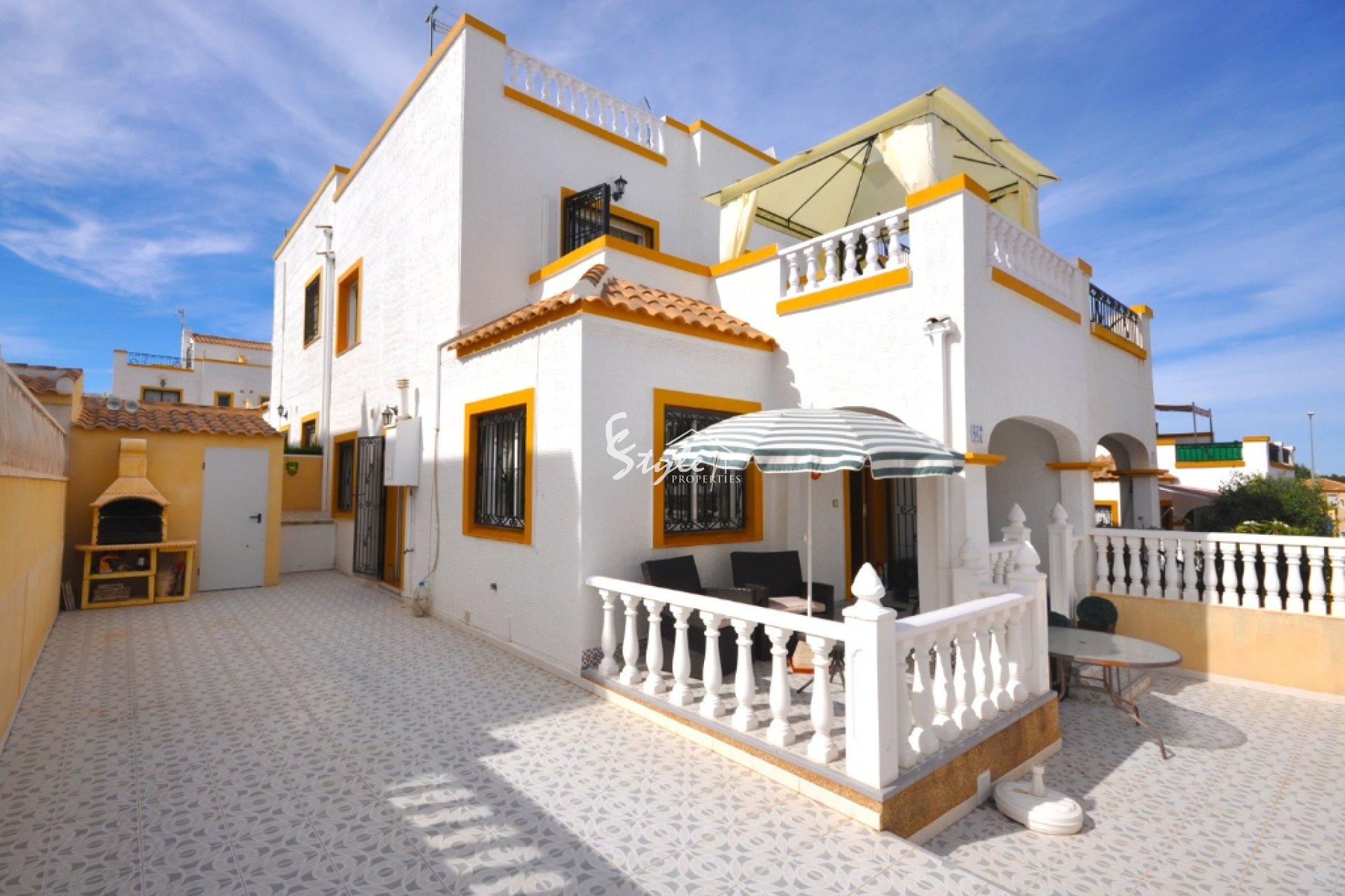 This south facing quad house offers 3 bedrooms, 2 bathrooms, spacious living and dining room, separate kitchen with the exit to the patio, terrace and large solarium. Outside you will have a nice outside area, storage room, off road parking. There are 2 communal pools as well.
