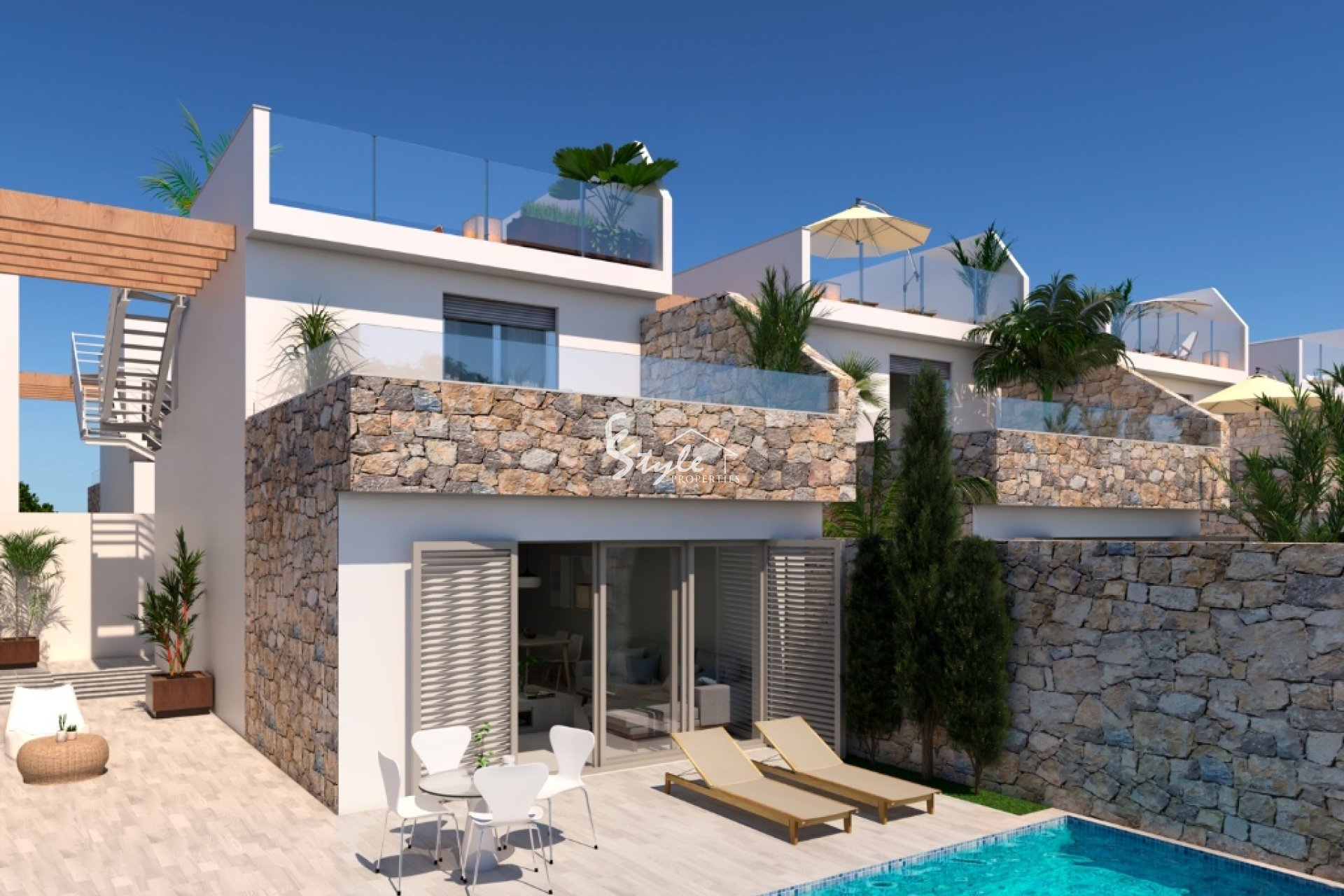 A new complex with 39 independent villas is located only 400 meters away from the beach. Villas with 3 bedrooms, 2 bathrooms with underfloor heating, spacious living and dining area, kitchen, terrace and a solarium. Outside you will enjoy a lovely garden area and a private swimming pool.