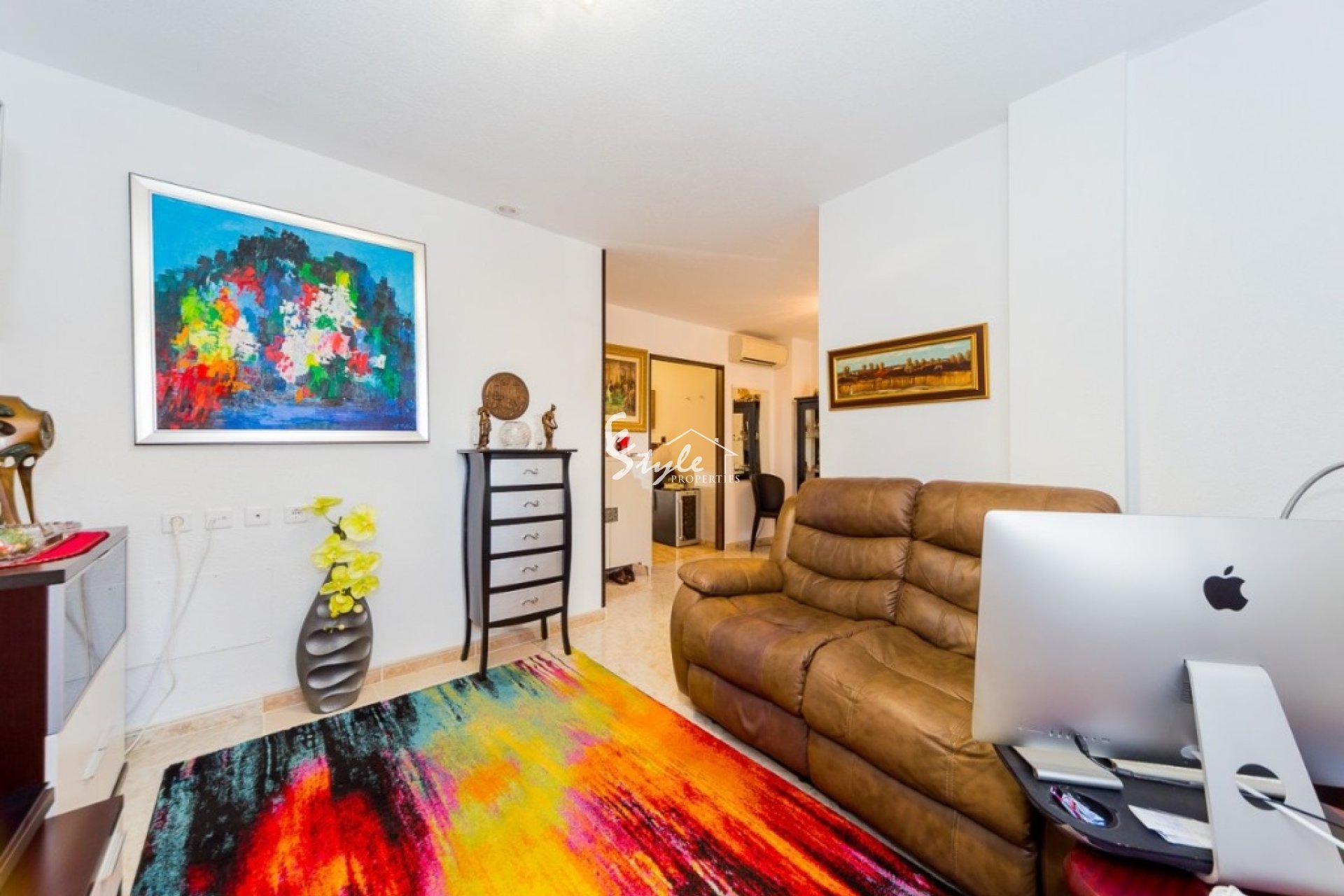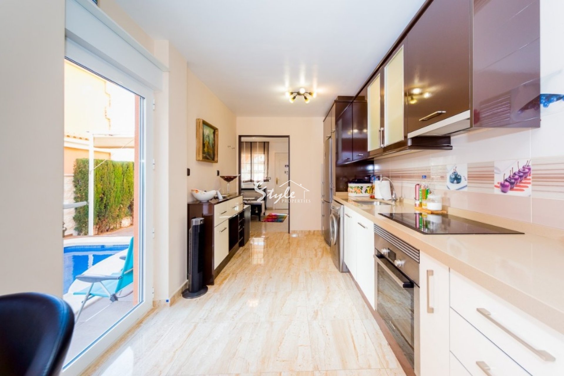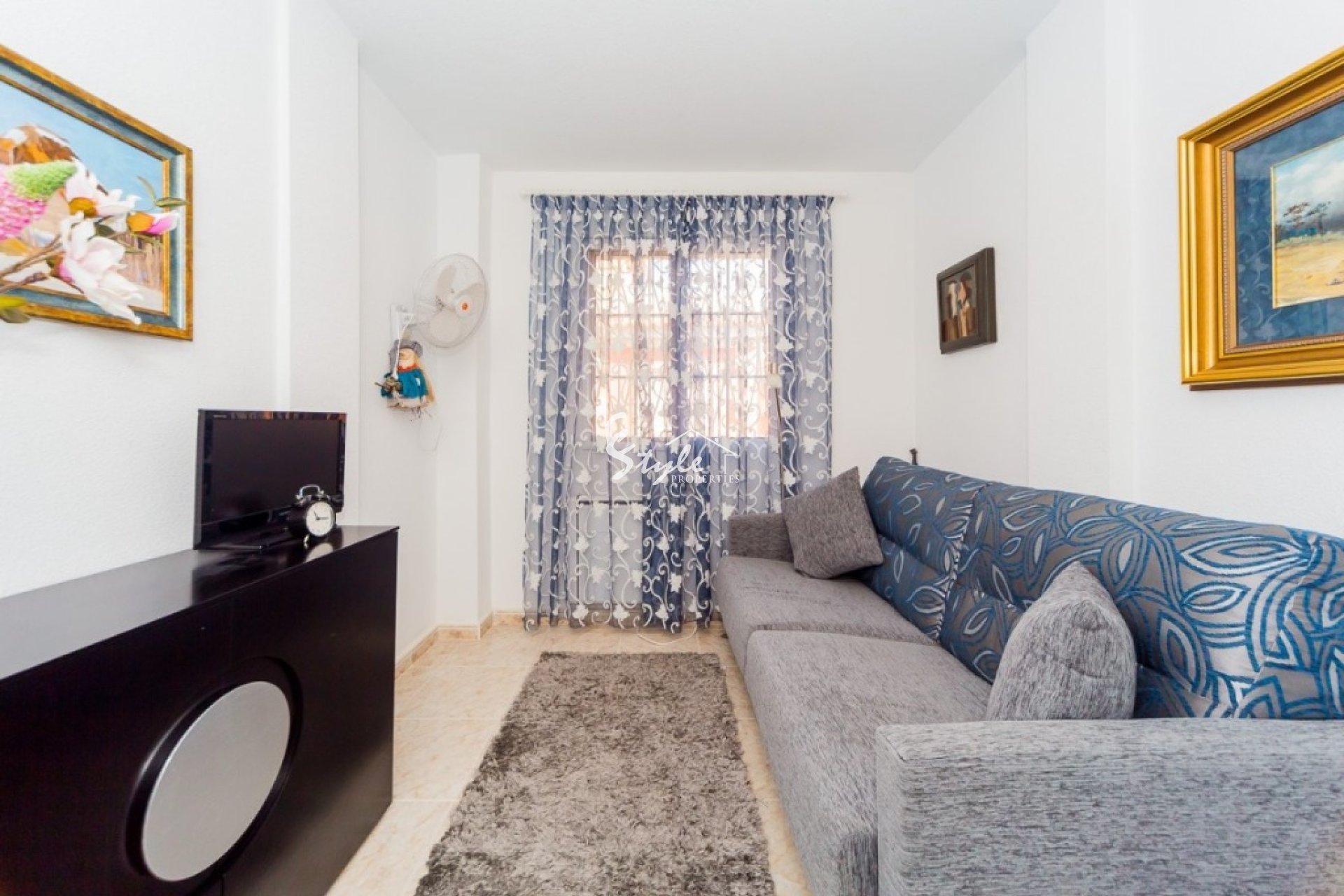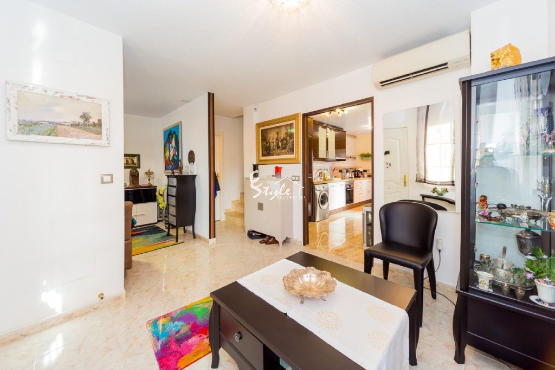 Villa like new of three floors with furniture and quality appliances. Built surface 111 m2, spacious living room with access to the porch, large kitchen with furniture and appliances, two bedrooms with wardrobes, the double with two areas adapted as a bedroom and as a small office and dressing room, two bathrooms, solarium, small plot with pool and parking. For sell furnished and with appliances, including air conditioning throughout the house. Ideal to live all year and spend holidays next to the beach. Cost effective seasonal rental.~~Beautiful villa in a classic style in a gated complex with two pools, 2004 year of construction. The little community fees.~~Quiet Playa Flamenca area near the huge CC "La Zenia, El Bulevard" with all services. Distance to the beach about 1.5 km.