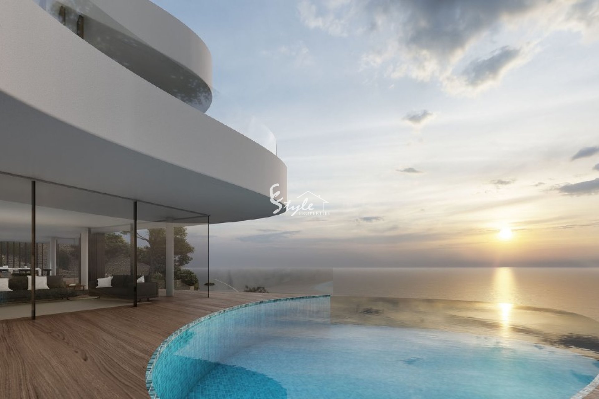 Next construction of 8 exclusive luxurious villas with private pool, near the sea in the prestigious region of Benidorm. A natural stronghold that perfectly blends sun, sea, and mountain, where the sea and sky blues meld together to give us the gift of a perfect landscape. Each villa is unique and different, with large plots and spectacular sea views. Maximum constructive qualities to achieve the highest levels of comfort. Modern villa has four bedrooms, each with its own bathroom and all with spectacular views. From the entrance of the house you can enjoy the sea views that continue through the dining room to swimming pool and terraces. In the basement there is a garage and an open-plan room to convert it into what you like most: games room, gym, cinema room, etc.