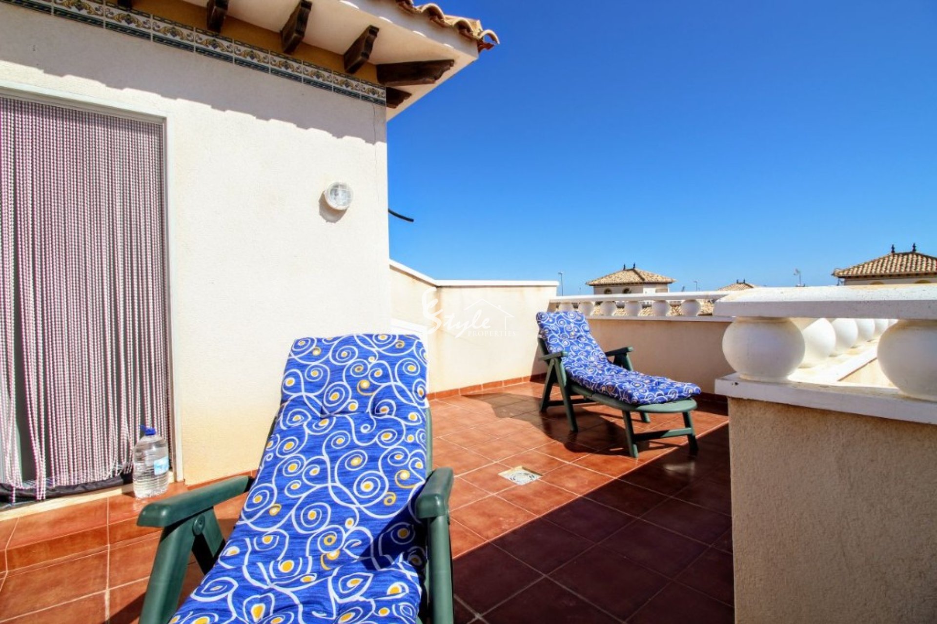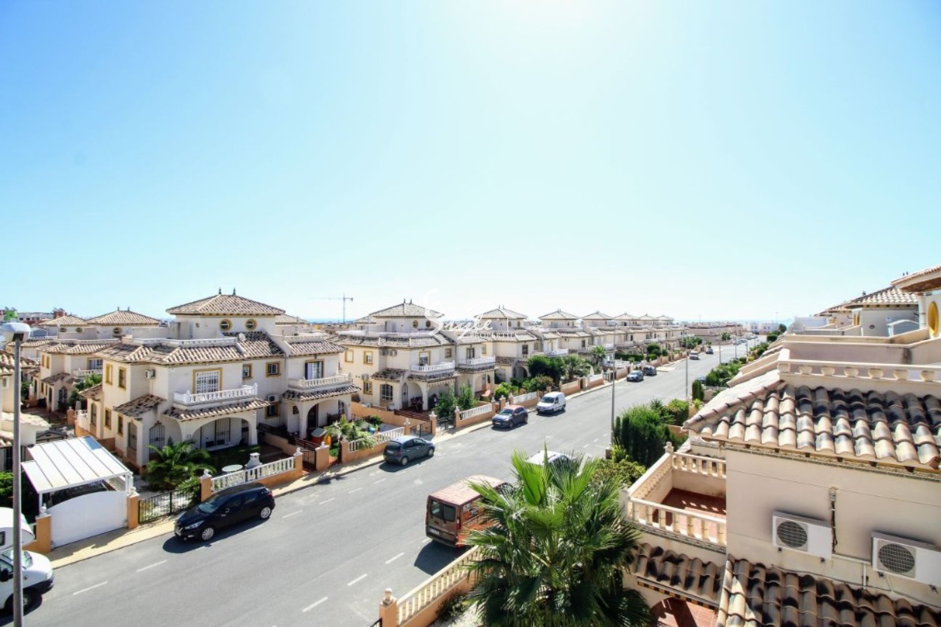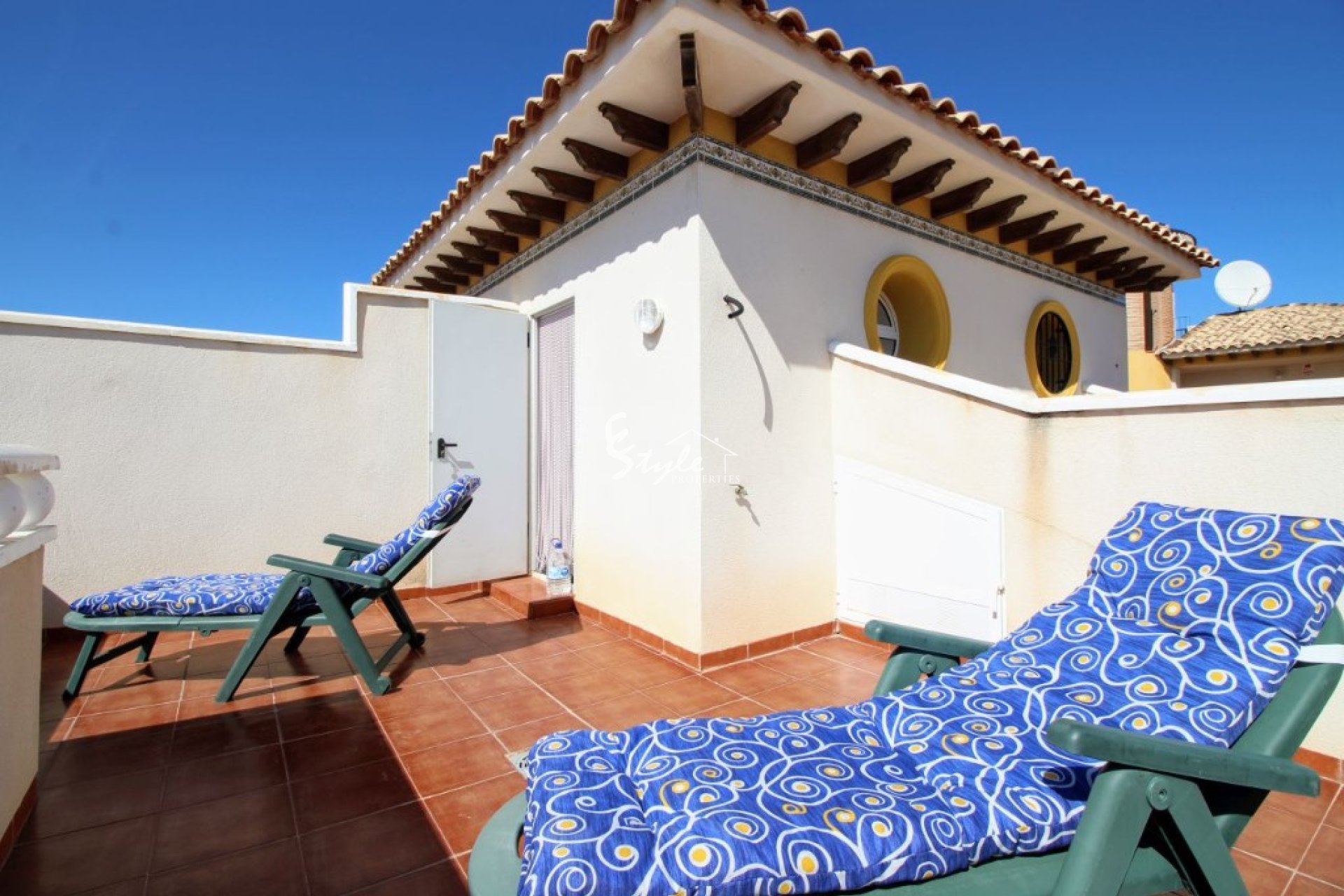 For sale quad townhouse, to spend the summer holidays or to enjoy the Mediterranean climate living all year round. Property located in one of the best urbanizations of Orihuela Costa with community pool and green areas, 3 km from the sea and the beaches in Cabo Roig. The house has a wonderful garden plo. The 90 m2 house has 2 bedrooms and 2 bathrooms, a separate kitchen, a living-dining room, solarium. Bedrooms with stunning views. The house is sold furnished. There is lots of tiled terrace and outdoor space and a huge private roof solarium to enjoy all day sunshine. Driveway for off road parking. There is a large gated beautiful communal garden and swimming pool area for residents and guests.